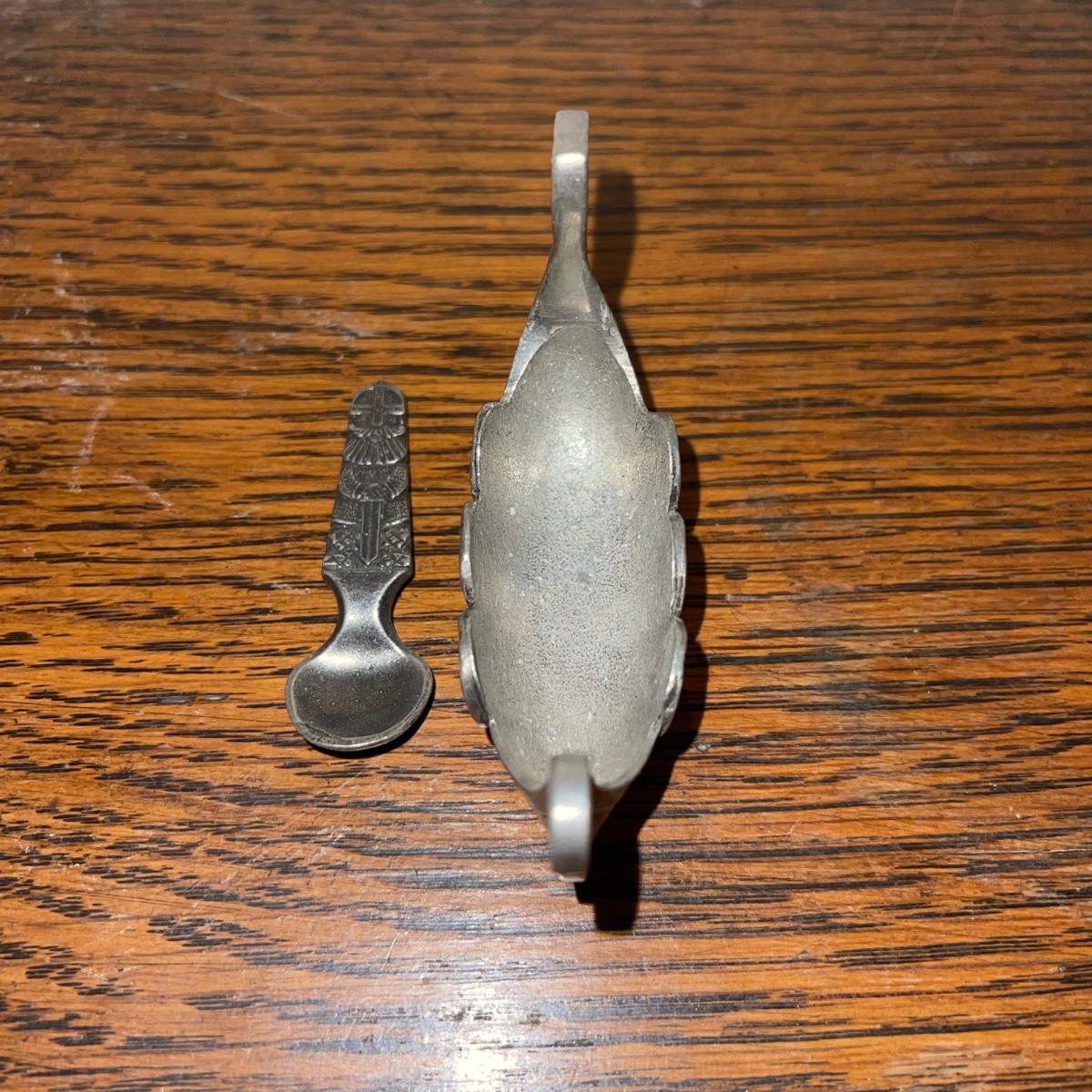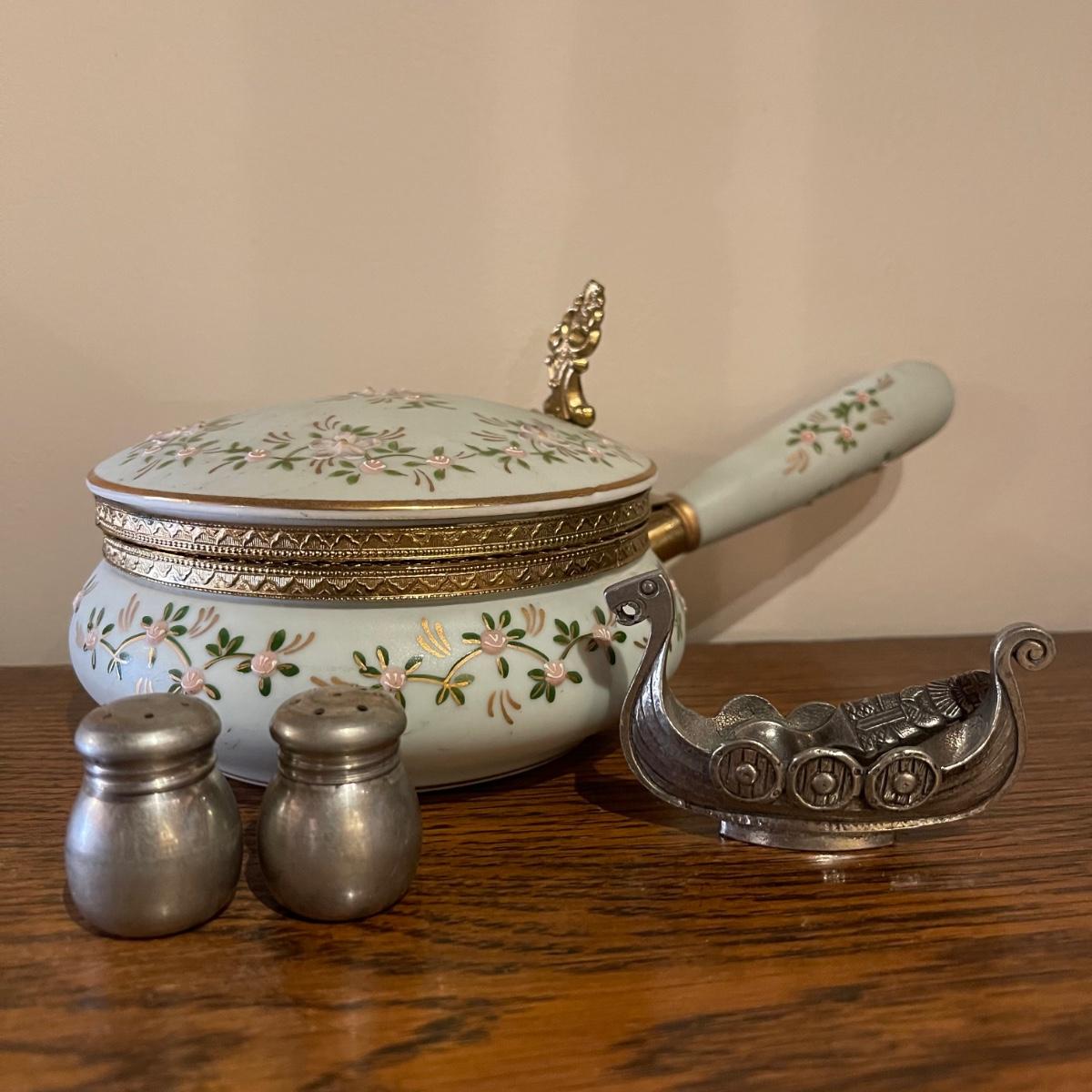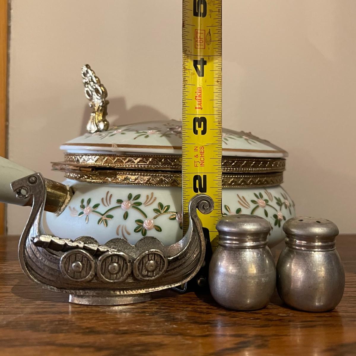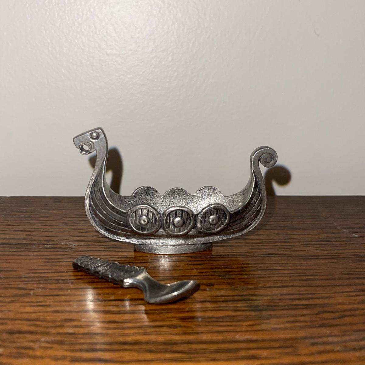 Items in this lot include a silent butler, miniature spoon and ship dish, and a set of salt and pepper shakers. The silent butler is ceramic and is decorated with hand-painted flowers, there is no signature. The small ship dish is a viking ship and has a tiny spoon to match. The underside of the ship says “Stopt Tinn Pewter” and “Tinn-per-norway” on both the ship and spoon. Lastly the two matching miniature salt and pepper shakers also have “pewter” on their undersides.