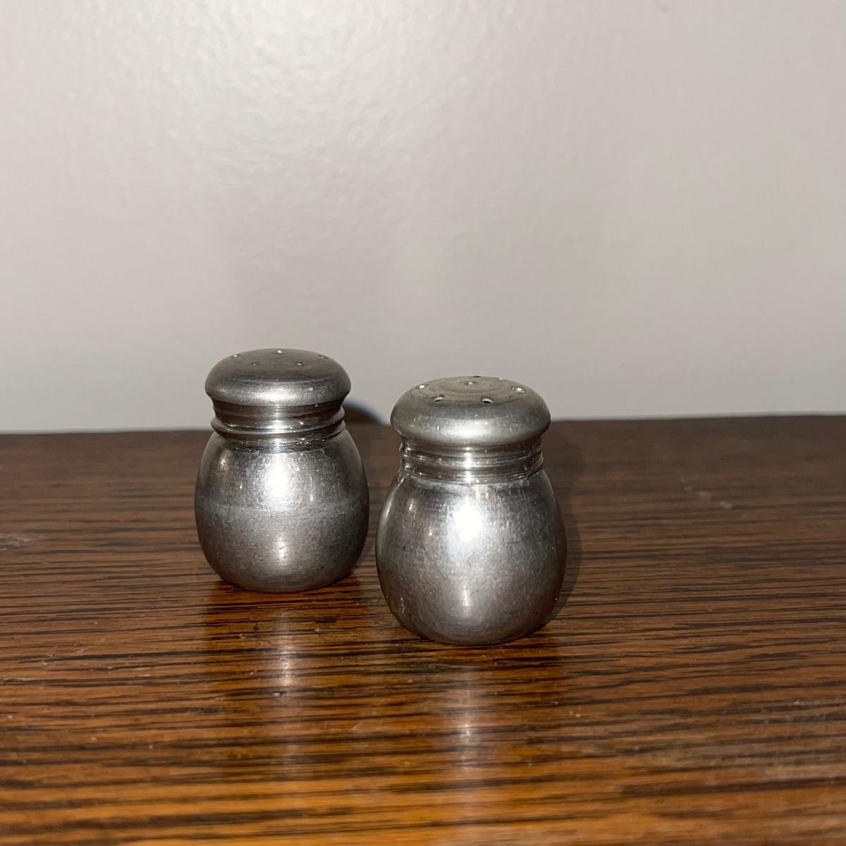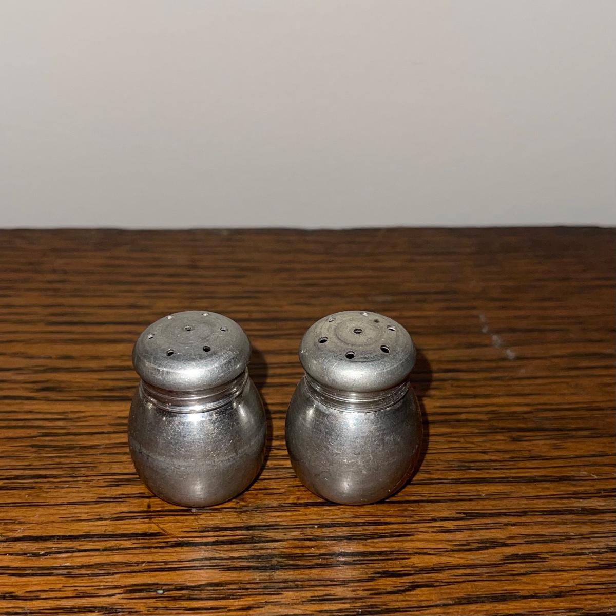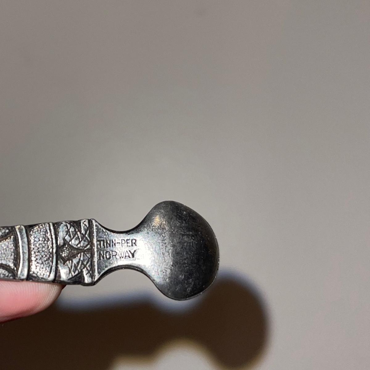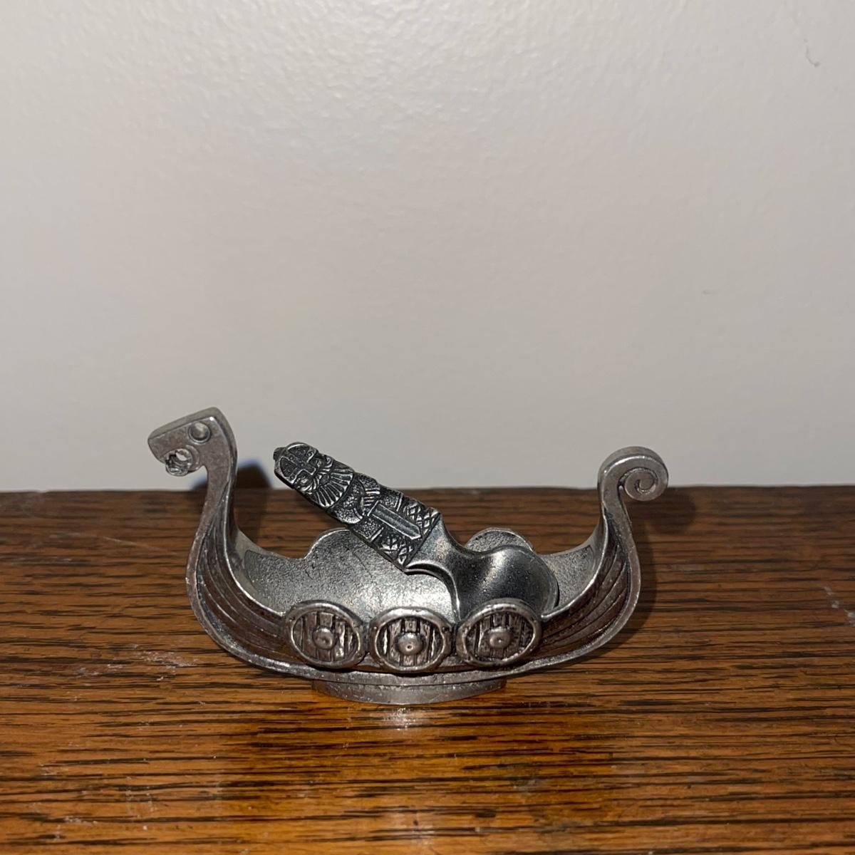 Items in this lot include a silent butler, miniature spoon and ship dish, and a set of salt and pepper shakers. The silent butler is ceramic and is decorated with hand-painted flowers, there is no signature. The small ship dish is a viking ship and has a tiny spoon to match. The underside of the ship says “Stopt Tinn Pewter” and “Tinn-per-norway” on both the ship and spoon. Lastly the two matching miniature salt and pepper shakers also have “pewter” on their undersides.