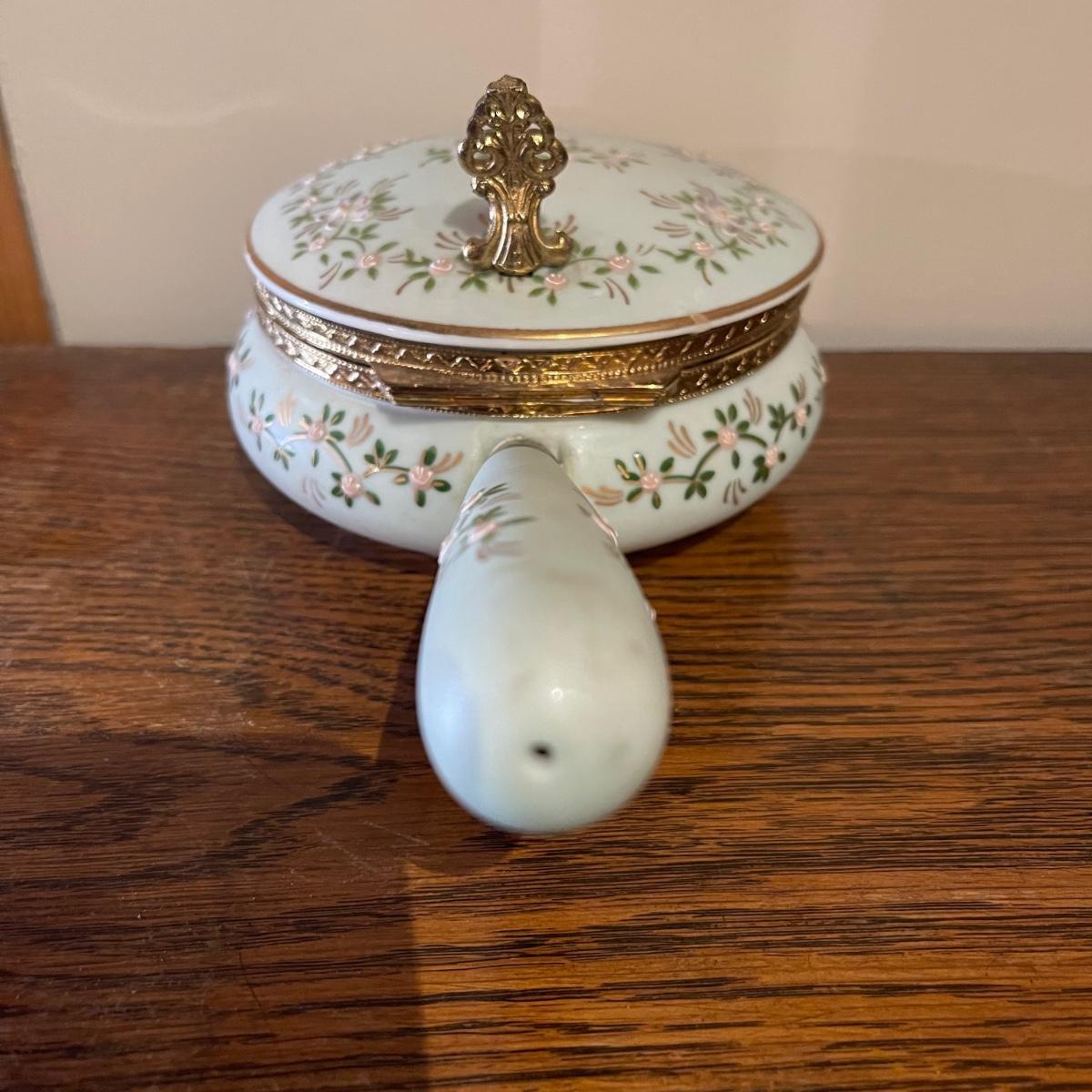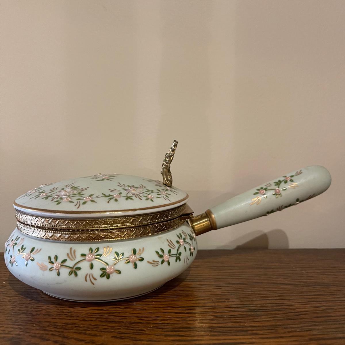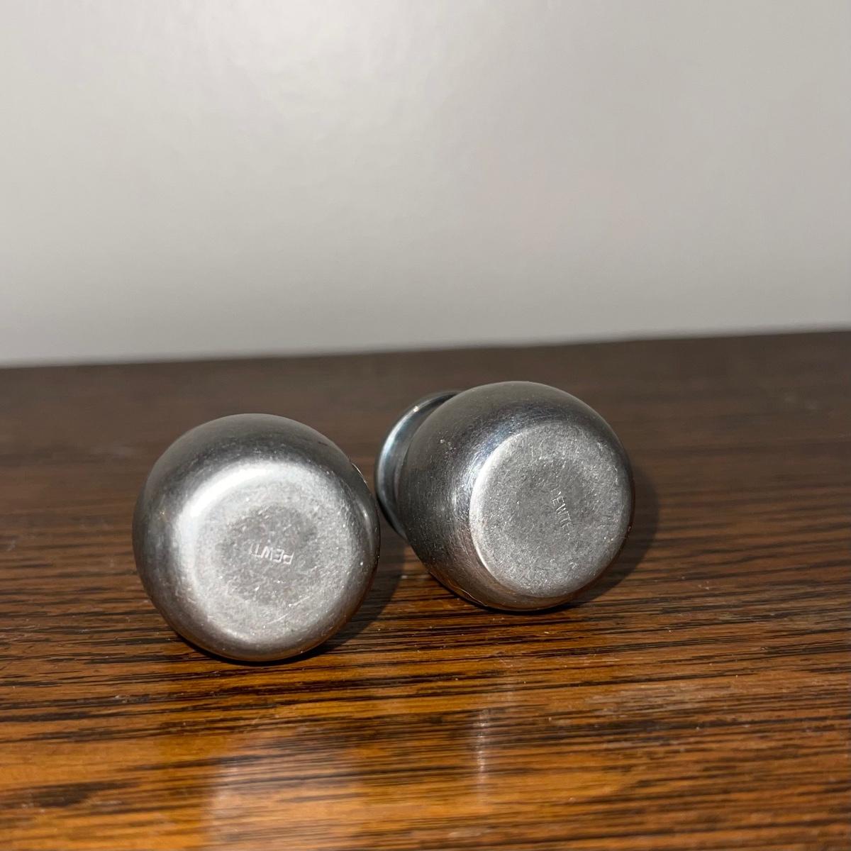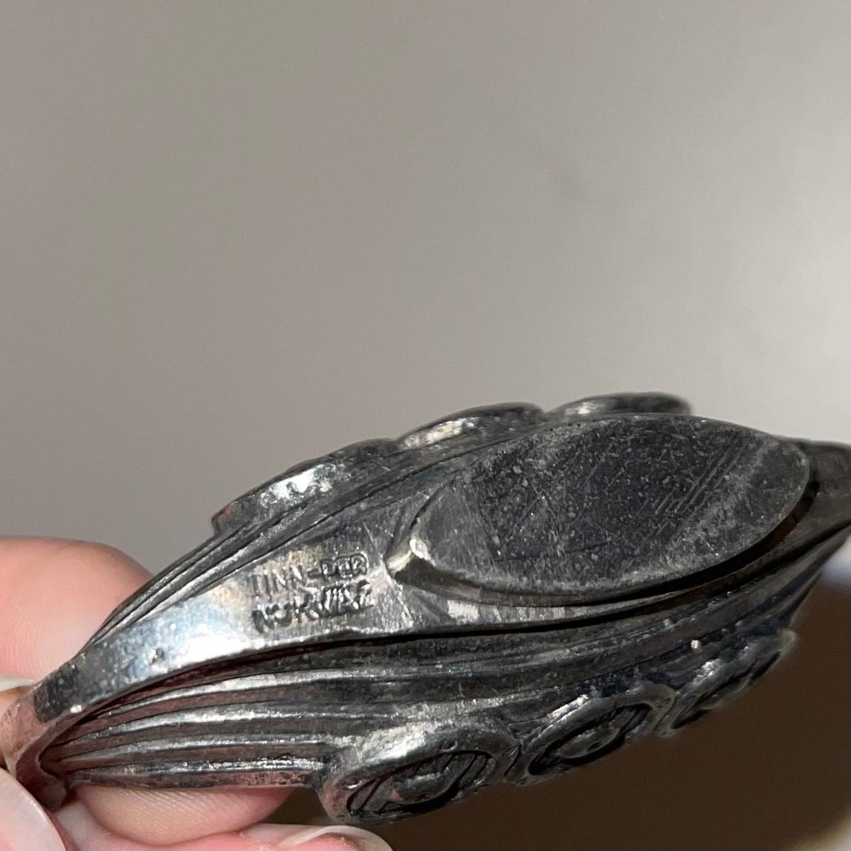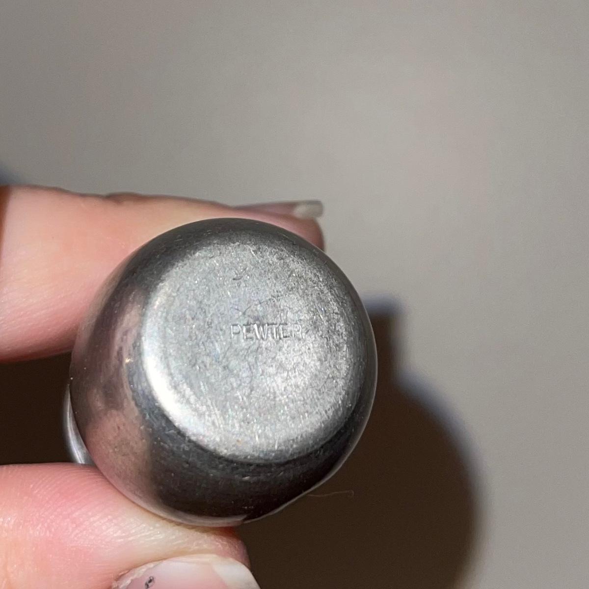 Items in this lot include a silent butler, miniature spoon and ship dish, and a set of salt and pepper shakers. The silent butler is ceramic and is decorated with hand-painted flowers, there is no signature. The small ship dish is a viking ship and has a tiny spoon to match. The underside of the ship says “Stopt Tinn Pewter” and “Tinn-per-norway” on both the ship and spoon. Lastly the two matching miniature salt and pepper shakers also have “pewter” on their undersides.