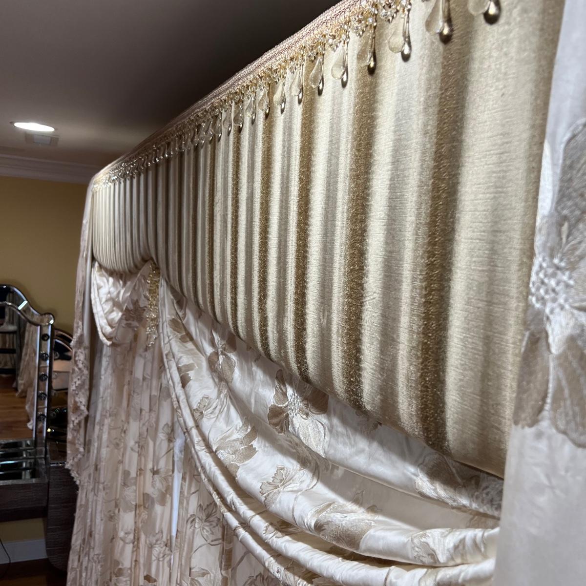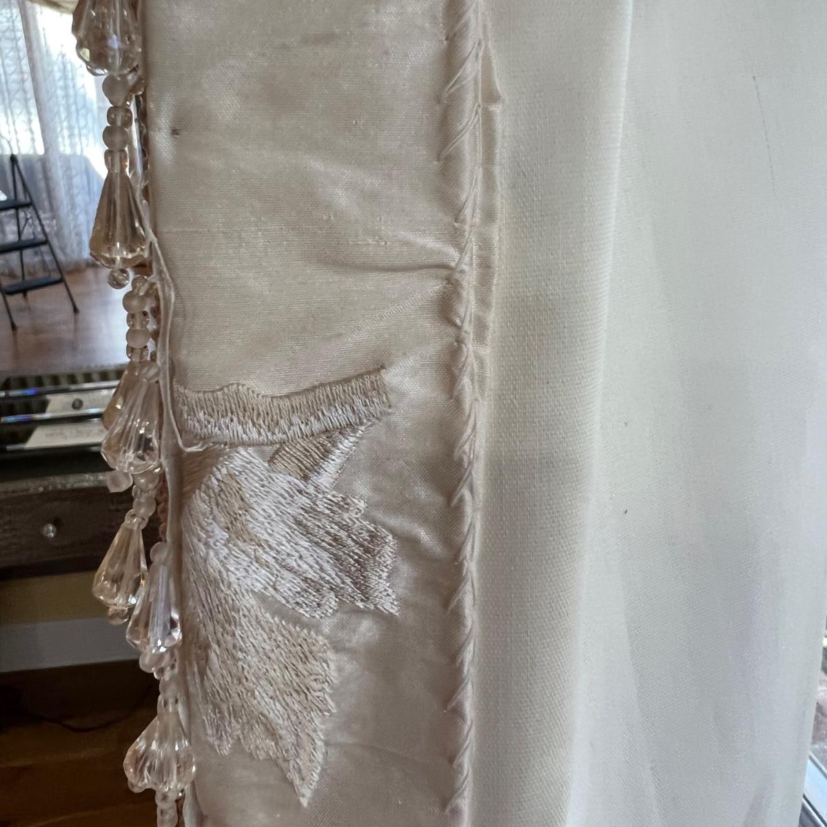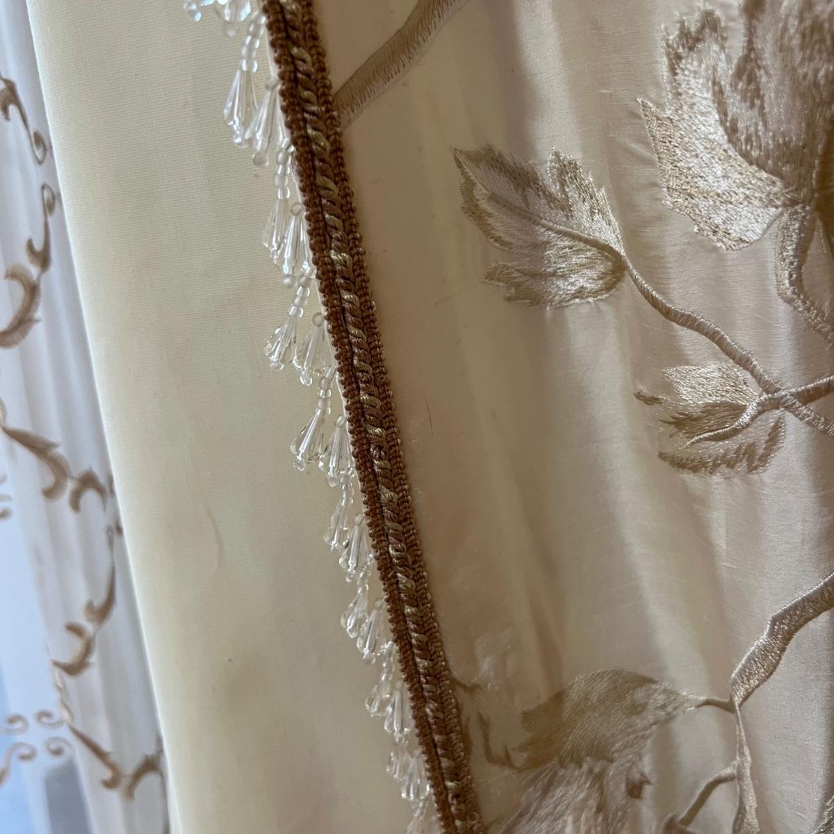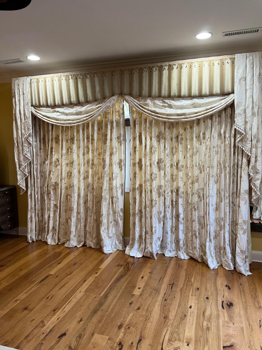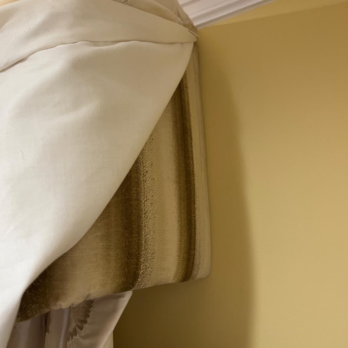 Beautiful cream drapes appear to be silk. Hand stitched and lined. The first set is two panels, each one 14 yards of fabric wide by 100” tall. Two finial “curtain hold-back” ornamental crystal-like hardware included. Second set includes sheets and two panels each 12 yards wide and 100” tall. Notice all ornamental beaded accents and trim. No signs of stains observed. Hard cornice is covered in complementary velvet and measures 12”deep (away from the mounting on the wall) and 18” tall/wide. The side decorative triangle shape cloth is 72” long. All hardware on both sets, rods, valences and brackets included. The winning bidder will be responsible for taking this down, including disconnecting the hardware.