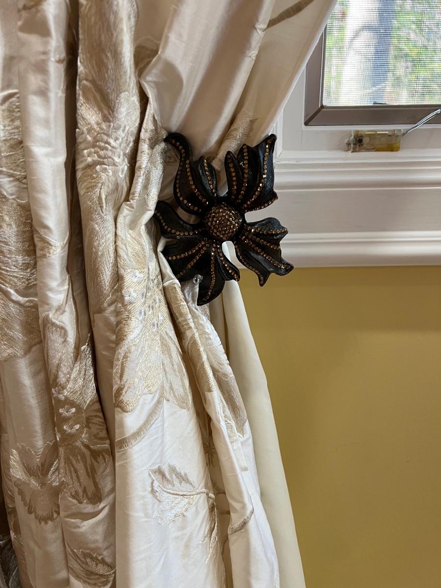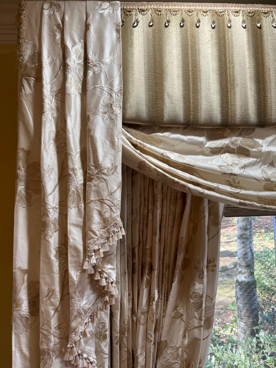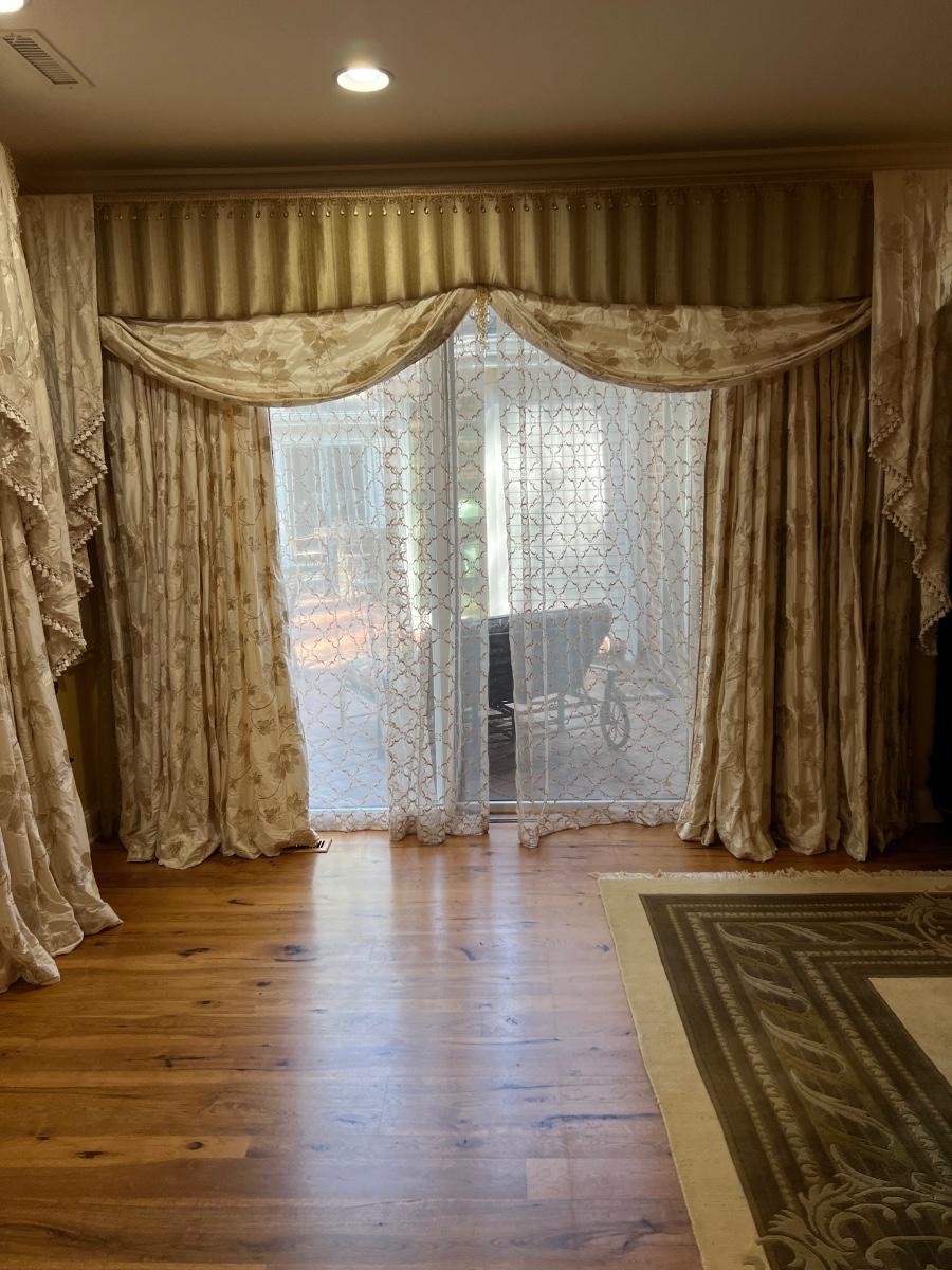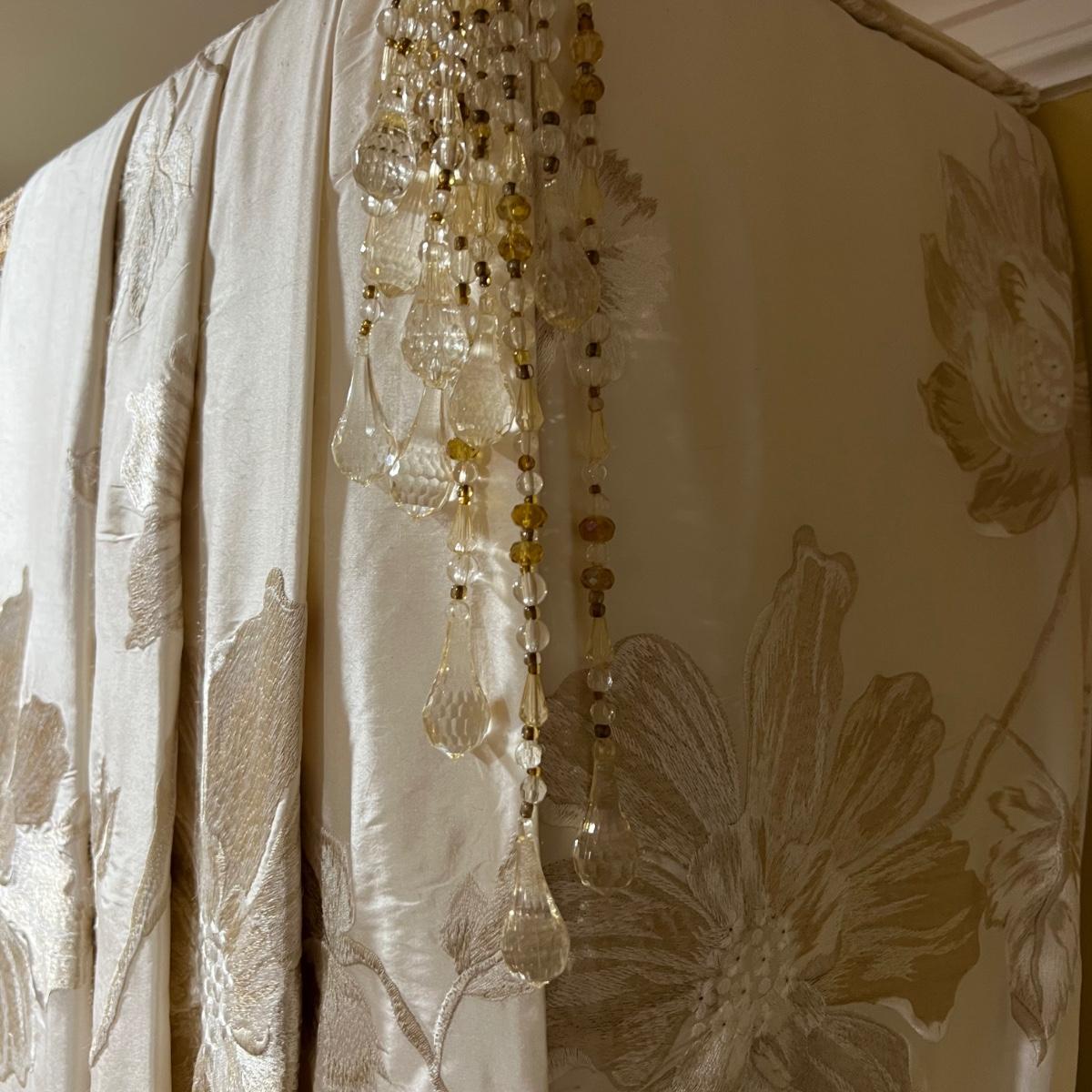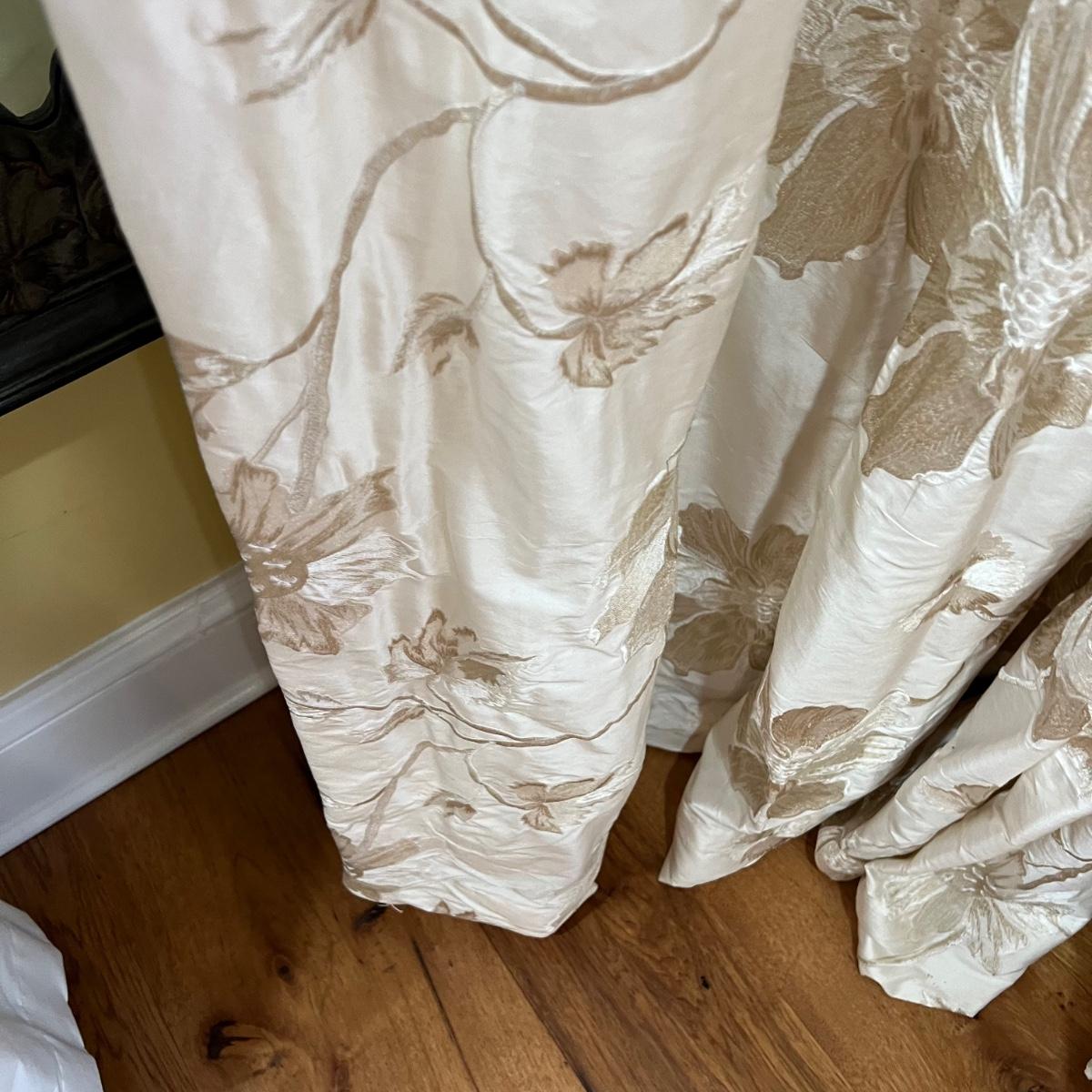 Beautiful cream drapes appear to be silk. Hand stitched and lined. The first set is two panels, each one 14 yards of fabric wide by 100” tall. Two finial “curtain hold-back” ornamental crystal-like hardware included. Second set includes sheets and two panels each 12 yards wide and 100” tall. Notice all ornamental beaded accents and trim. No signs of stains observed. Hard cornice is covered in complementary velvet and measures 12”deep (away from the mounting on the wall) and 18” tall/wide. The side decorative triangle shape cloth is 72” long. All hardware on both sets, rods, valences and brackets included. The winning bidder will be responsible for taking this down, including disconnecting the hardware.