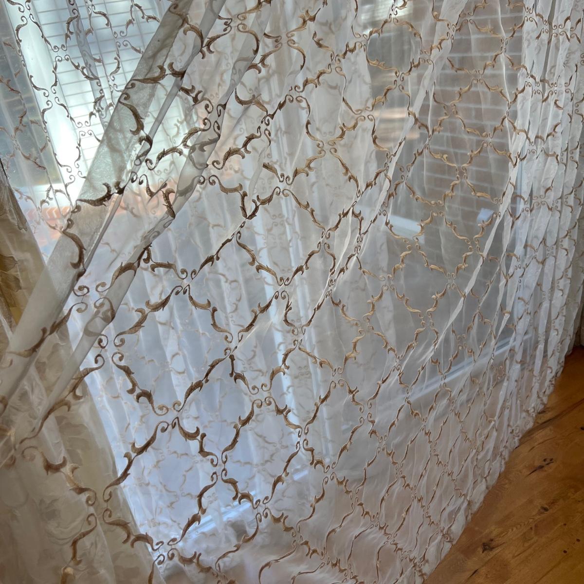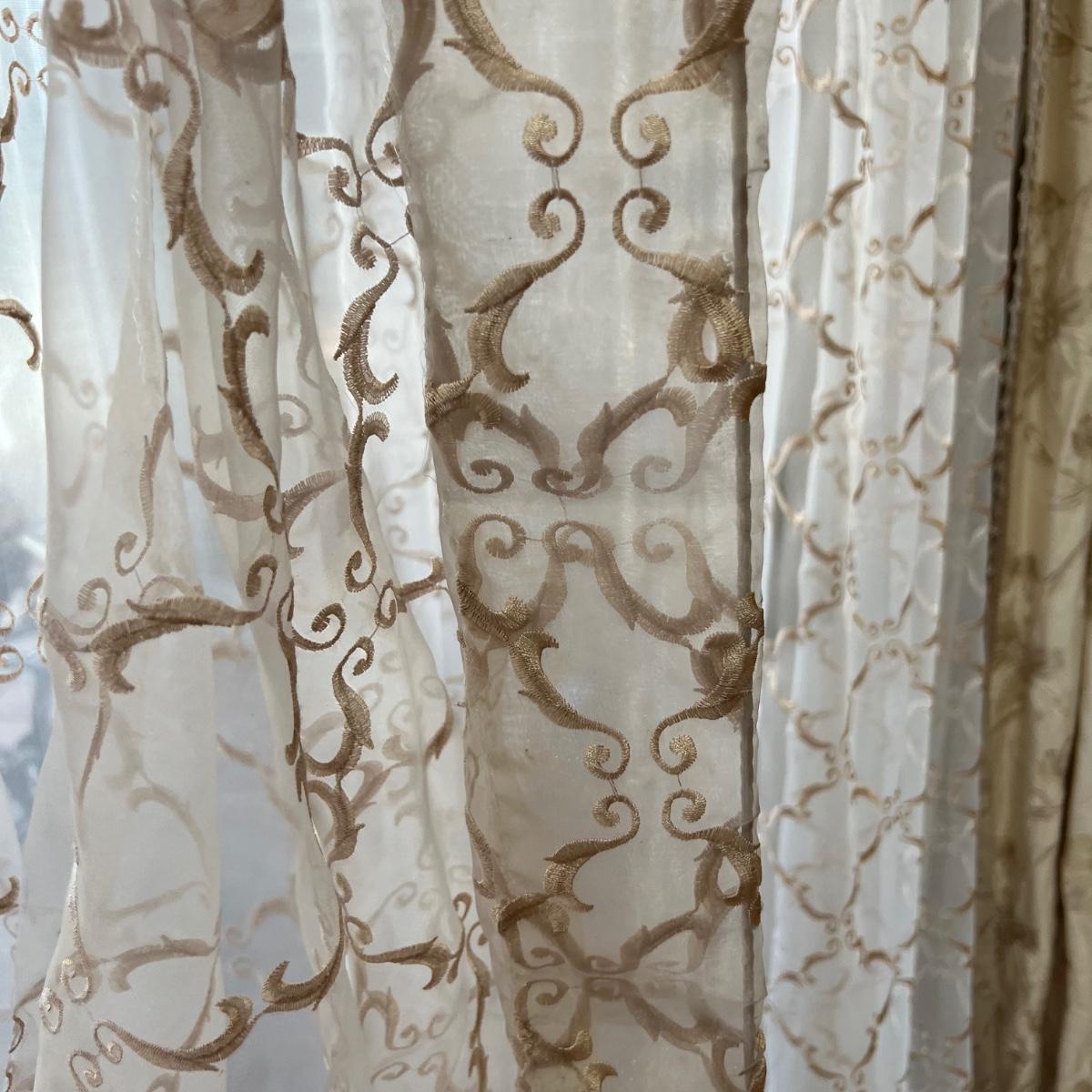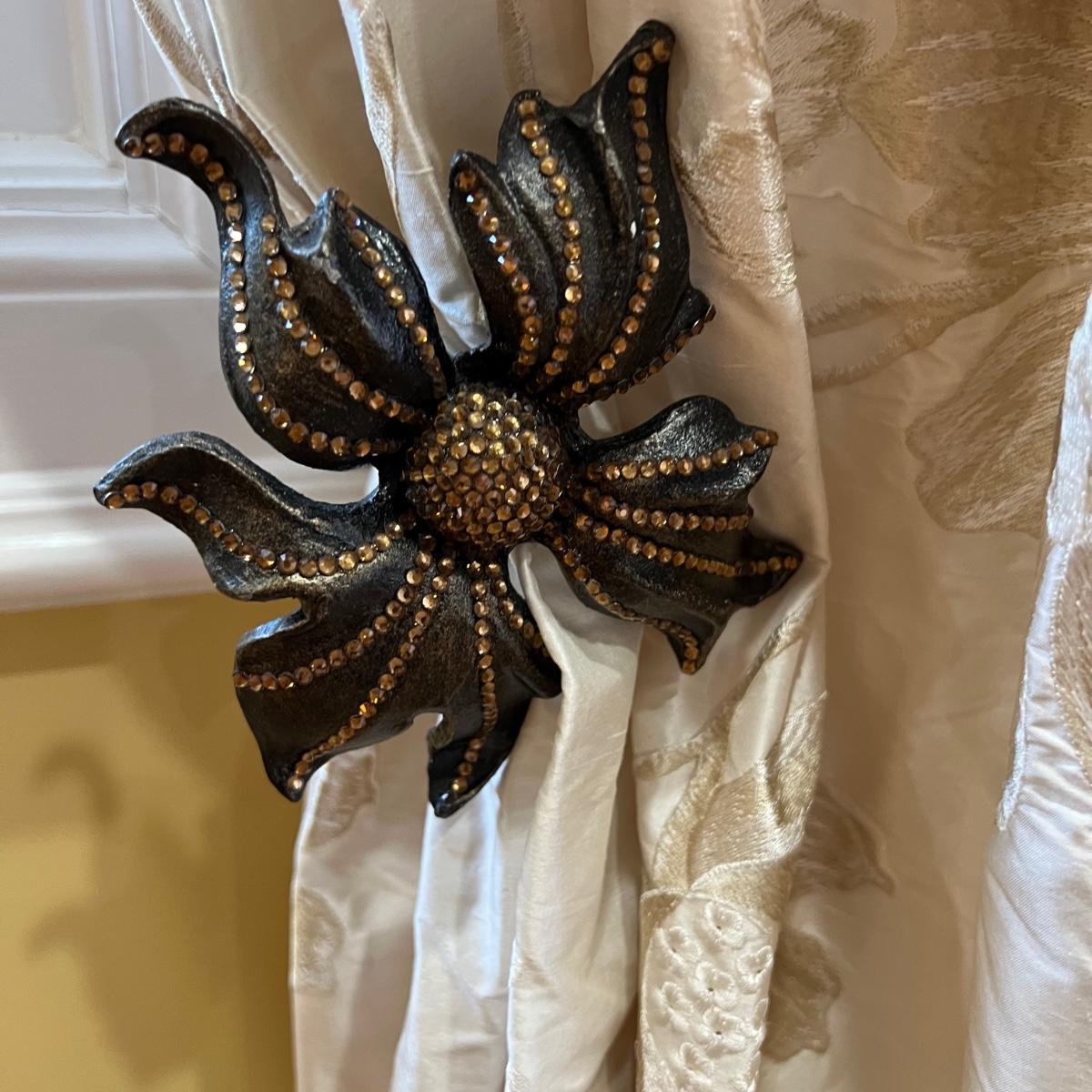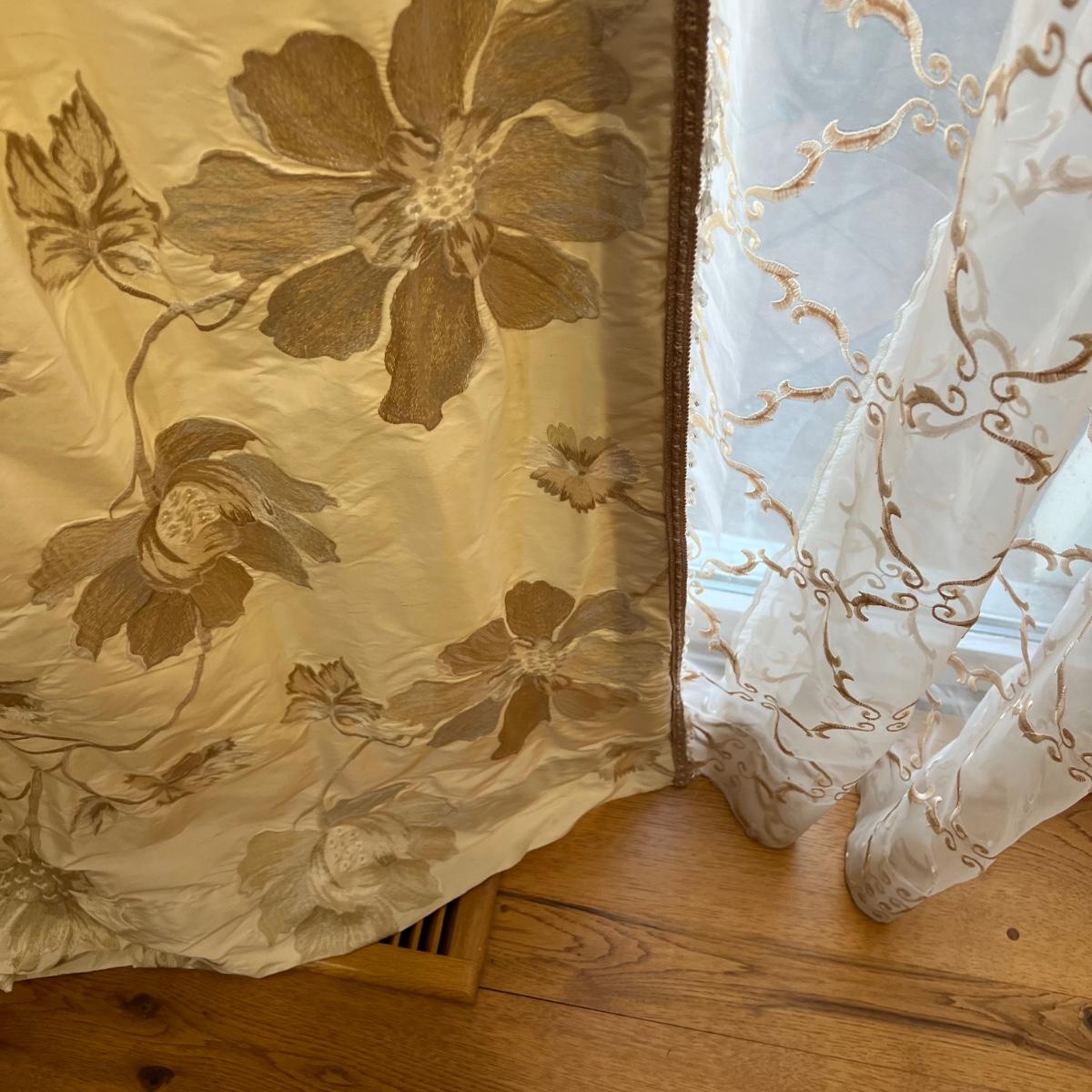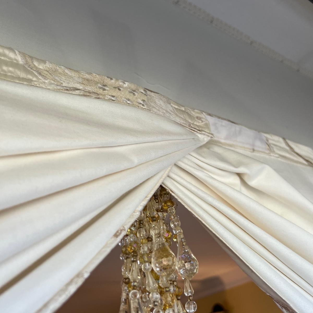 Beautiful cream drapes appear to be silk. Hand stitched and lined. The first set is two panels, each one 14 yards of fabric wide by 100” tall. Two finial “curtain hold-back” ornamental crystal-like hardware included. Second set includes sheets and two panels each 12 yards wide and 100” tall. Notice all ornamental beaded accents and trim. No signs of stains observed. Hard cornice is covered in complementary velvet and measures 12”deep (away from the mounting on the wall) and 18” tall/wide. The side decorative triangle shape cloth is 72” long. All hardware on both sets, rods, valences and brackets included. The winning bidder will be responsible for taking this down, including disconnecting the hardware.