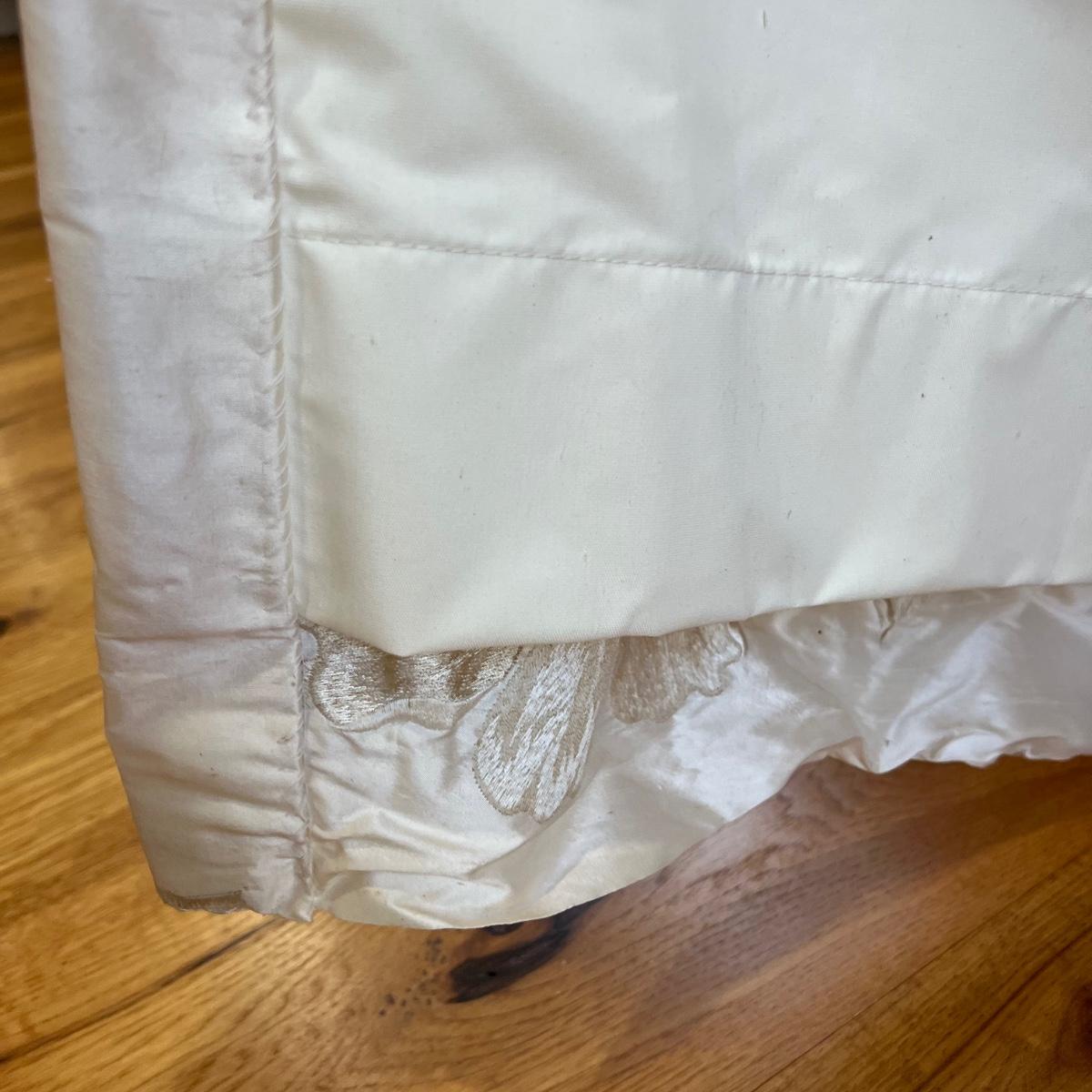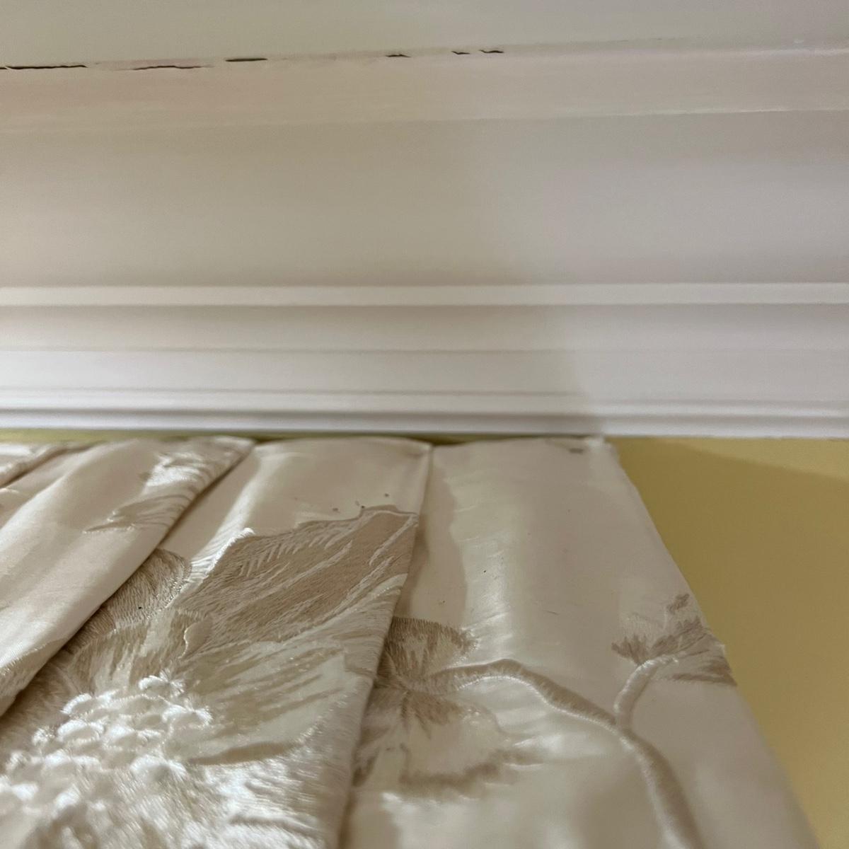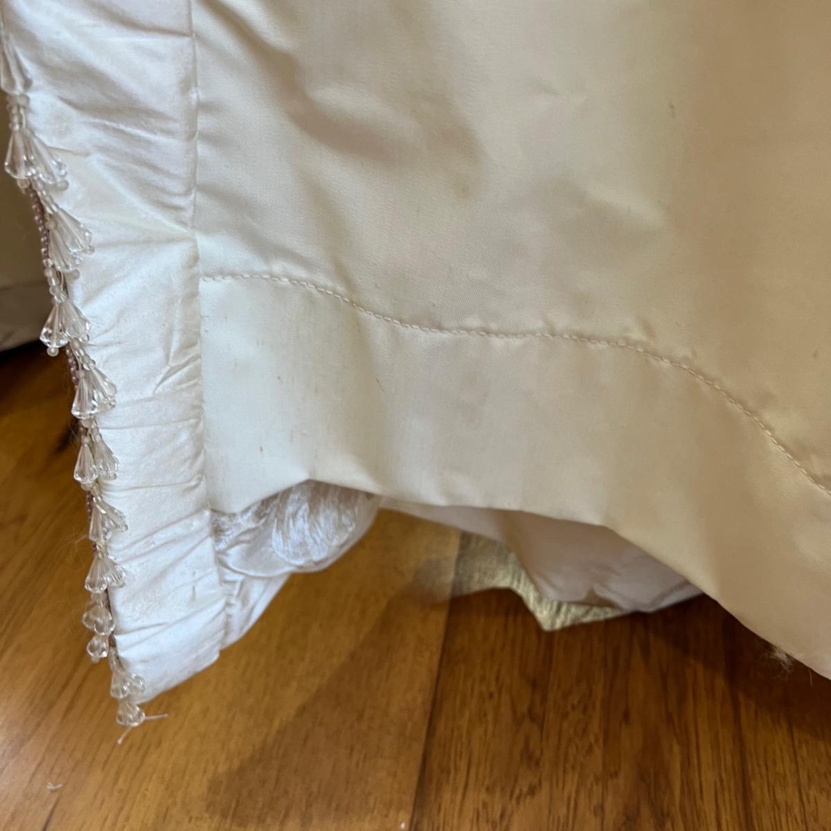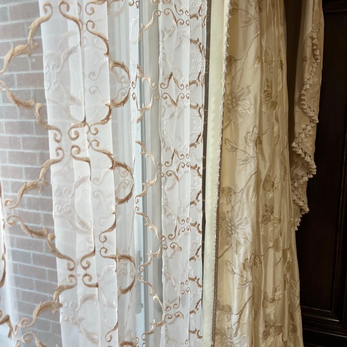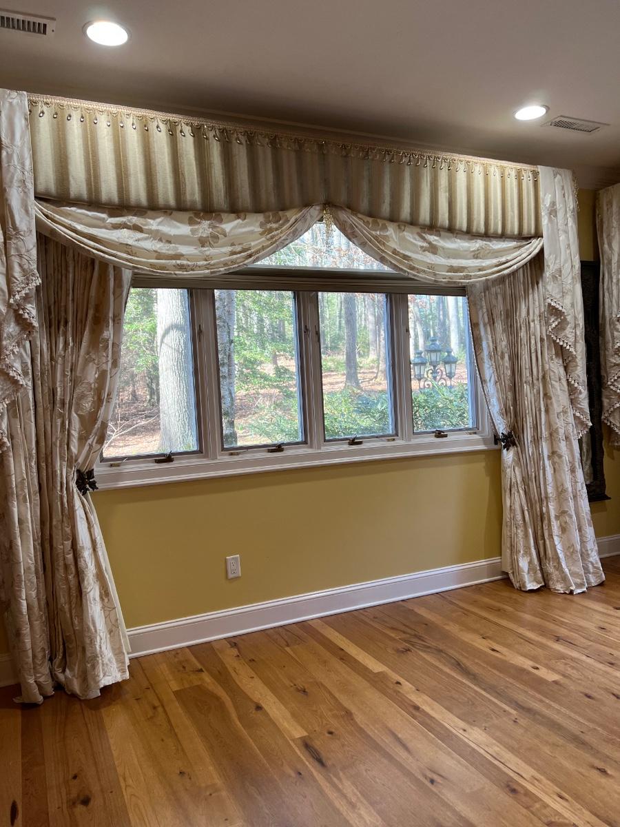 Beautiful cream drapes appear to be silk. Hand stitched and lined. The first set is two panels, each one 14 yards of fabric wide by 100” tall. Two finial “curtain hold-back” ornamental crystal-like hardware included. Second set includes sheets and two panels each 12 yards wide and 100” tall. Notice all ornamental beaded accents and trim. No signs of stains observed. Hard cornice is covered in complementary velvet and measures 12”deep (away from the mounting on the wall) and 18” tall/wide. The side decorative triangle shape cloth is 72” long. All hardware on both sets, rods, valences and brackets included. The winning bidder will be responsible for taking this down, including disconnecting the hardware.