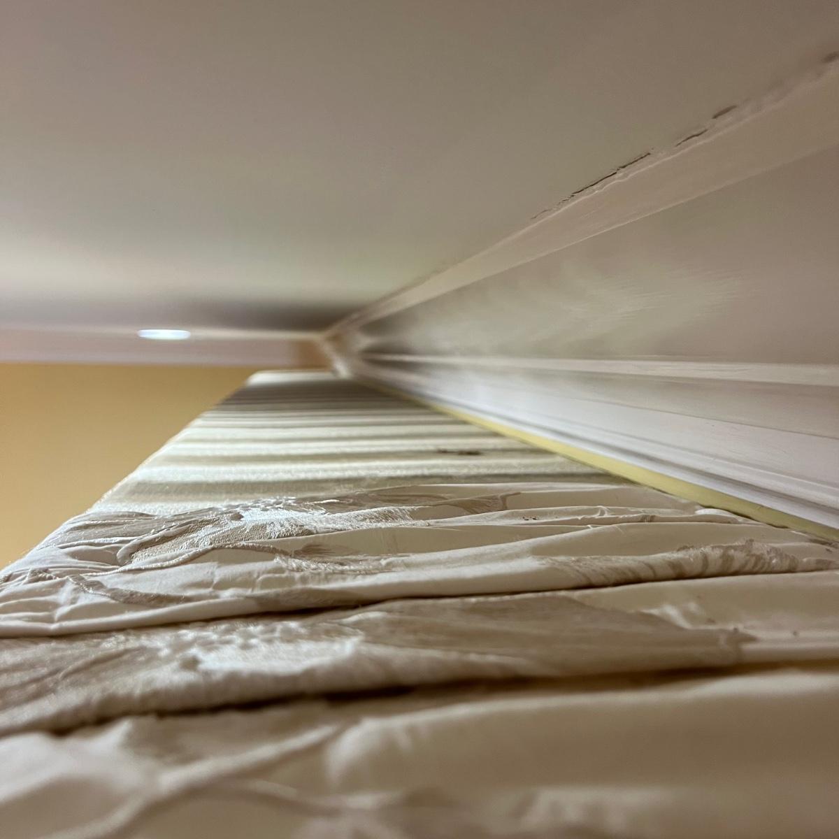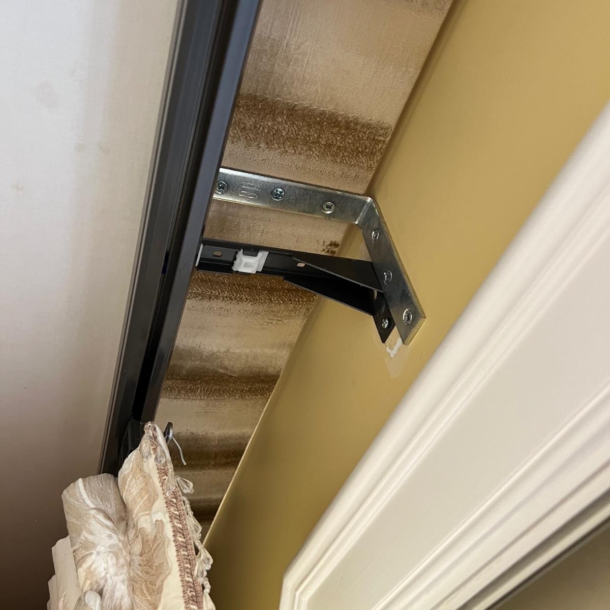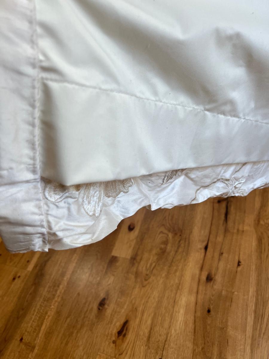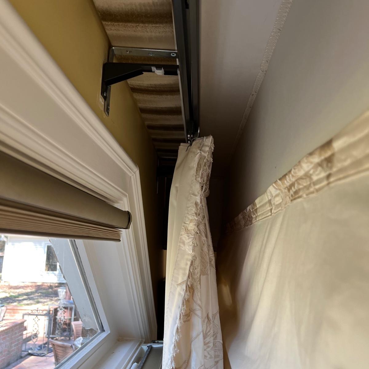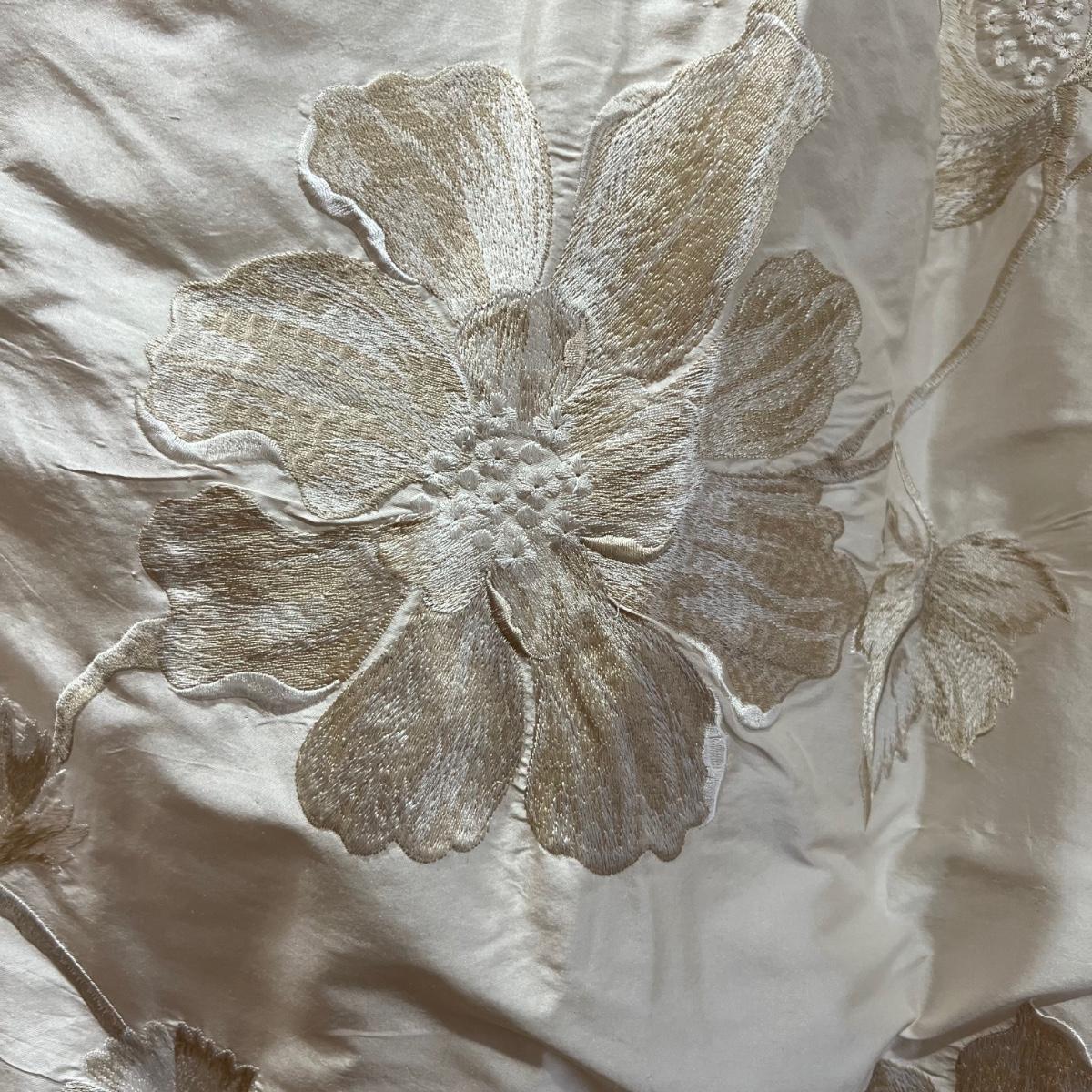 Beautiful cream drapes appear to be silk. Hand stitched and lined. The first set is two panels, each one 14 yards of fabric wide by 100” tall. Two finial “curtain hold-back” ornamental crystal-like hardware included. Second set includes sheets and two panels each 12 yards wide and 100” tall. Notice all ornamental beaded accents and trim. No signs of stains observed. Hard cornice is covered in complementary velvet and measures 12”deep (away from the mounting on the wall) and 18” tall/wide. The side decorative triangle shape cloth is 72” long. All hardware on both sets, rods, valences and brackets included. The winning bidder will be responsible for taking this down, including disconnecting the hardware.
