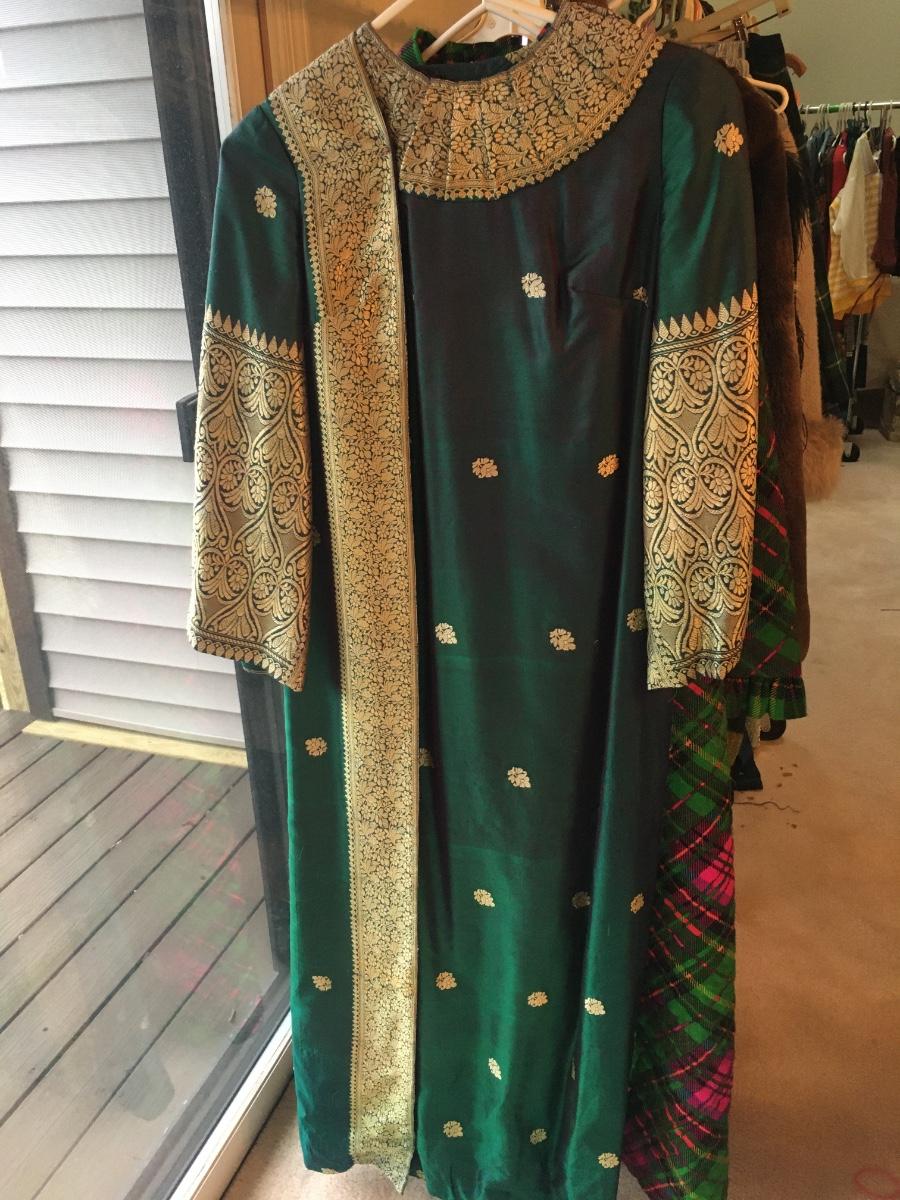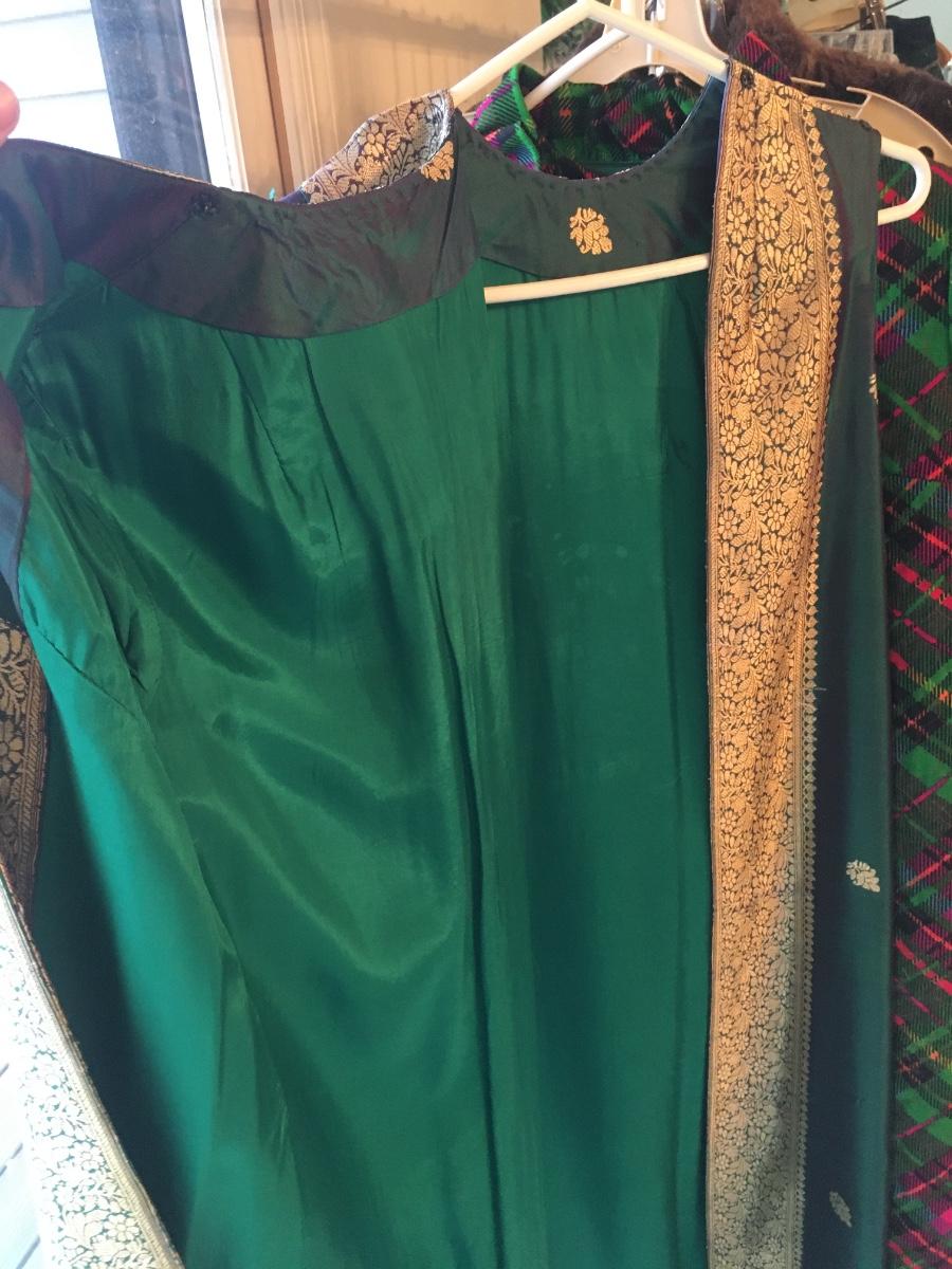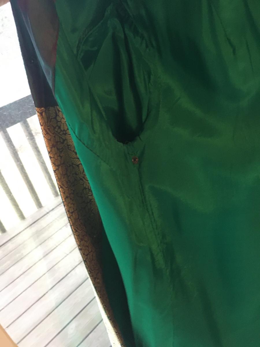 Sloor length dress snaps at neckline and shoulder. Fully lined. Luxurious feel.