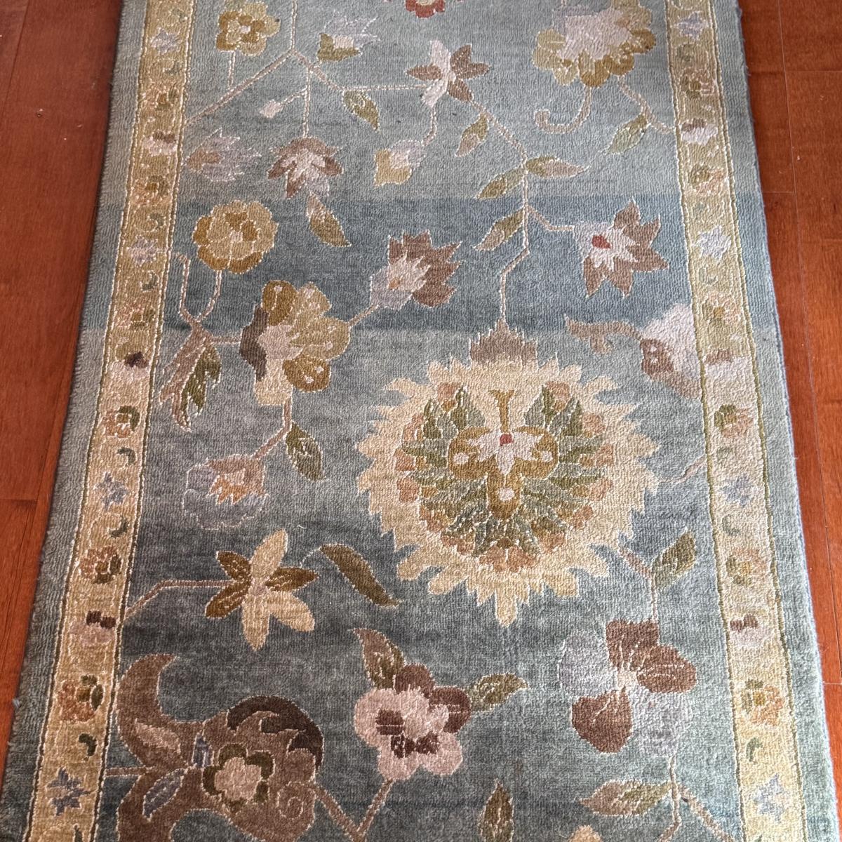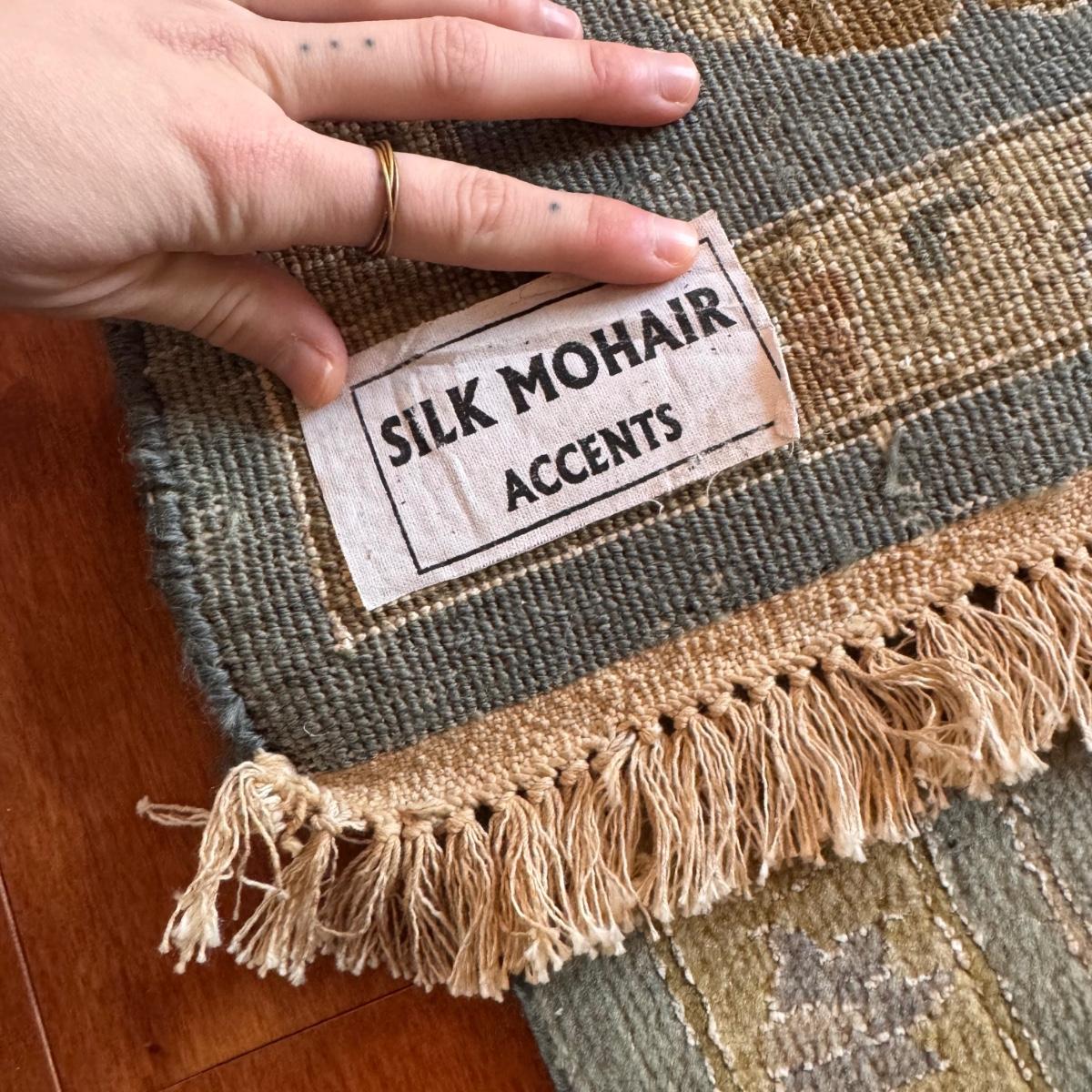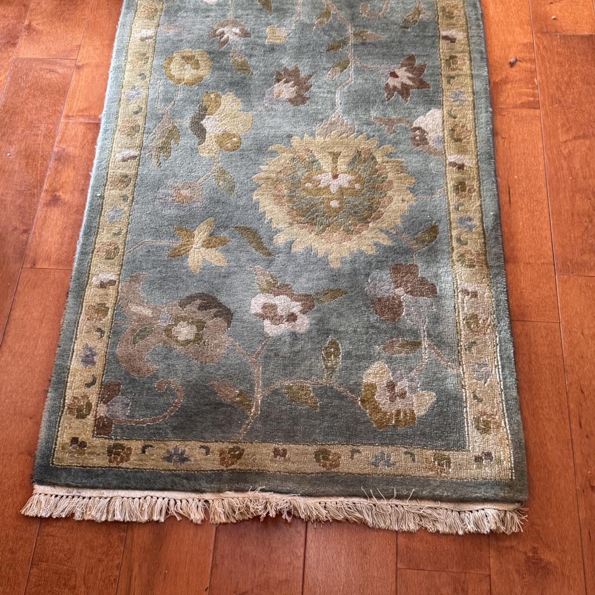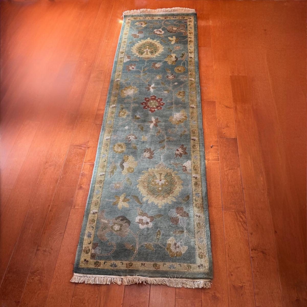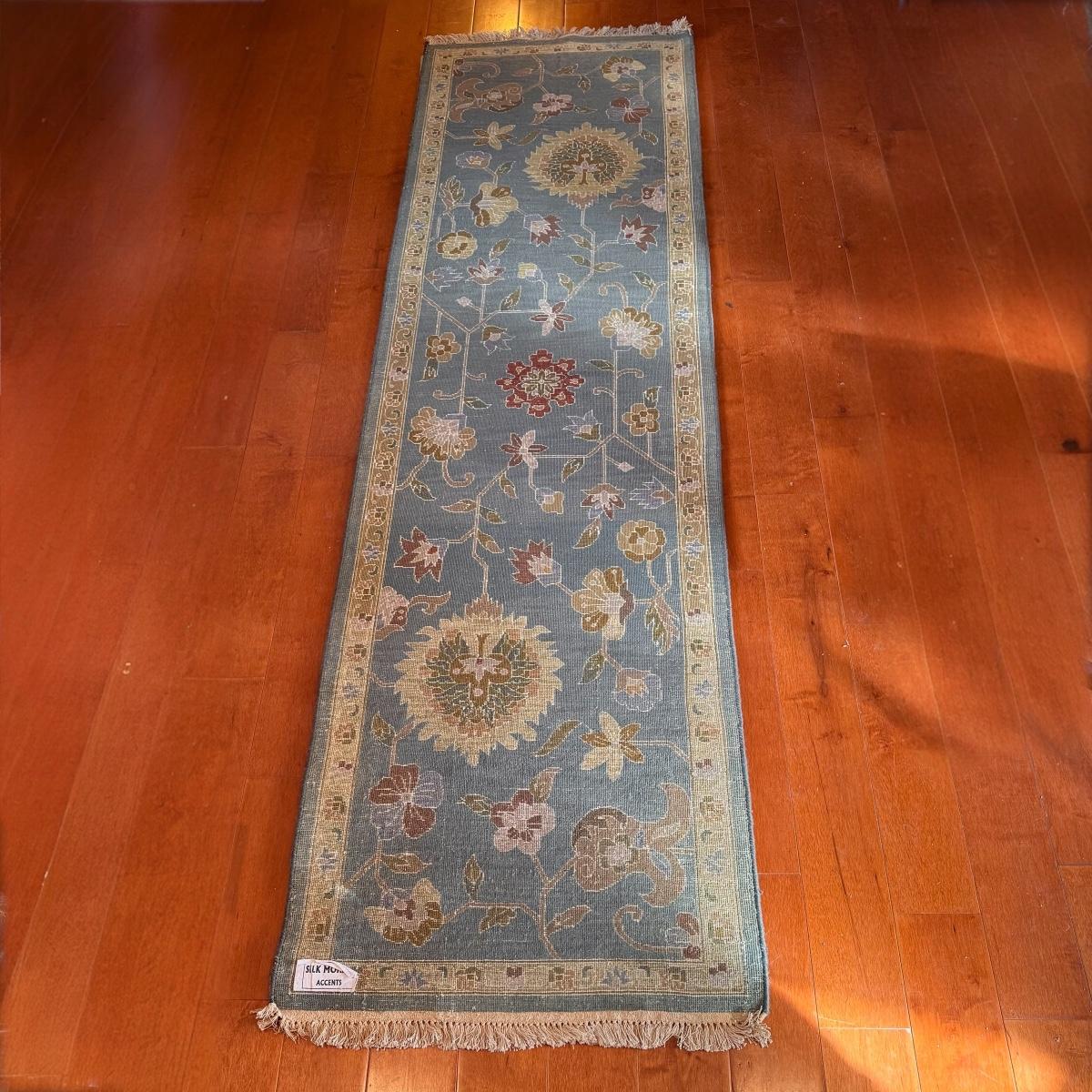 Lot includes one gorgeous blue with hints of earth tones runner rug. The rug has a tag on the backside that reads Silk Mohair Accents. The rug measures 2'4” x 8’3”. Shipping available. Shipping can be costly. We suggest contacting our preferred local shipping provider, Postage Express, with dimensions and getting an estimate before bidding: (828) 255-9250 or shipping@postageexpressnc.com.