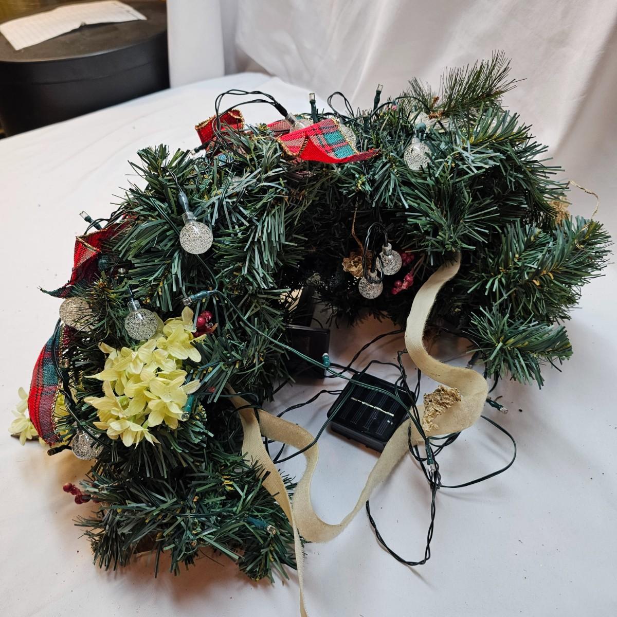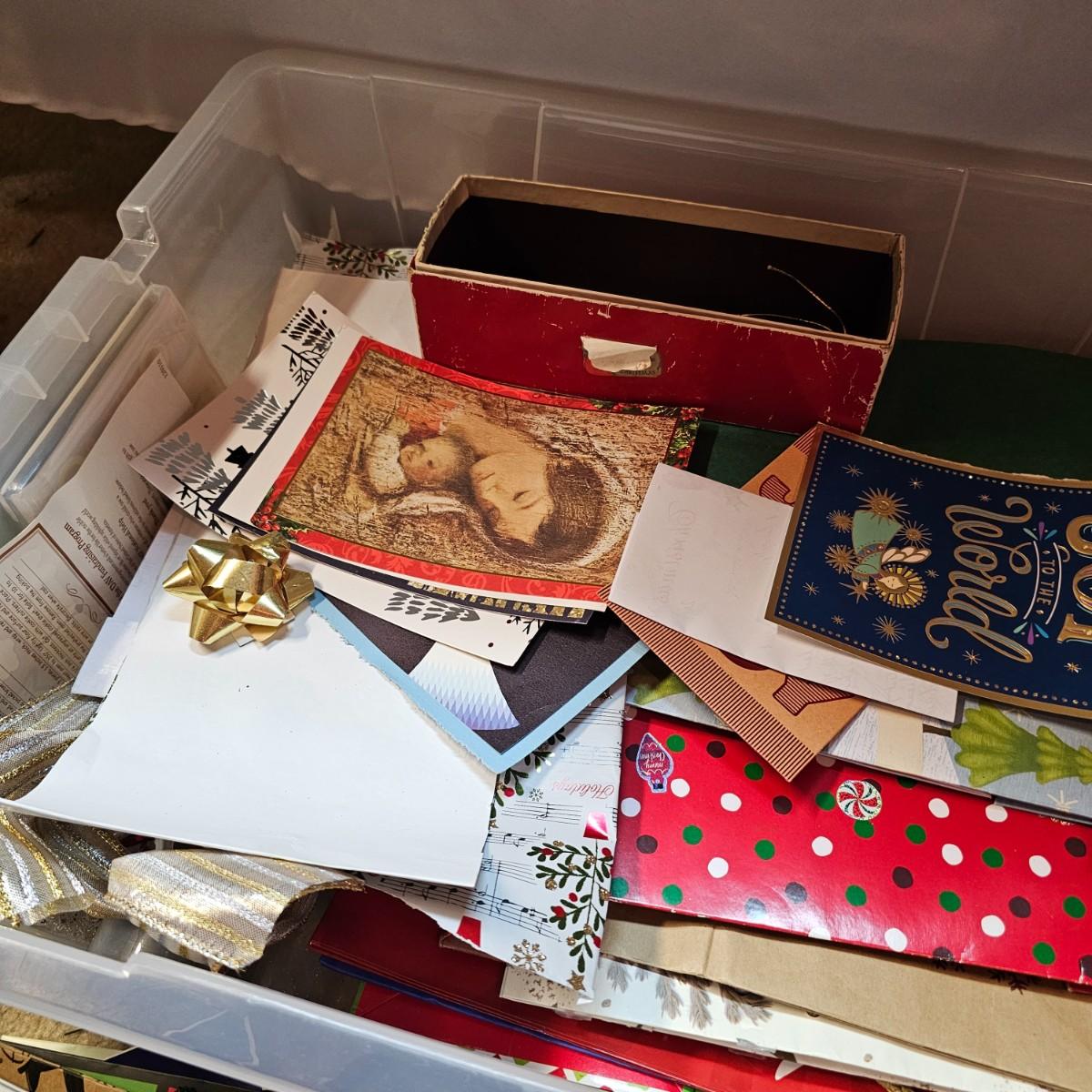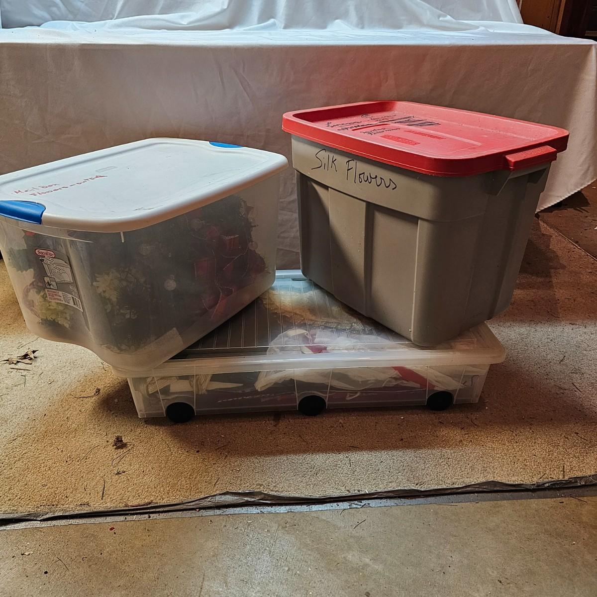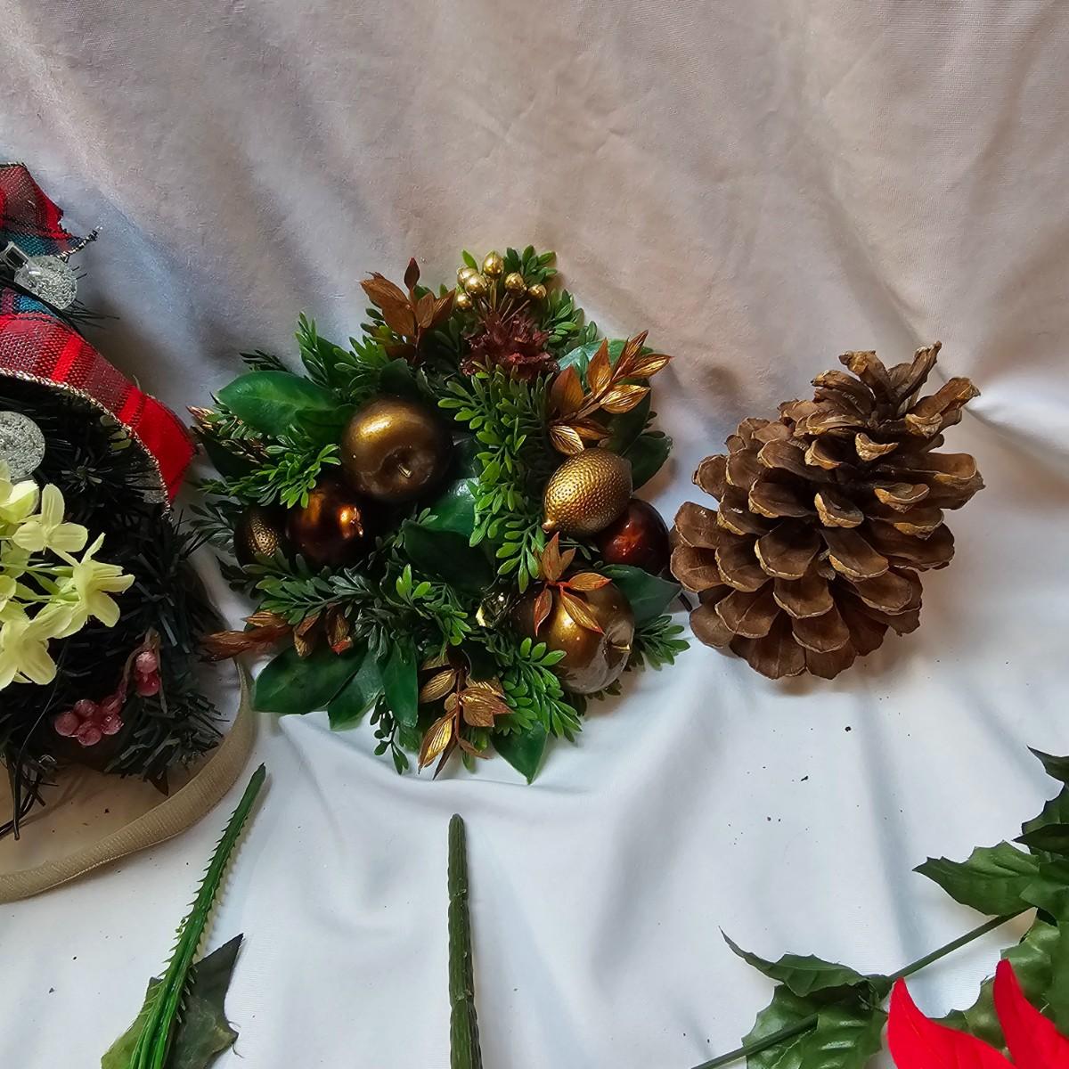 Decorative stems for indoors or out. Over two dozen pieces of poinsettia, ivy, holly & berries. Also includes loose pine cones and a mailbox piece with solar lights. Unable to test lights. Wrapping items include paper, bags, tags and more. Storage containers included, see photos for details. Local pickup only.