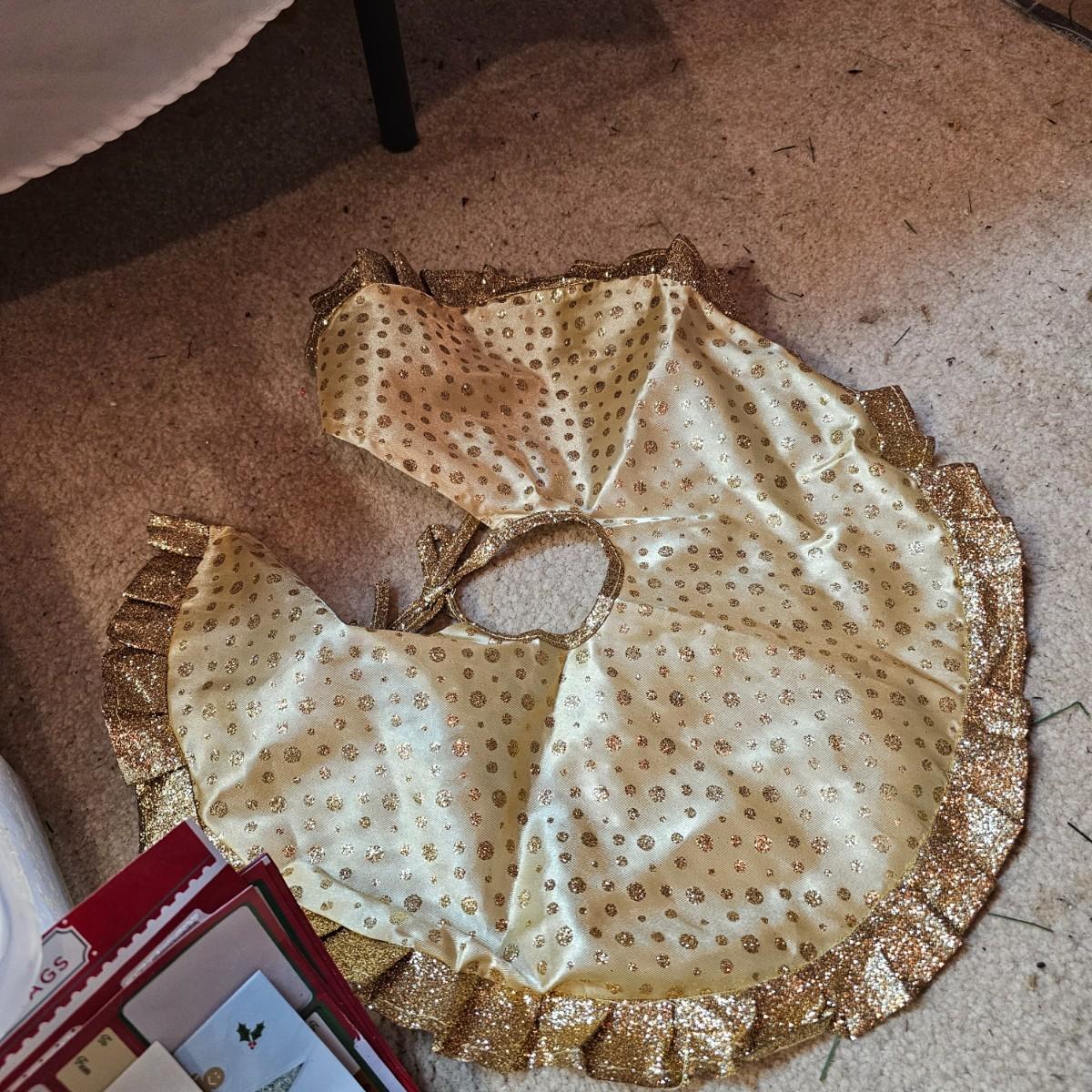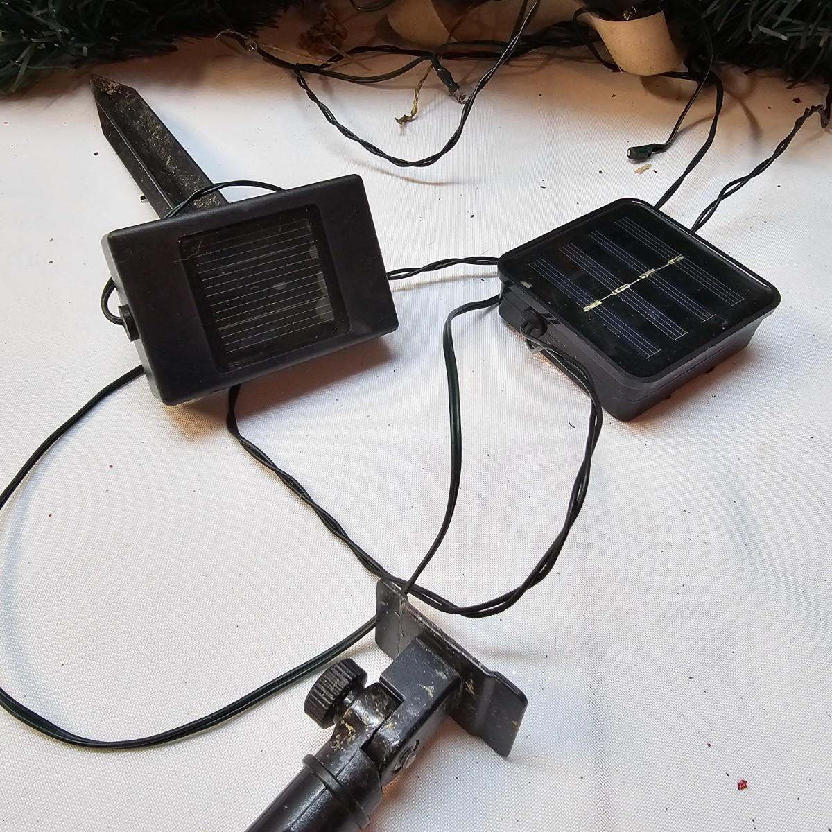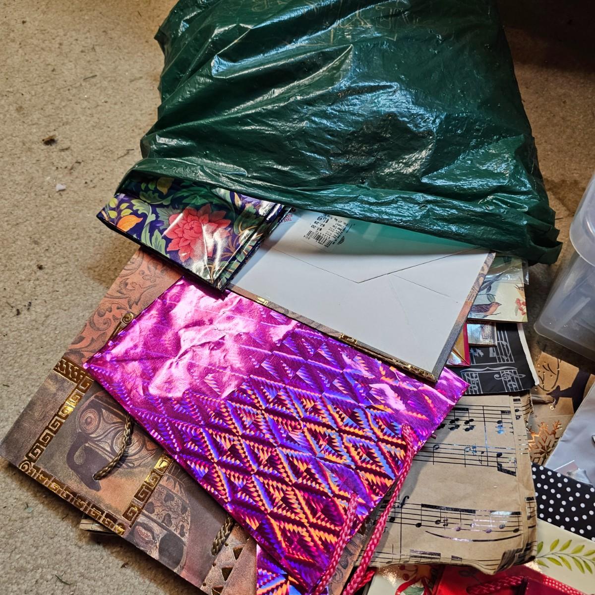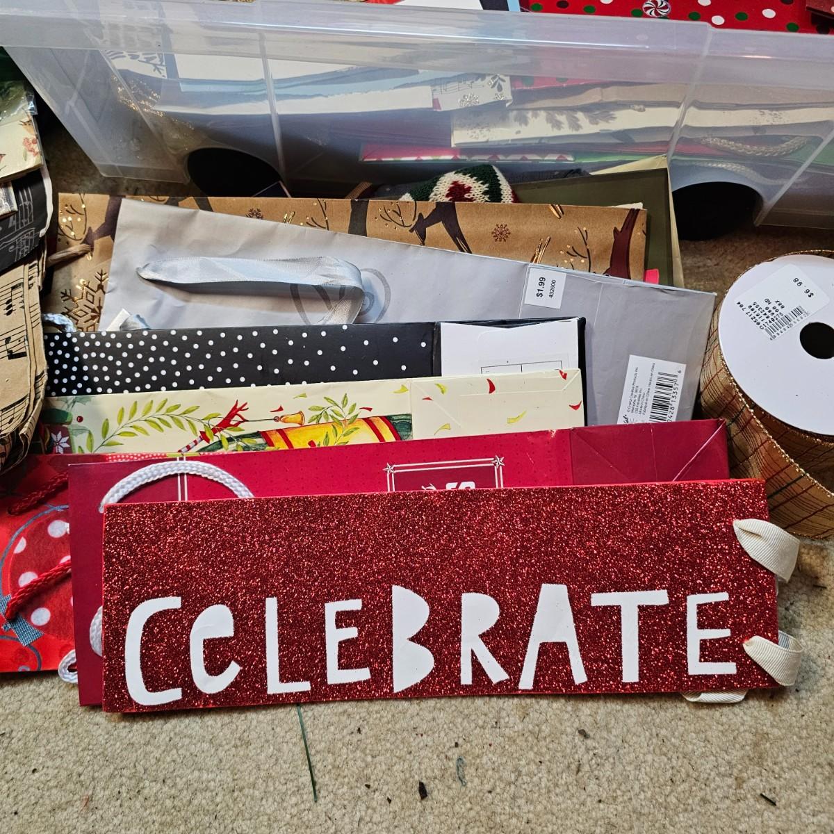 Decorative stems for indoors or out. Over two dozen pieces of poinsettia, ivy, holly & berries. Also includes loose pine cones and a mailbox piece with solar lights. Unable to test lights. Wrapping items include paper, bags, tags and more. Storage containers included, see photos for details. Local pickup only.