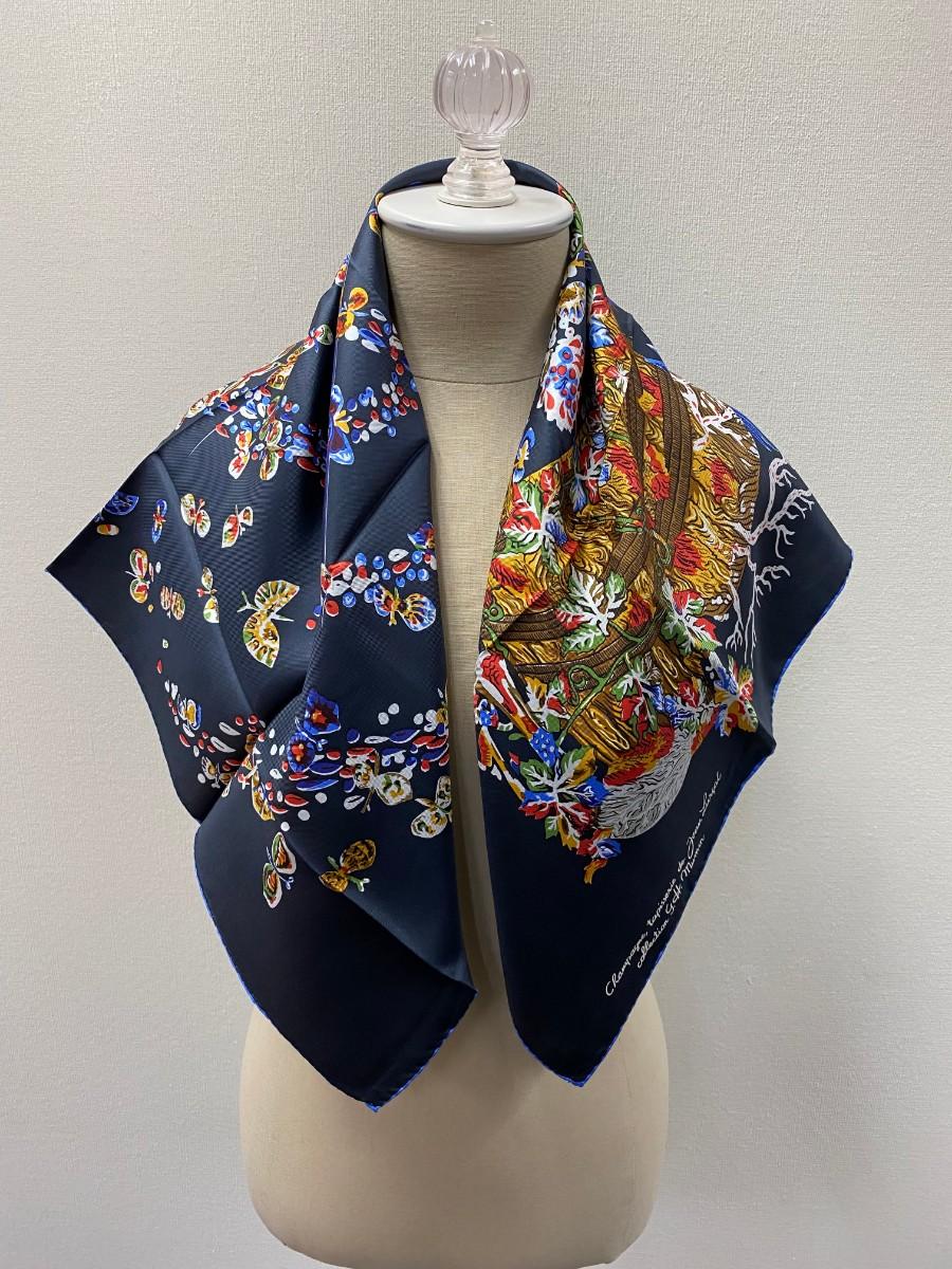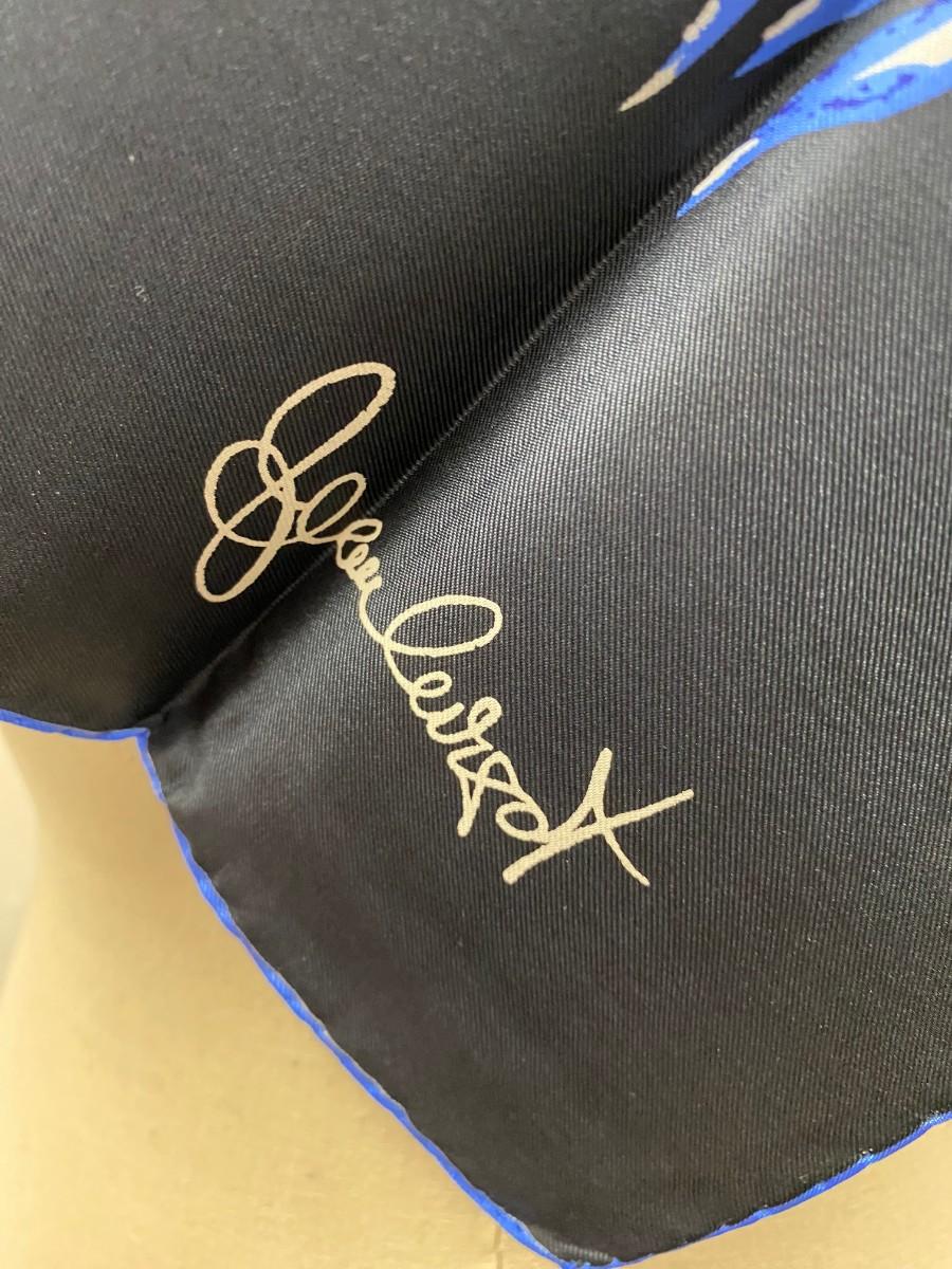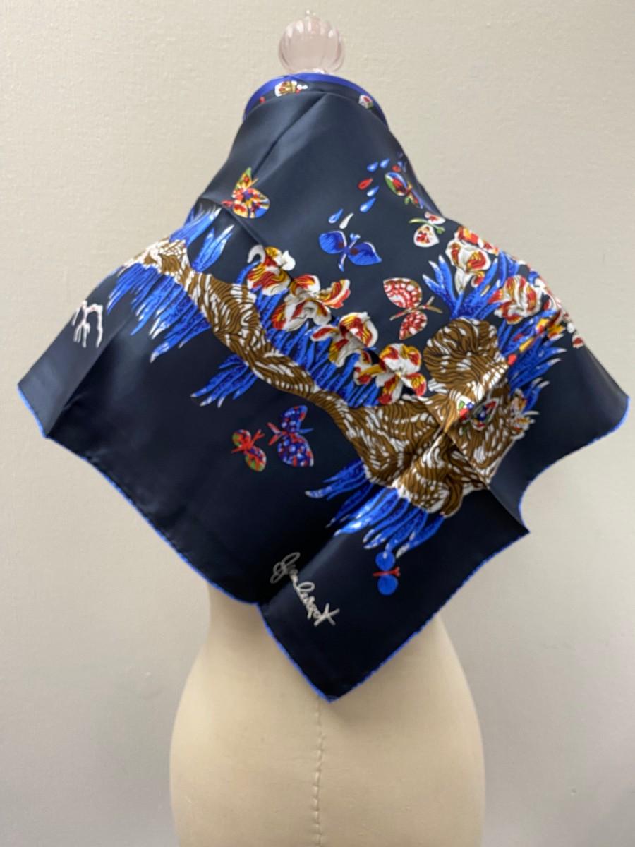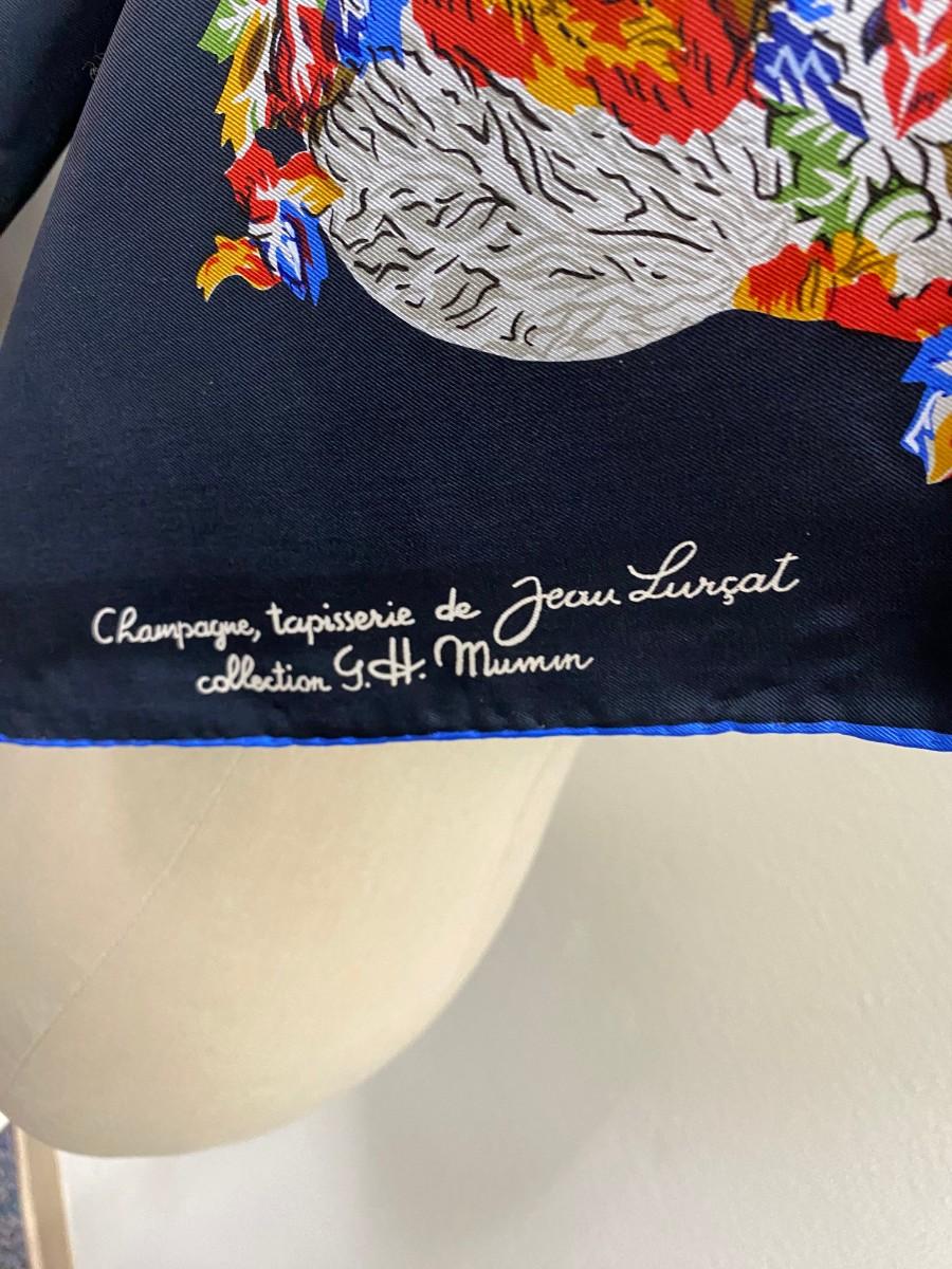 Champagne tapestry de Jean Lurcat, black silk with sky blue hand rolled edges representing a wooden barrel with vine leaves, flowers, and butterflies. New in box. 30 x 30 inches Retails at $200