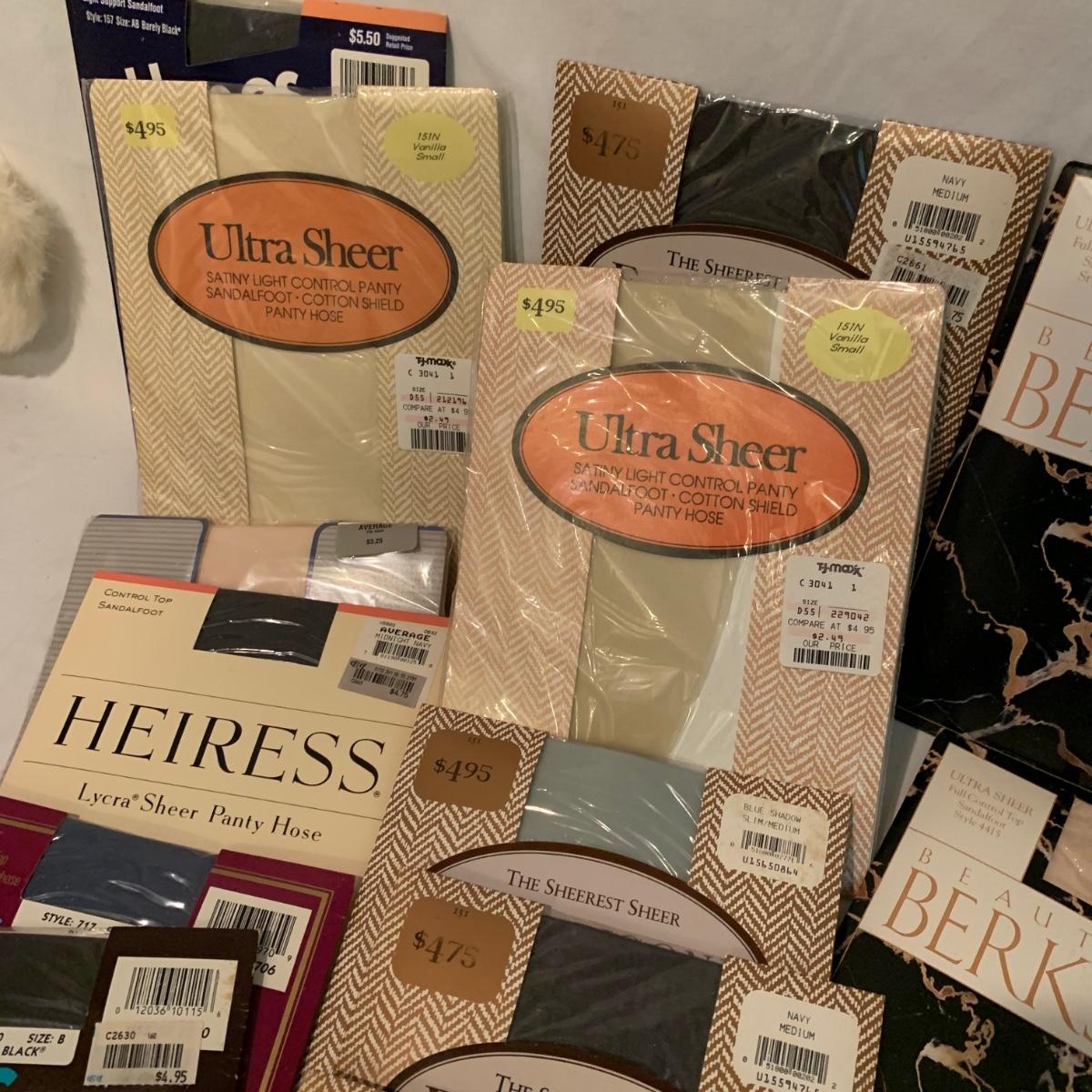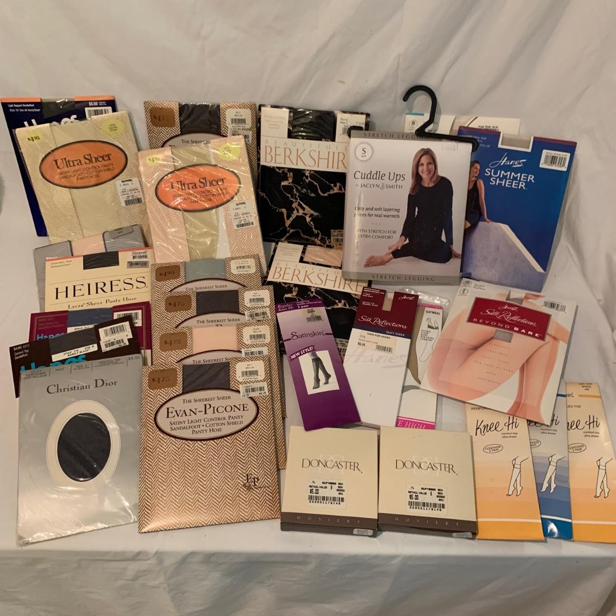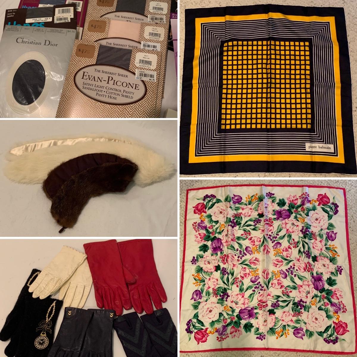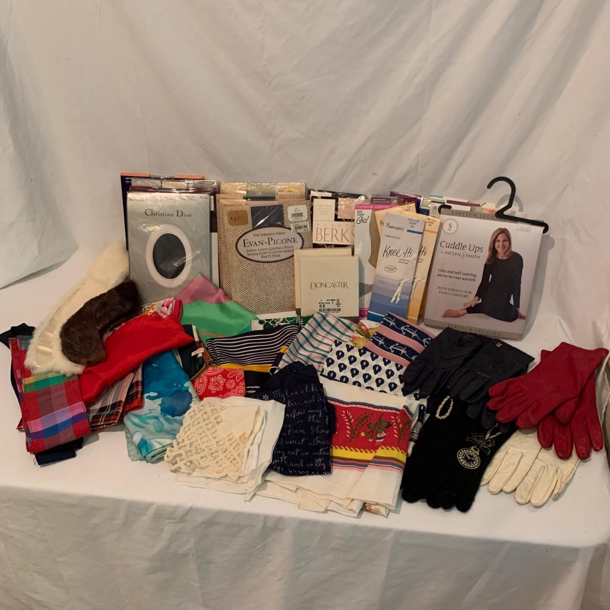 Approximately 25 packages of unopened pantyhose by Christian Dior, Evan-Picone, Hanes, and more, as well as one pair of Jaclyn Smith Cuddle Ups stretch leggings. Sizes are mostly small or medium. Five pairs of gloves, three of which are leather, one is a wool and rabbit fur blend, and one nylon. Only the red pair has a size label (XL), but they all seem to fit small to medium sized hands. Two collars appear to be fur. Four delicate lace handkerchiefs. And a variety of scarves including cotton and silk. A couple stains are shown on items in the photos.