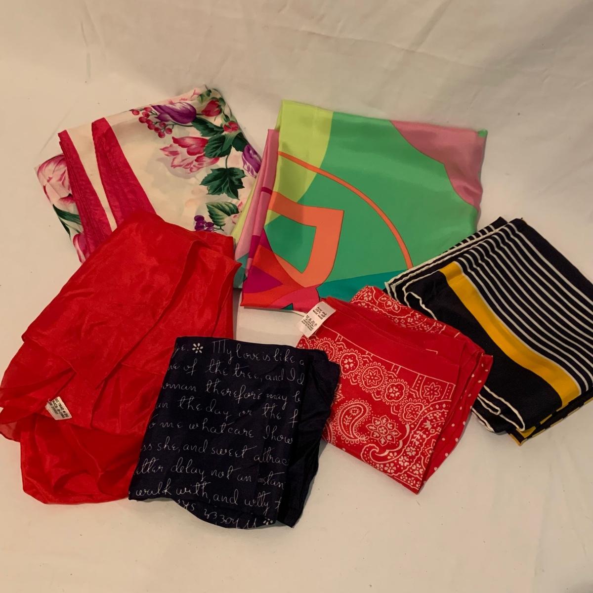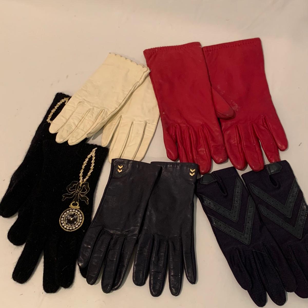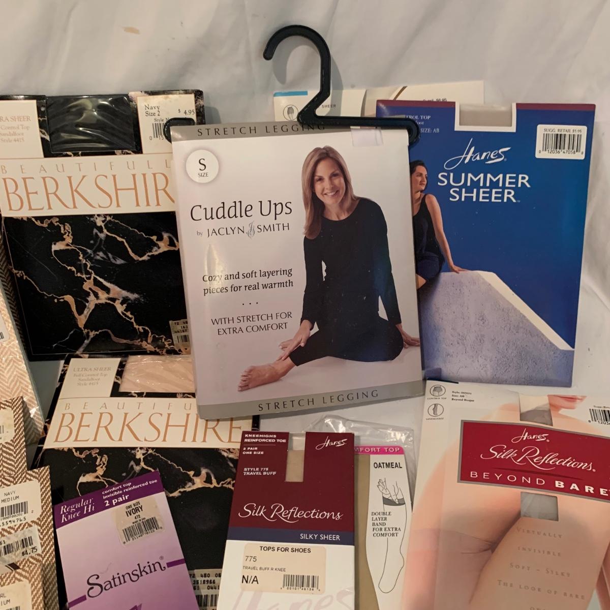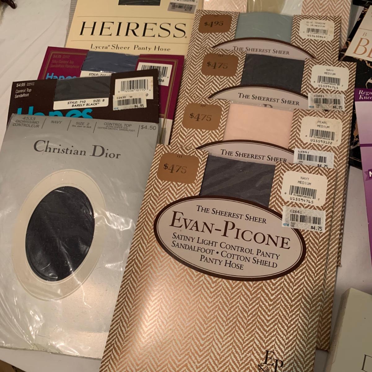 Approximately 25 packages of unopened pantyhose by Christian Dior, Evan-Picone, Hanes, and more, as well as one pair of Jaclyn Smith Cuddle Ups stretch leggings. Sizes are mostly small or medium. Five pairs of gloves, three of which are leather, one is a wool and rabbit fur blend, and one nylon. Only the red pair has a size label (XL), but they all seem to fit small to medium sized hands. Two collars appear to be fur. Four delicate lace handkerchiefs. And a variety of scarves including cotton and silk. A couple stains are shown on items in the photos.