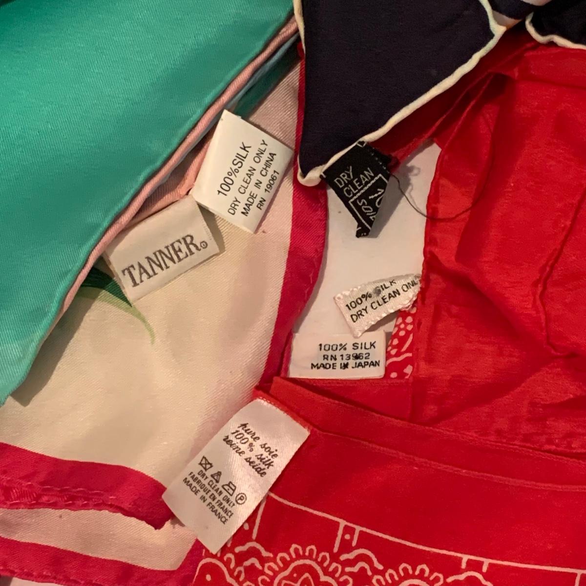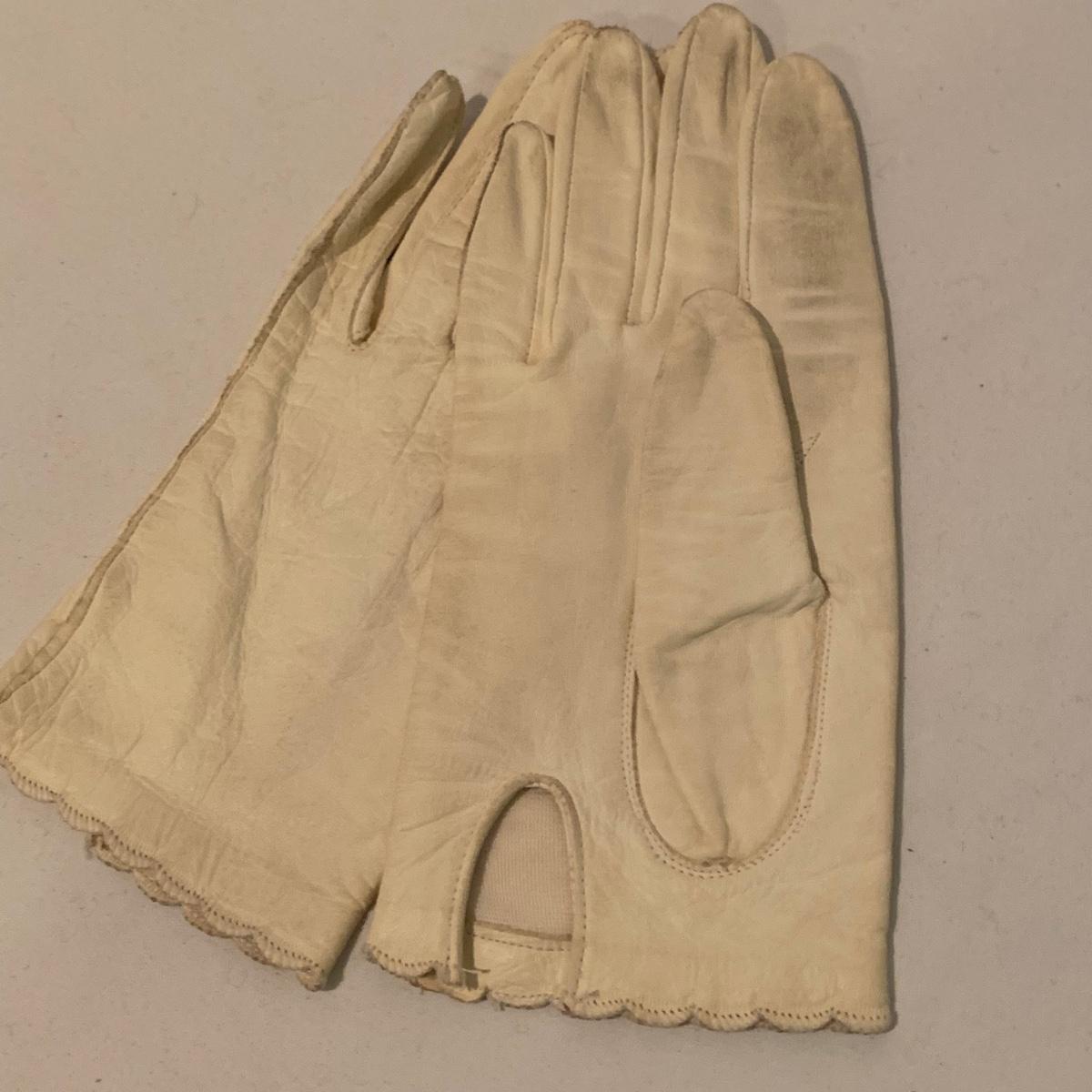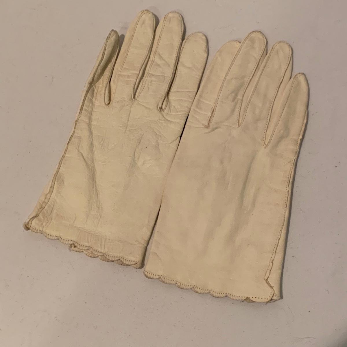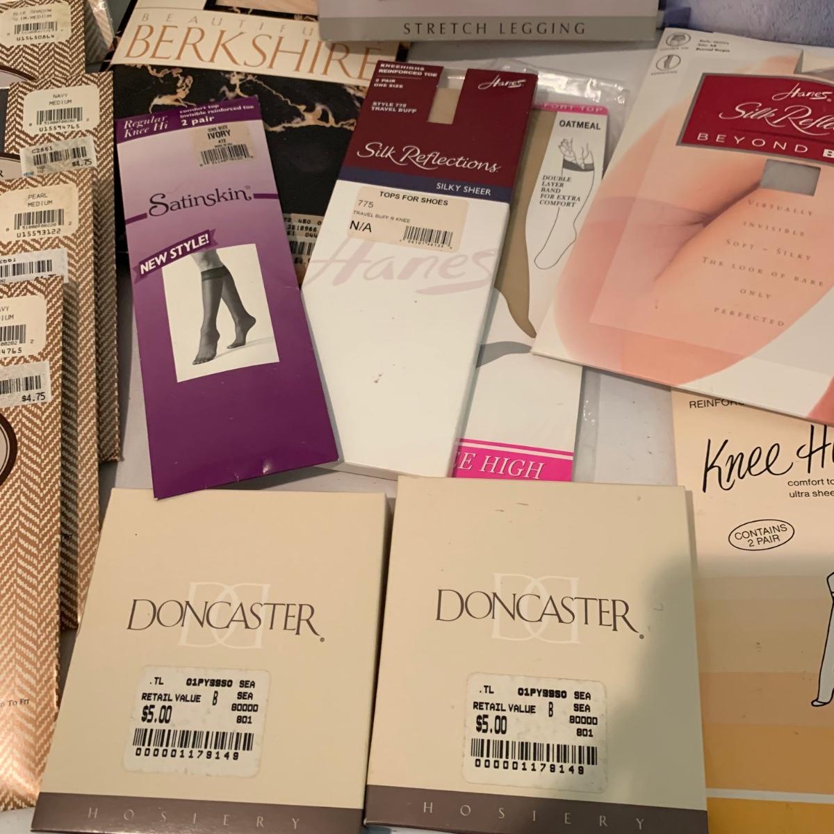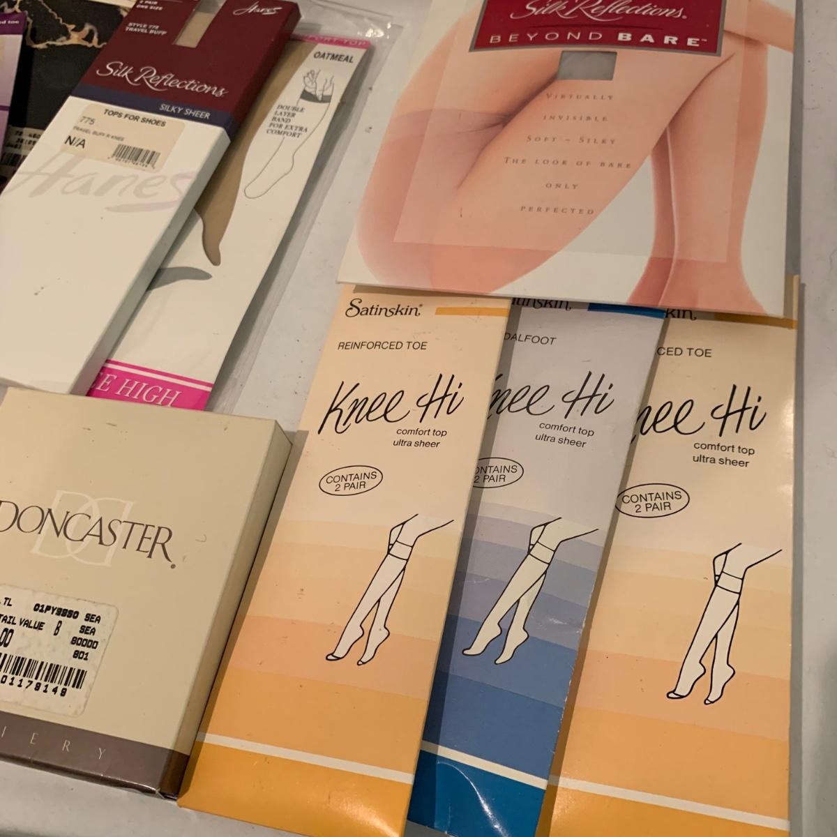 Approximately 25 packages of unopened pantyhose by Christian Dior, Evan-Picone, Hanes, and more, as well as one pair of Jaclyn Smith Cuddle Ups stretch leggings. Sizes are mostly small or medium. Five pairs of gloves, three of which are leather, one is a wool and rabbit fur blend, and one nylon. Only the red pair has a size label (XL), but they all seem to fit small to medium sized hands. Two collars appear to be fur. Four delicate lace handkerchiefs. And a variety of scarves including cotton and silk. A couple stains are shown on items in the photos.