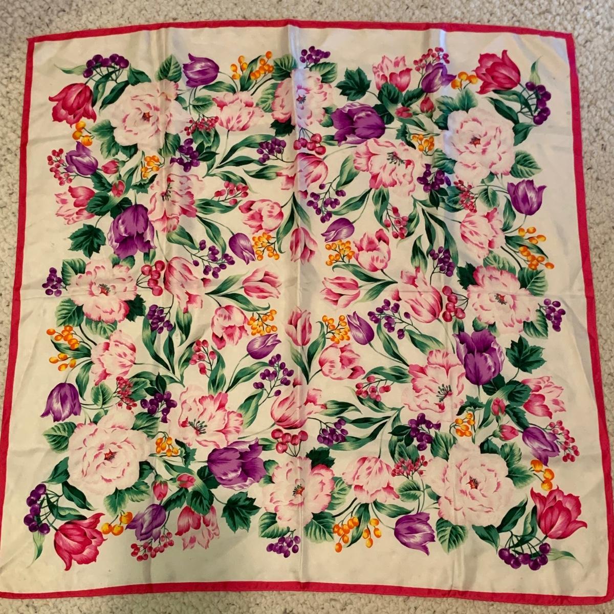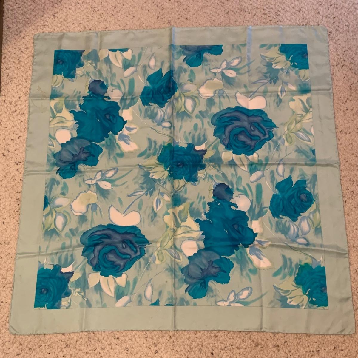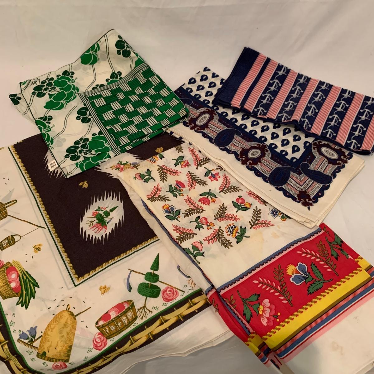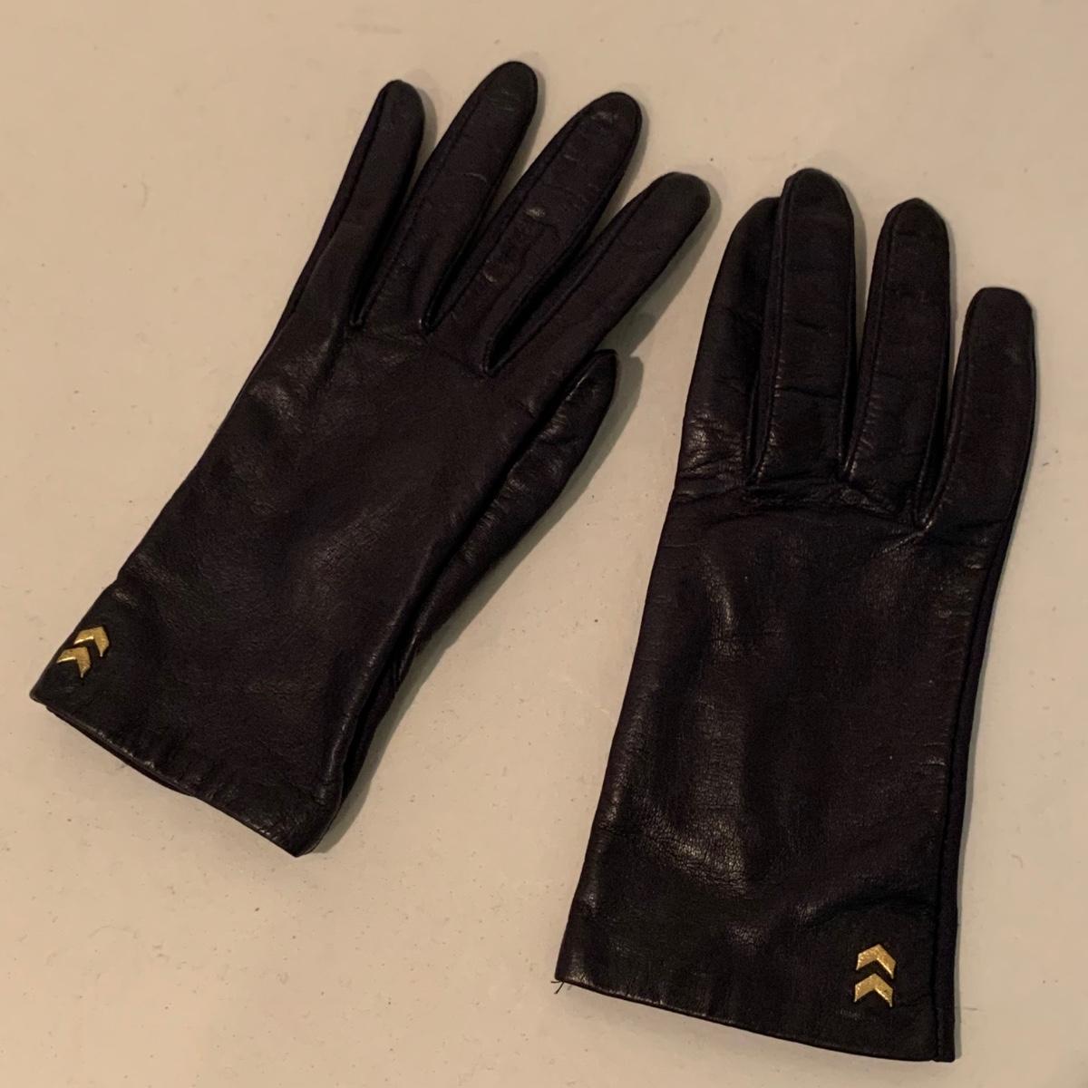 Approximately 25 packages of unopened pantyhose by Christian Dior, Evan-Picone, Hanes, and more, as well as one pair of Jaclyn Smith Cuddle Ups stretch leggings. Sizes are mostly small or medium. Five pairs of gloves, three of which are leather, one is a wool and rabbit fur blend, and one nylon. Only the red pair has a size label (XL), but they all seem to fit small to medium sized hands. Two collars appear to be fur. Four delicate lace handkerchiefs. And a variety of scarves including cotton and silk. A couple stains are shown on items in the photos.
