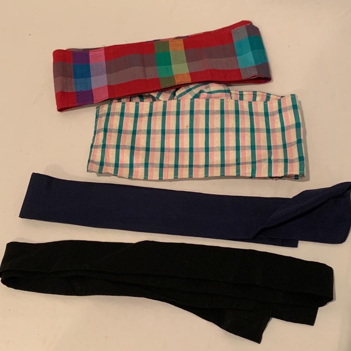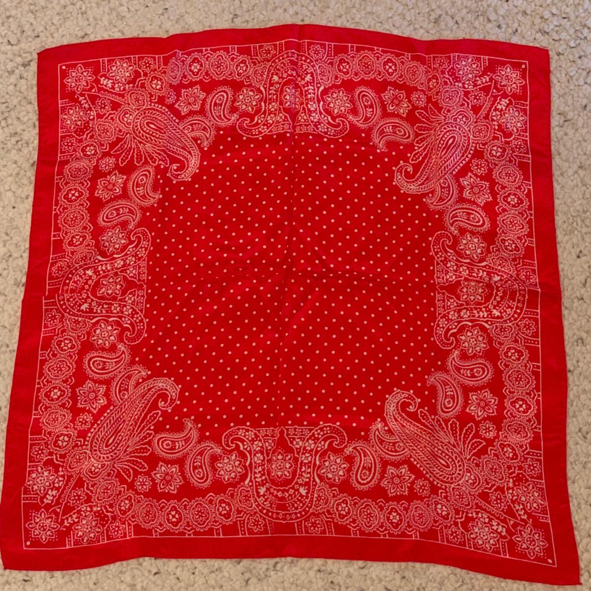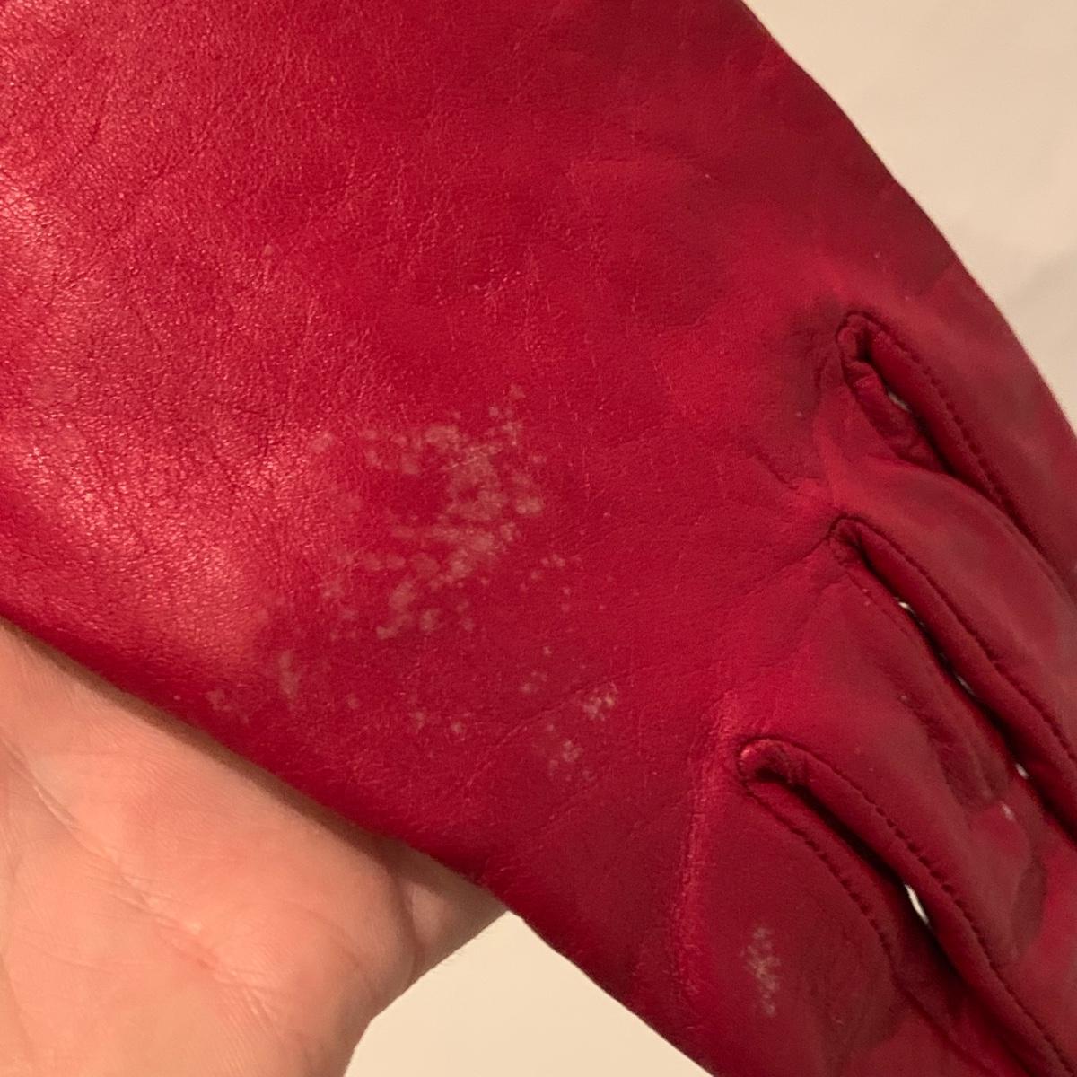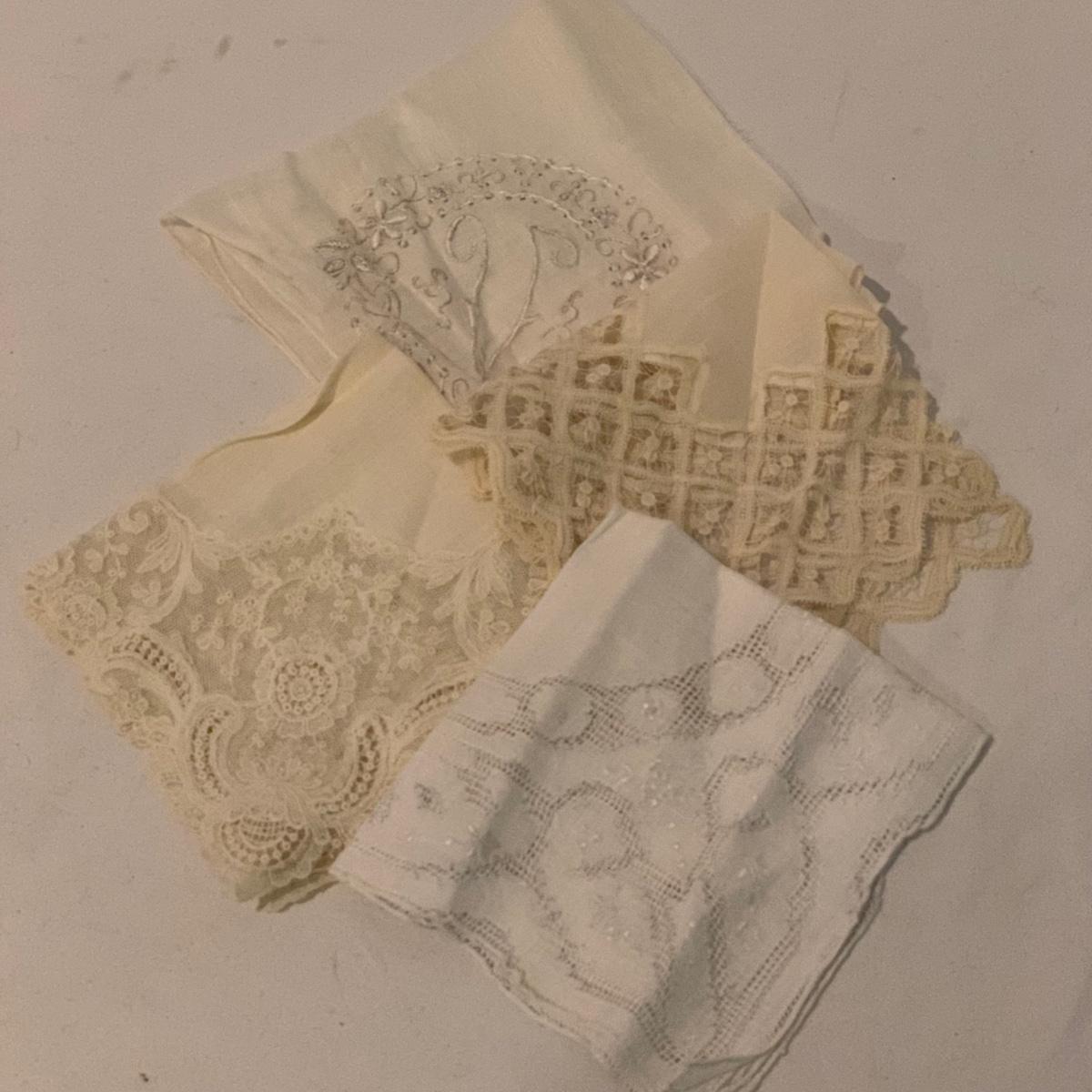 Approximately 25 packages of unopened pantyhose by Christian Dior, Evan-Picone, Hanes, and more, as well as one pair of Jaclyn Smith Cuddle Ups stretch leggings. Sizes are mostly small or medium. Five pairs of gloves, three of which are leather, one is a wool and rabbit fur blend, and one nylon. Only the red pair has a size label (XL), but they all seem to fit small to medium sized hands. Two collars appear to be fur. Four delicate lace handkerchiefs. And a variety of scarves including cotton and silk. A couple stains are shown on items in the photos.