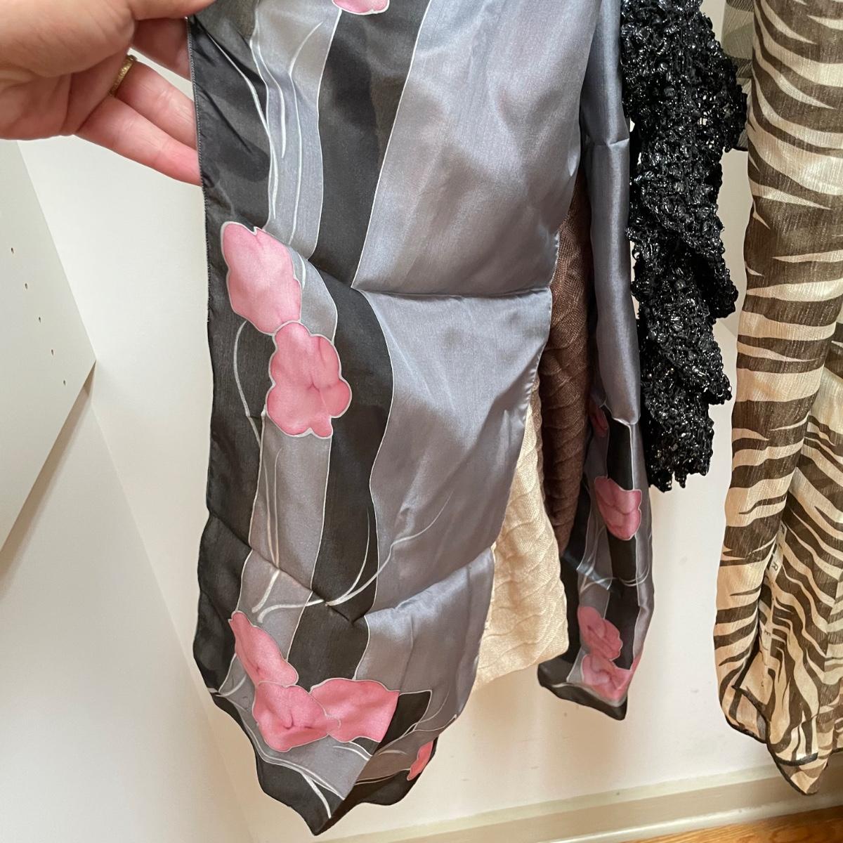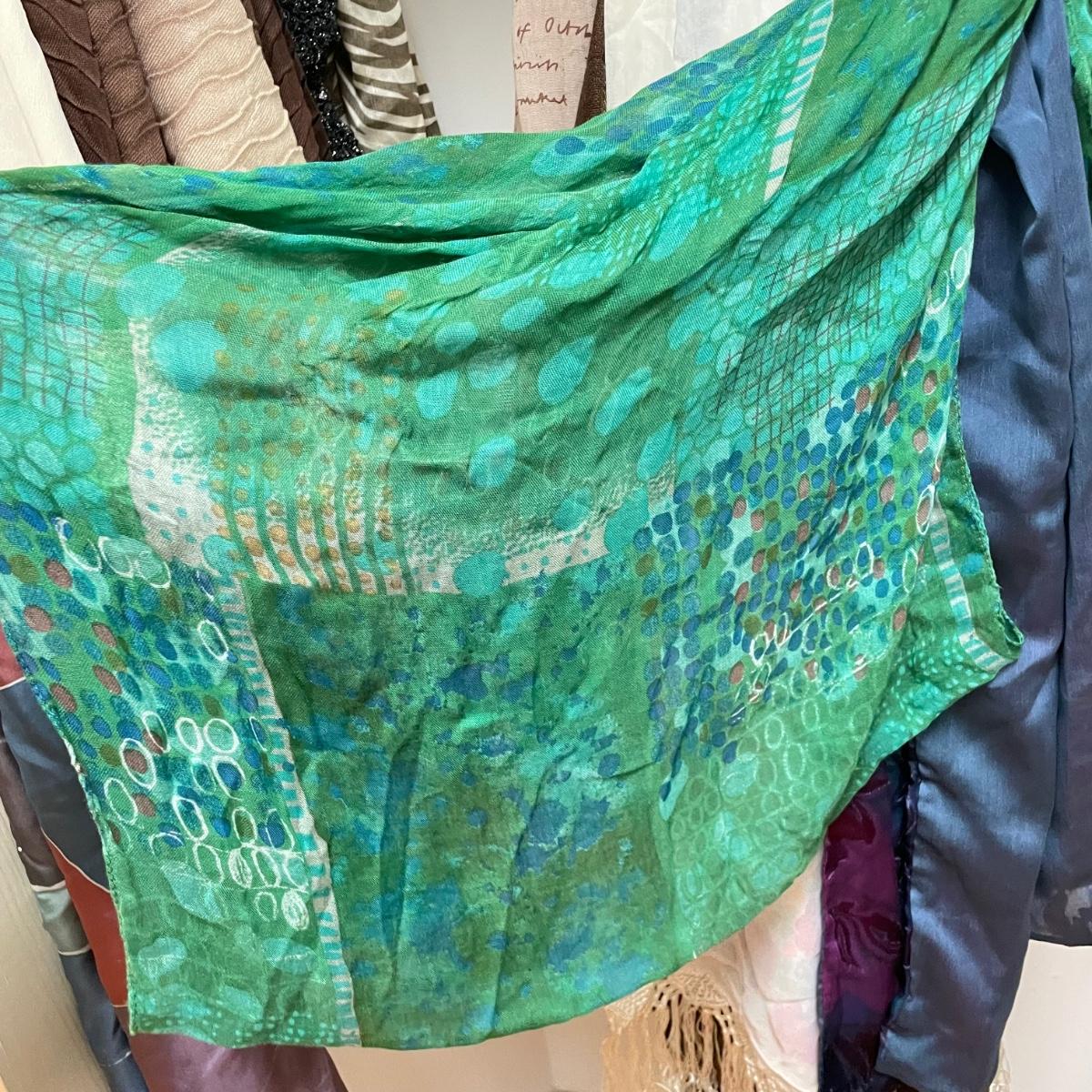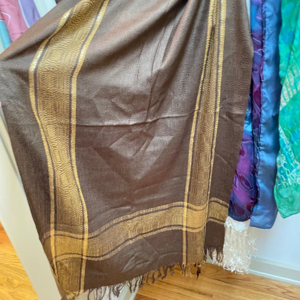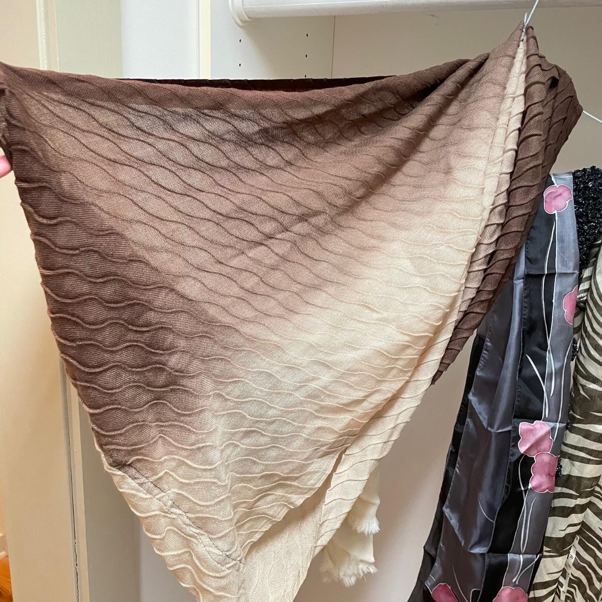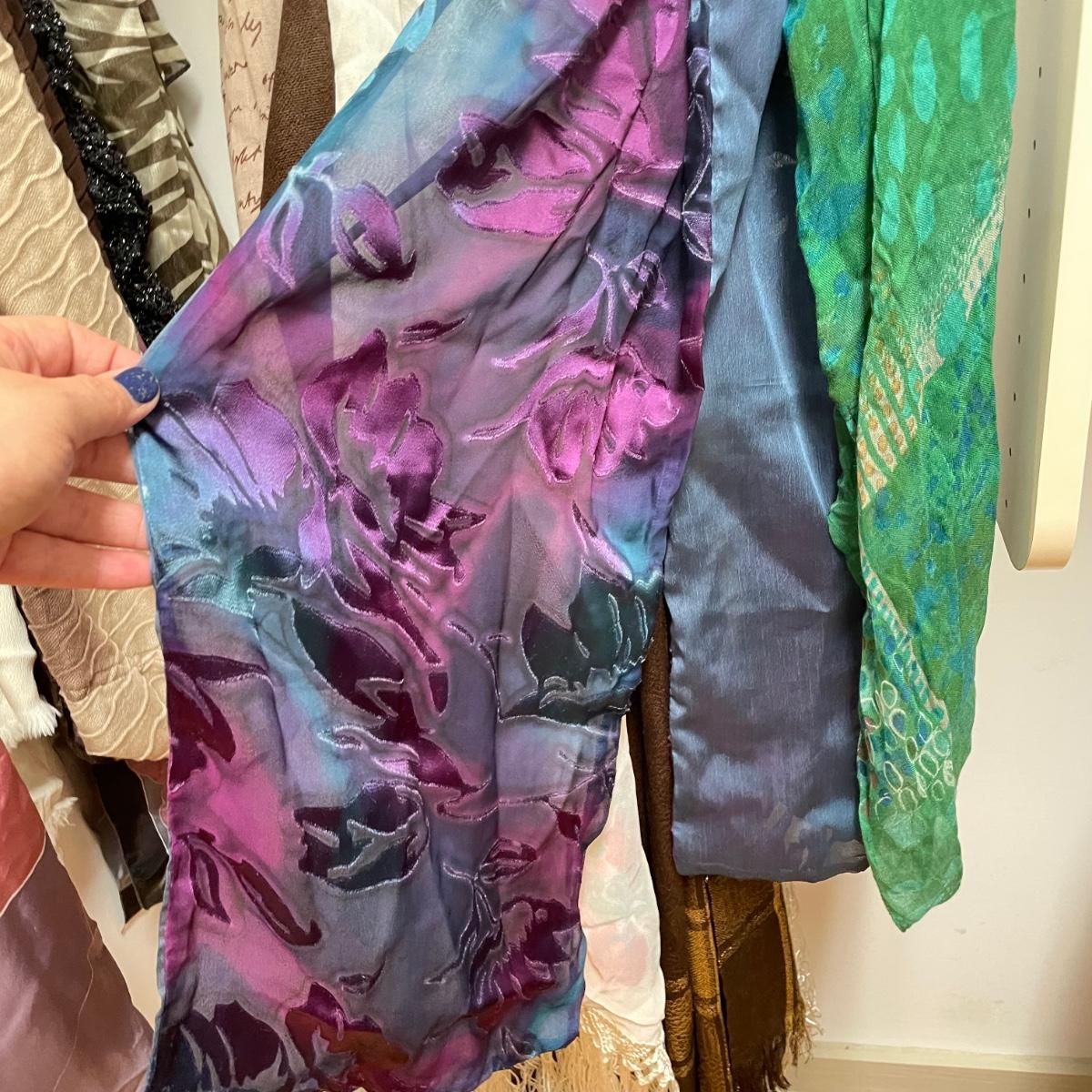 16 hanging scarves with different styles and made from a variety of materials, most do not have tags attached to verify the textile. Lot also includes seven belts, known sizes are small/28. The green, black, and brown belts are all marked Genuine Leather. Lot also holds a handful of silky feeling handkerchiefs, see images for known materials. The Asian style handkerchief with trees looks like a grey hombre in the photos, but it is actually lovely shades of green. Lastly, five pairs of gloves (the brown faux fur has a small hole in the finger and they are also fur lined), a fuzzy pair of ear muffs, two winter hats and a headband. See images. Shipping available.
