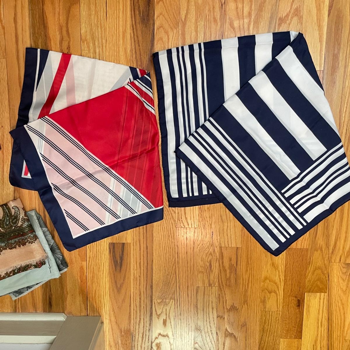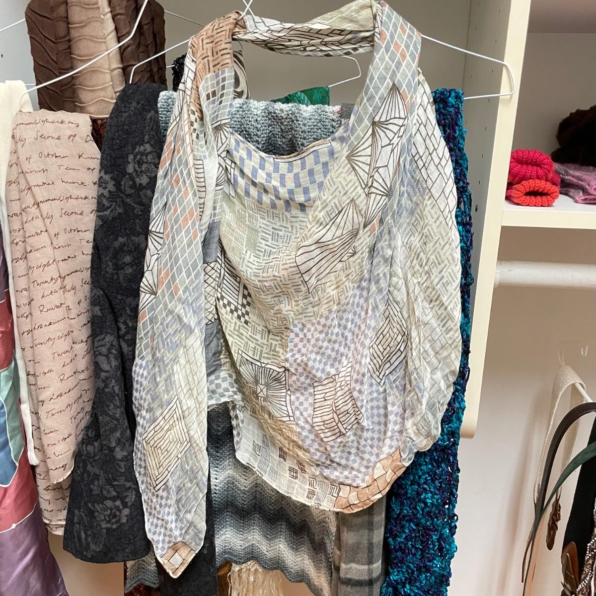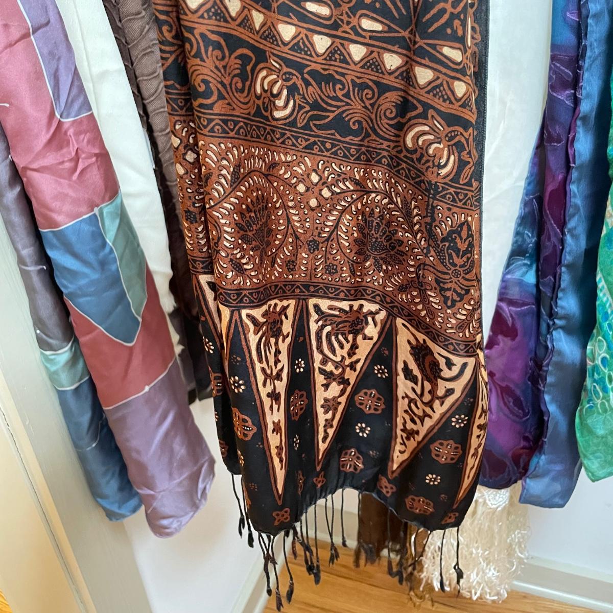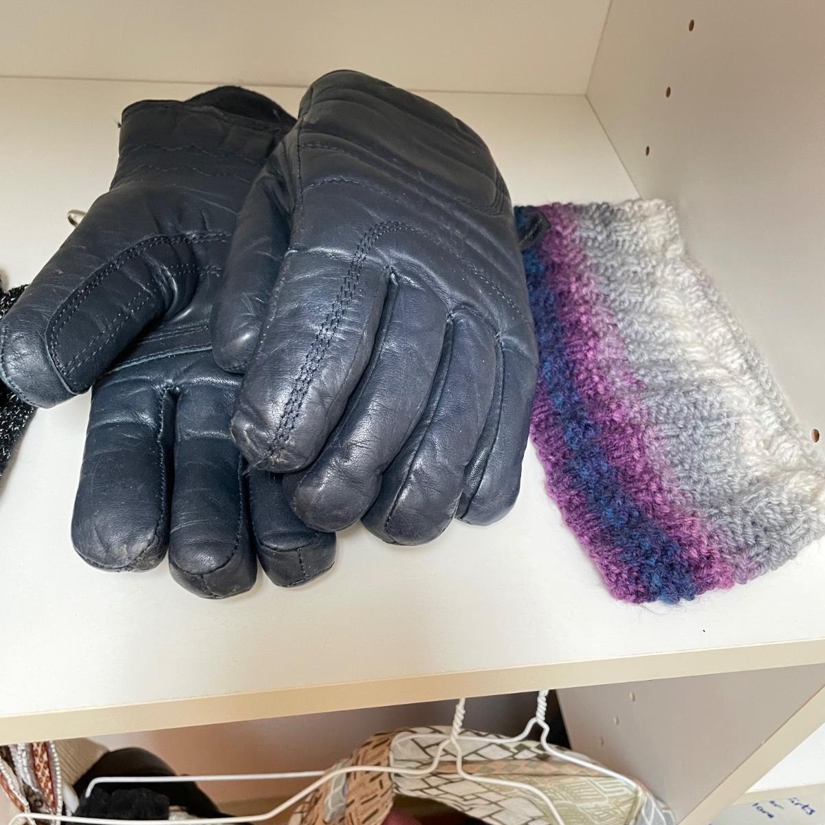 16 hanging scarves with different styles and made from a variety of materials, most do not have tags attached to verify the textile. Lot also includes seven belts, known sizes are small/28. The green, black, and brown belts are all marked Genuine Leather. Lot also holds a handful of silky feeling handkerchiefs, see images for known materials. The Asian style handkerchief with trees looks like a grey hombre in the photos, but it is actually lovely shades of green. Lastly, five pairs of gloves (the brown faux fur has a small hole in the finger and they are also fur lined), a fuzzy pair of ear muffs, two winter hats and a headband. See images. Shipping available.