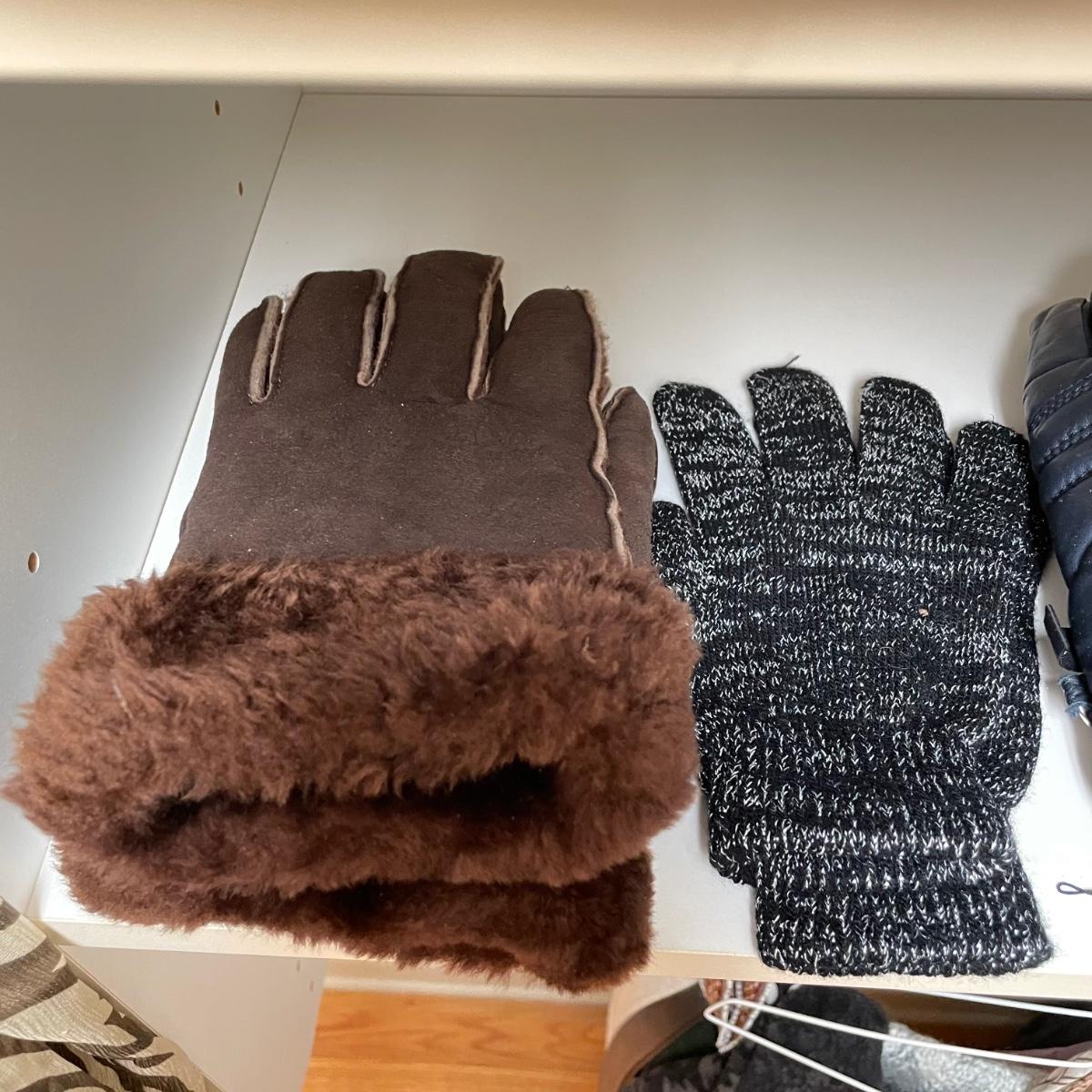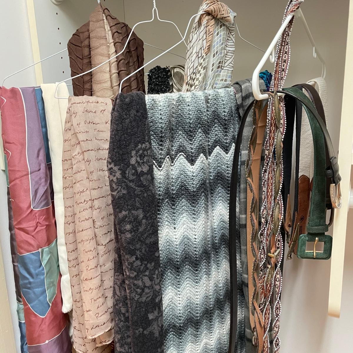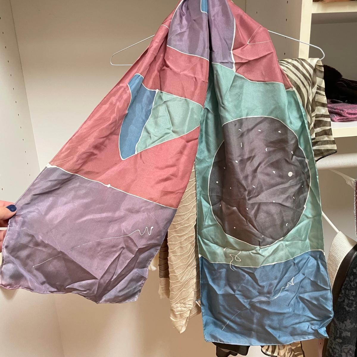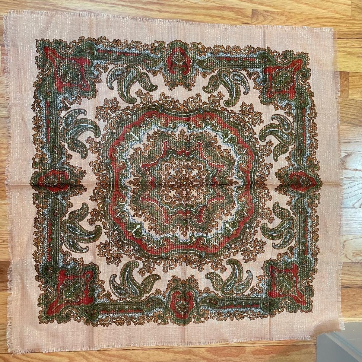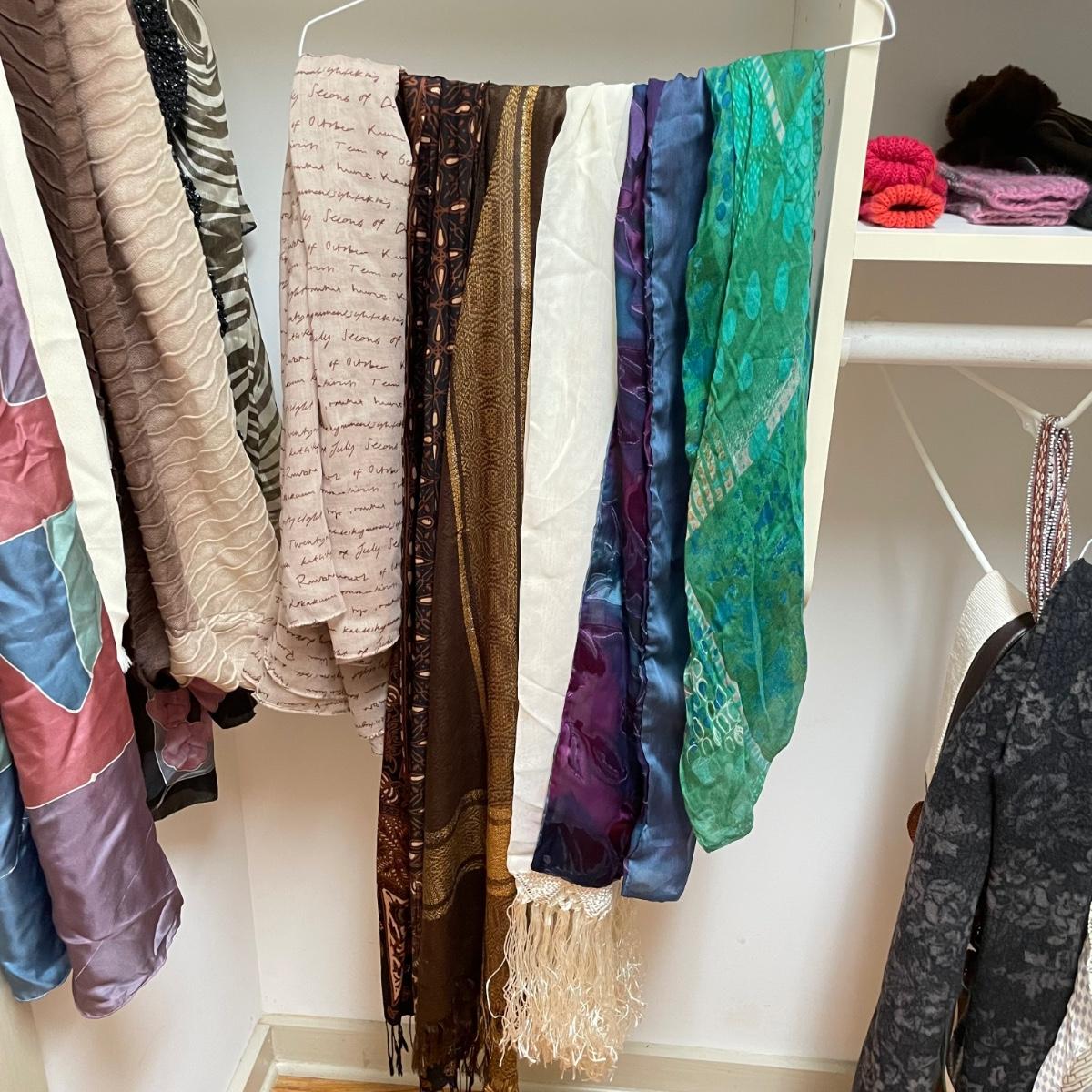 16 hanging scarves with different styles and made from a variety of materials, most do not have tags attached to verify the textile. Lot also includes seven belts, known sizes are small/28. The green, black, and brown belts are all marked Genuine Leather. Lot also holds a handful of silky feeling handkerchiefs, see images for known materials. The Asian style handkerchief with trees looks like a grey hombre in the photos, but it is actually lovely shades of green. Lastly, five pairs of gloves (the brown faux fur has a small hole in the finger and they are also fur lined), a fuzzy pair of ear muffs, two winter hats and a headband. See images. Shipping available.