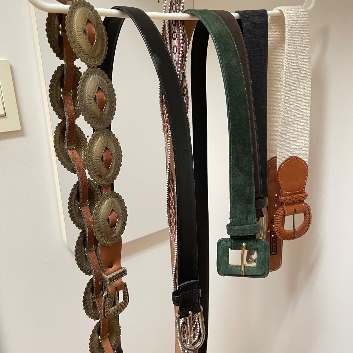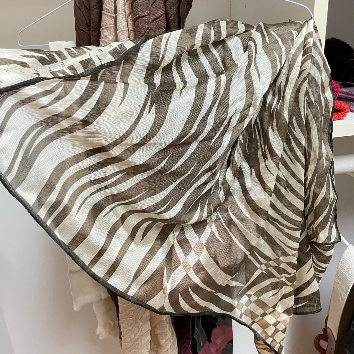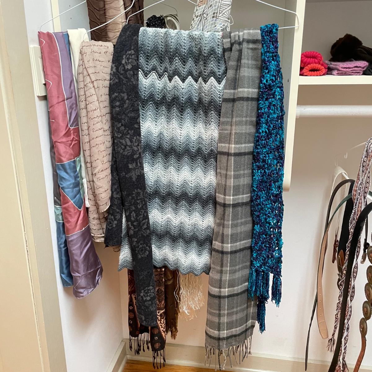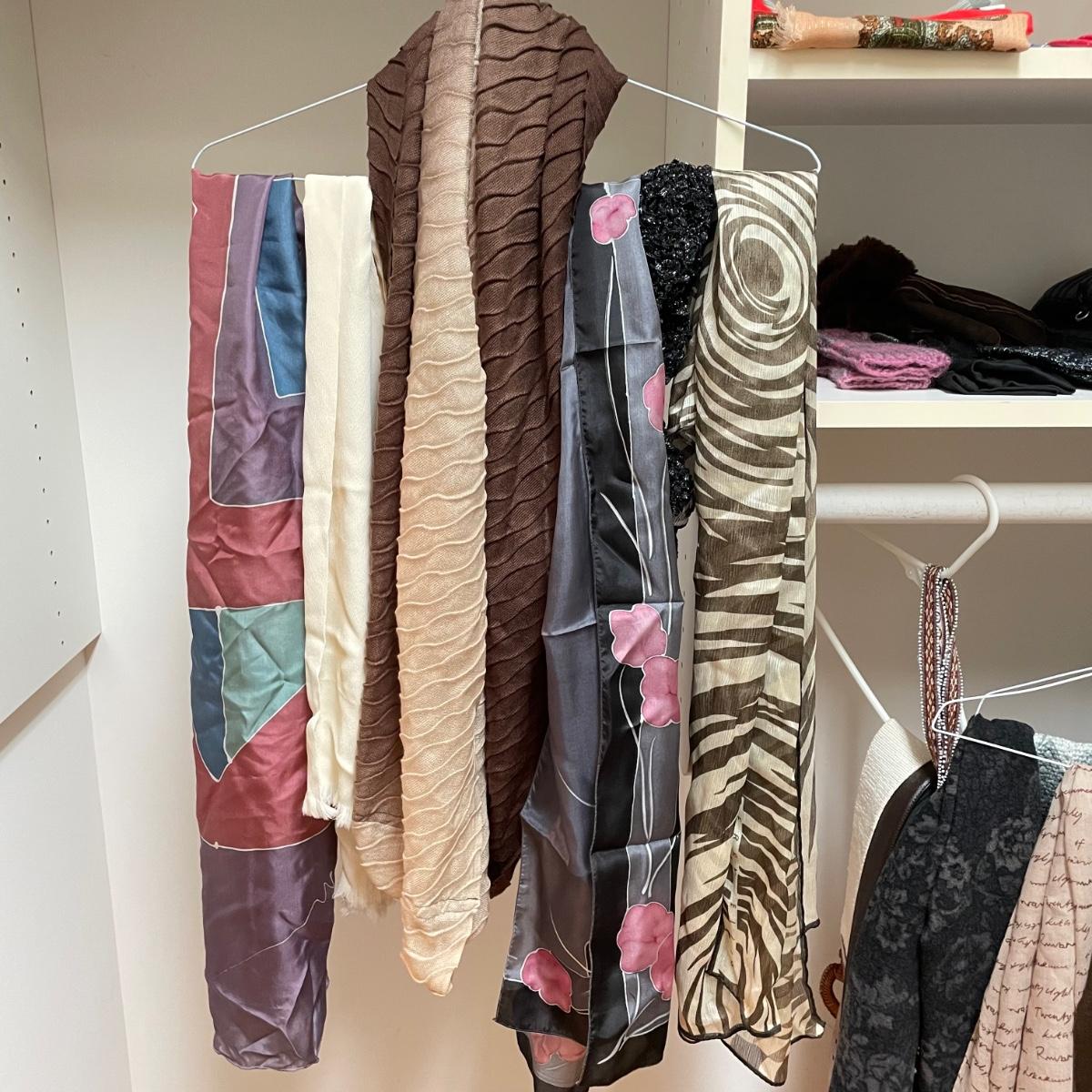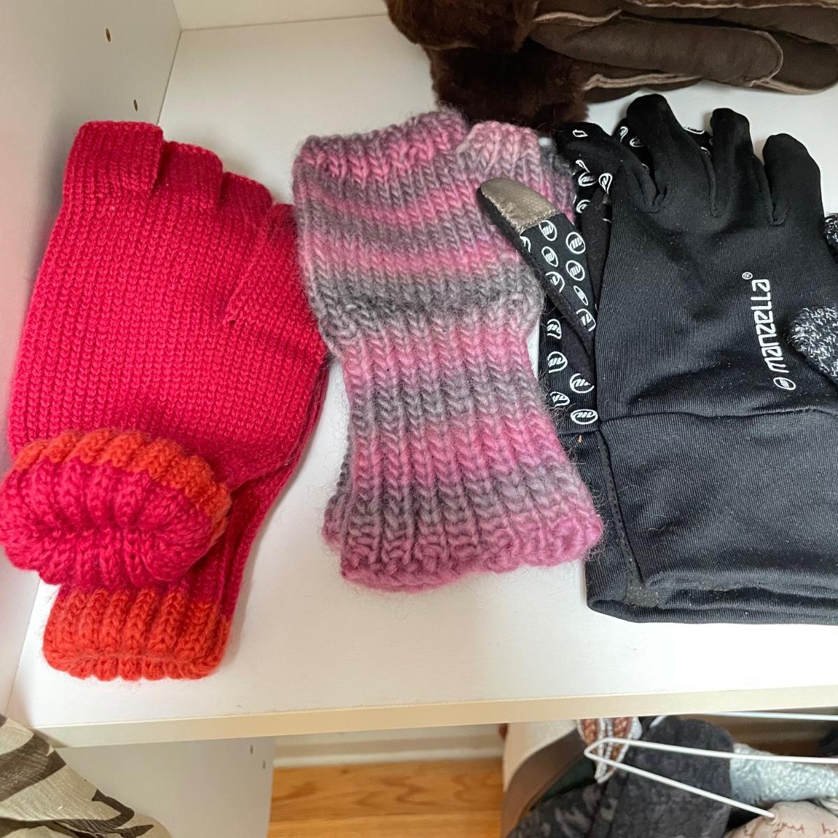 16 hanging scarves with different styles and made from a variety of materials, most do not have tags attached to verify the textile. Lot also includes seven belts, known sizes are small/28. The green, black, and brown belts are all marked Genuine Leather. Lot also holds a handful of silky feeling handkerchiefs, see images for known materials. The Asian style handkerchief with trees looks like a grey hombre in the photos, but it is actually lovely shades of green. Lastly, five pairs of gloves (the brown faux fur has a small hole in the finger and they are also fur lined), a fuzzy pair of ear muffs, two winter hats and a headband. See images. Shipping available.