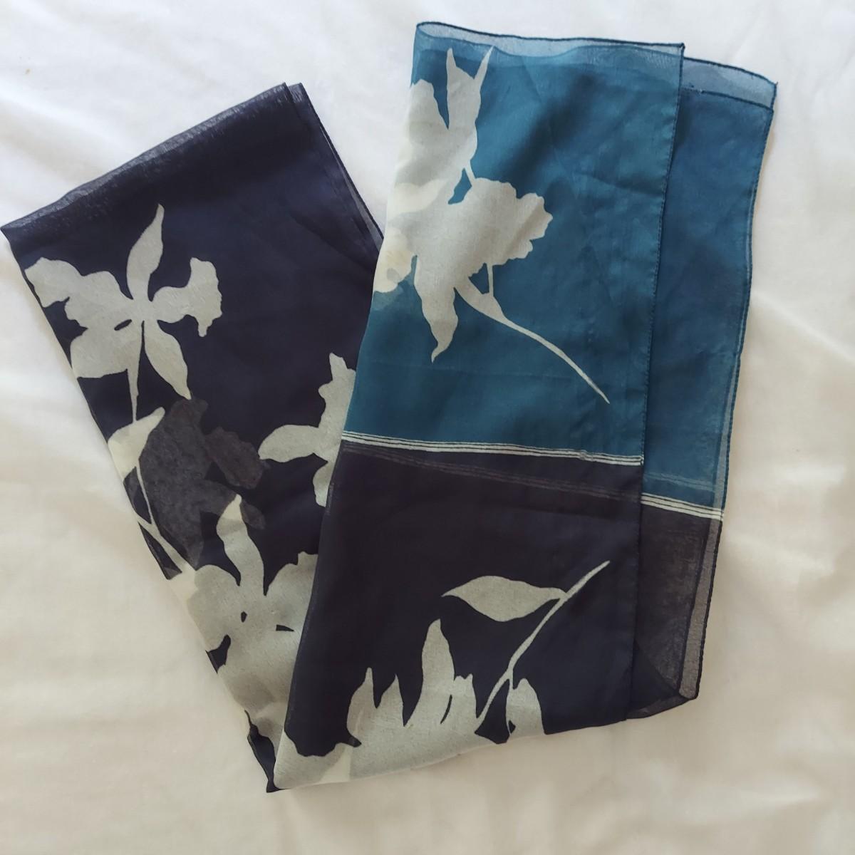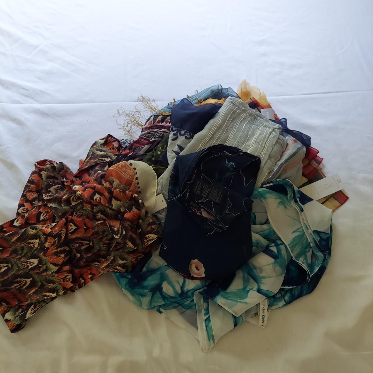 Several lightweight Summer scarves. Many are new with tags. Several are silk. Brands include Calvin Klein, Lucky Brand, Chicos, White House Black Market, Echo and more. Shipping available