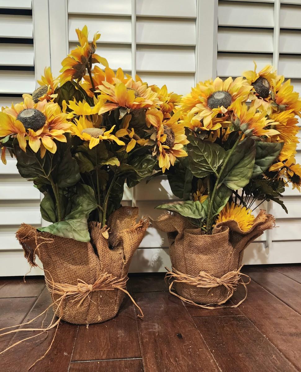 Silk Sunflower Lot - 2 - 21" tall in burlap pots, ceramic sunflower basket, ceramic sunflower pitcher