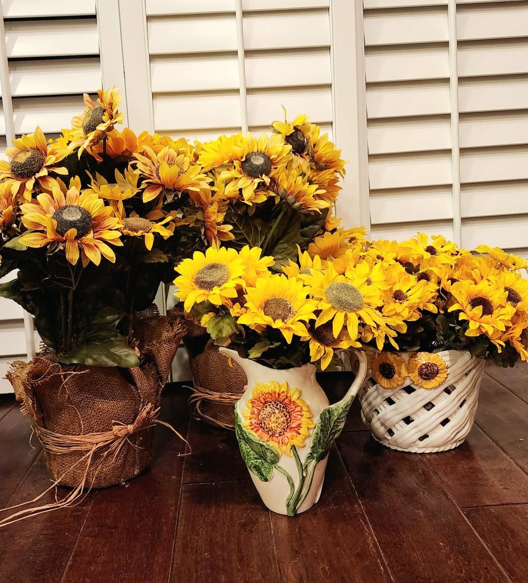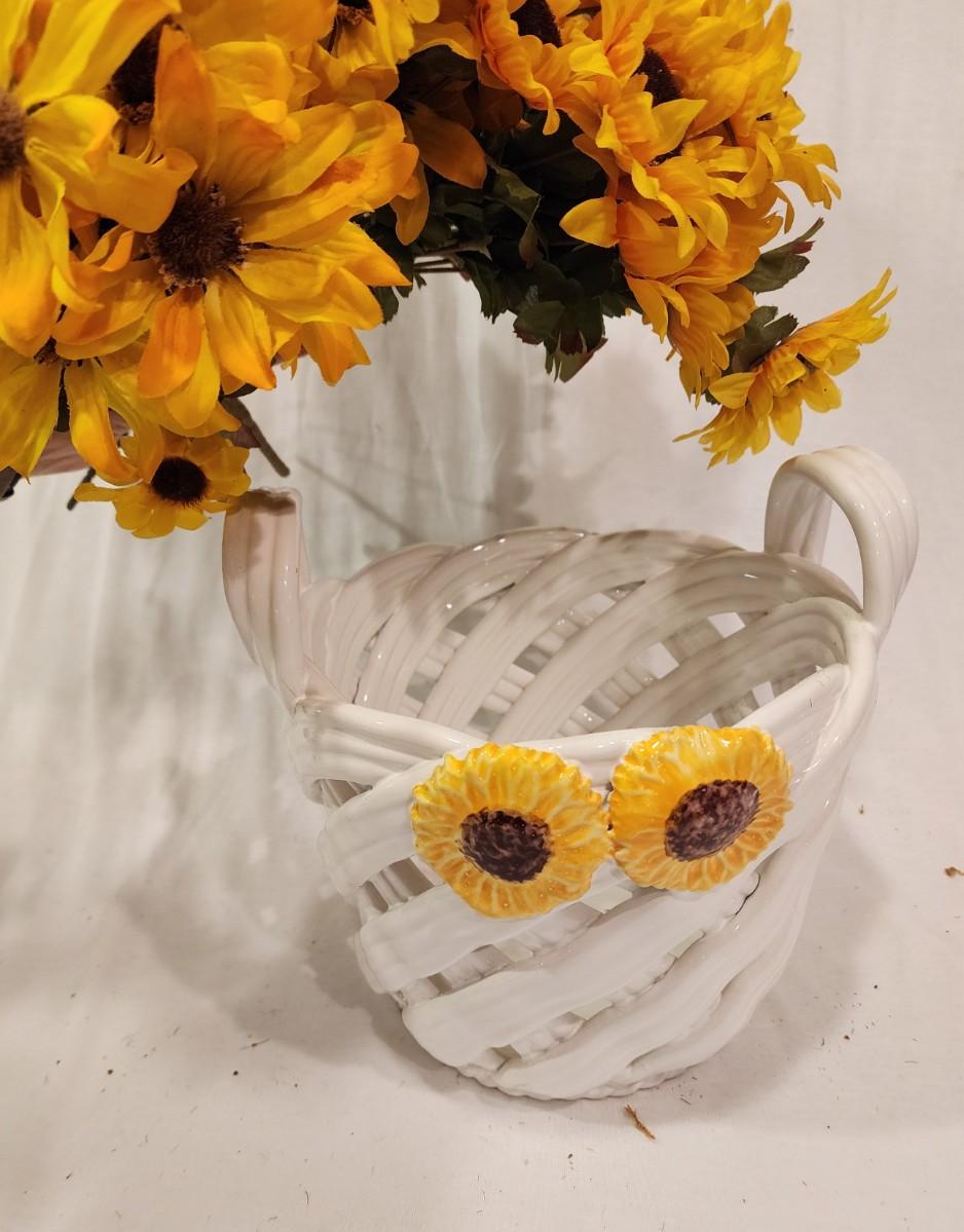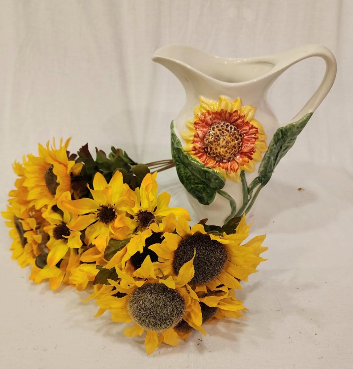 Lot includes: 2 Big, happy potted sunflowers, dozens of silk stems, 9" sunflower pitcher, 9" ceramic basket.