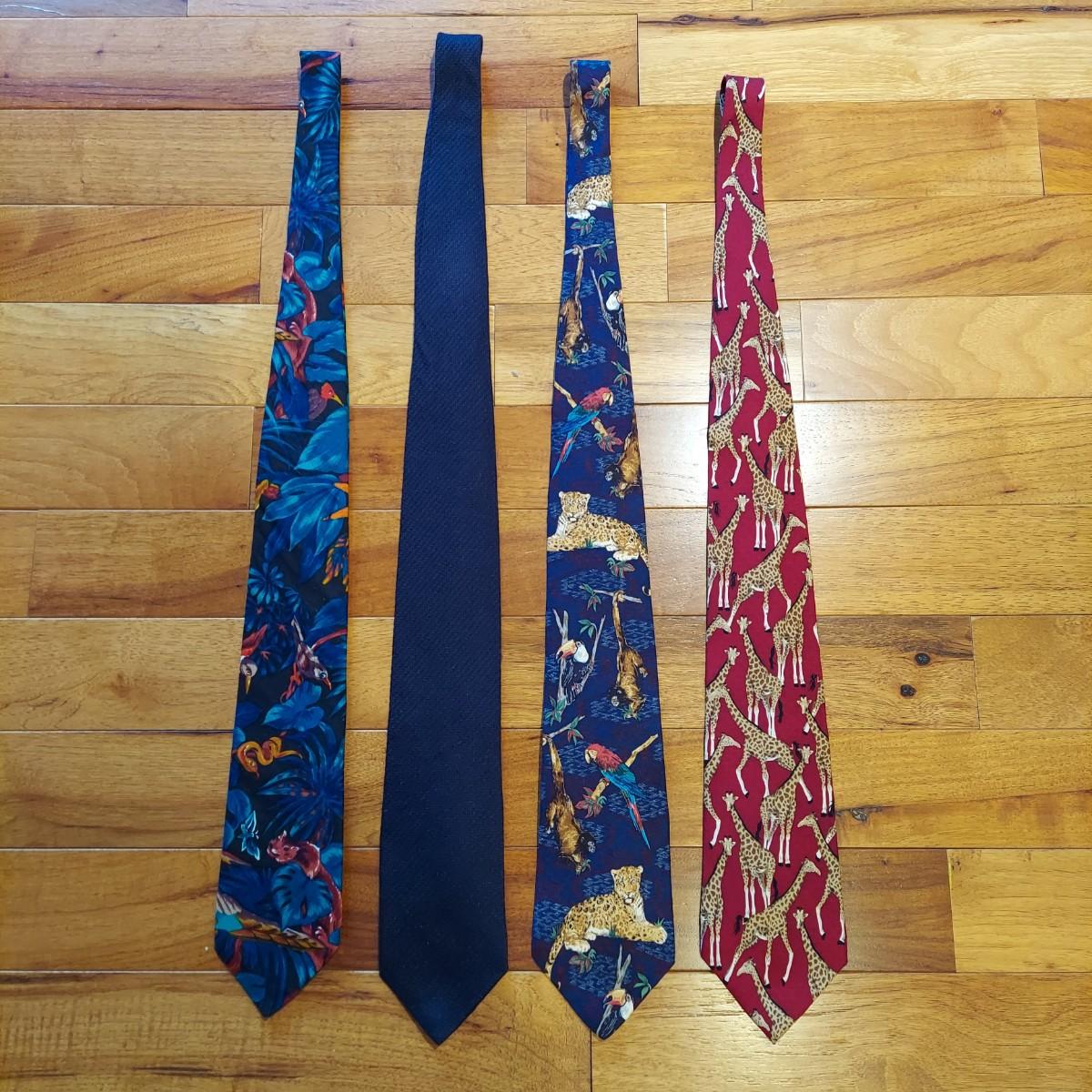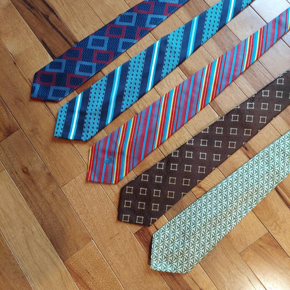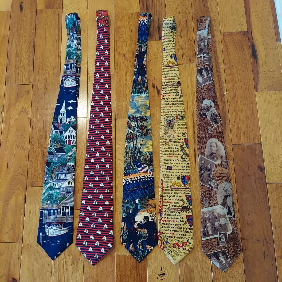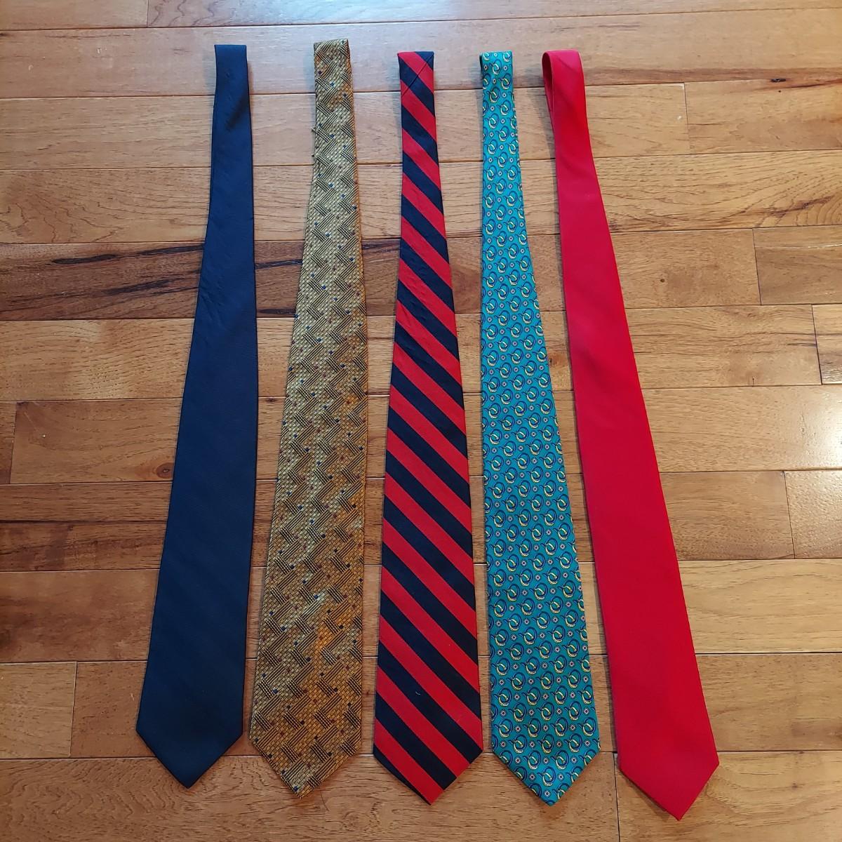 Large lot of 40+ neckties. Most are silk. There are novelty prints, classic prints like stripes and paisley, as well as vintage prints. Also includes some ascots. Brands include Calvin Klein, Izod, Brooks Btothers, Valentino, Bachrachs, Tommy Hilfiger, Alyn and more. Shipping available