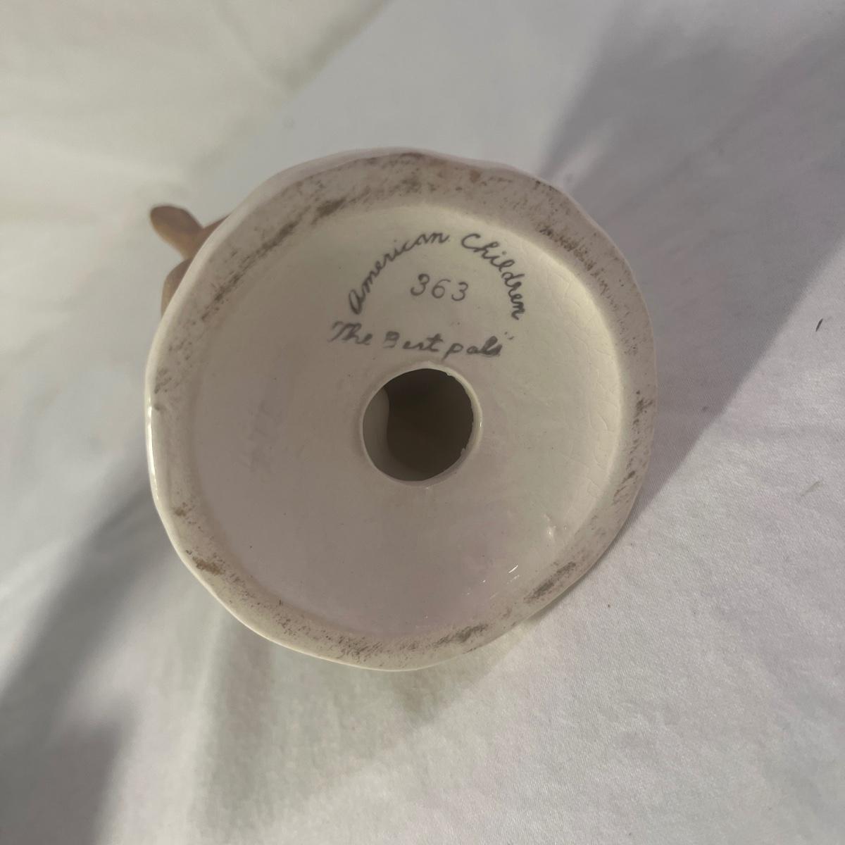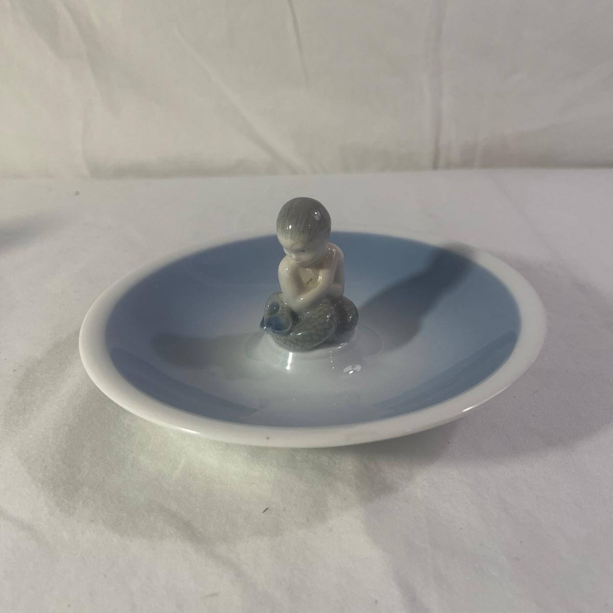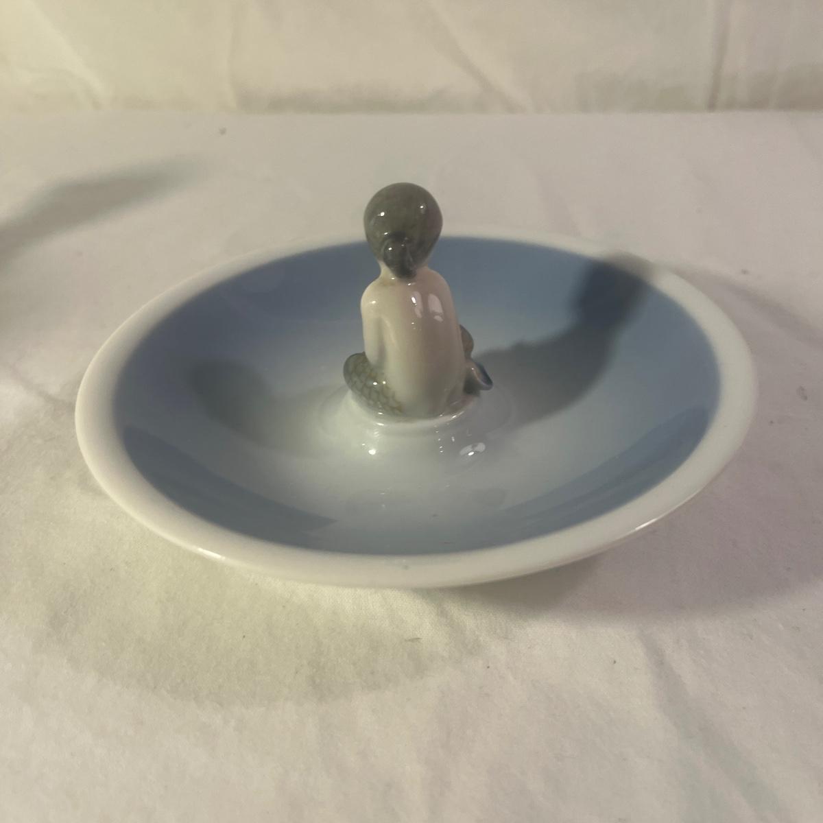 Lot includes a Royal Doulton figurine titled “Silks & Ribbon”, Royal Copenhagen Mermaid bowl and an American Children figurine titled “The Best Pals”. Royal Doulton figurine measures 4” x 5.5” x 6.5”H. All items are ceramic.