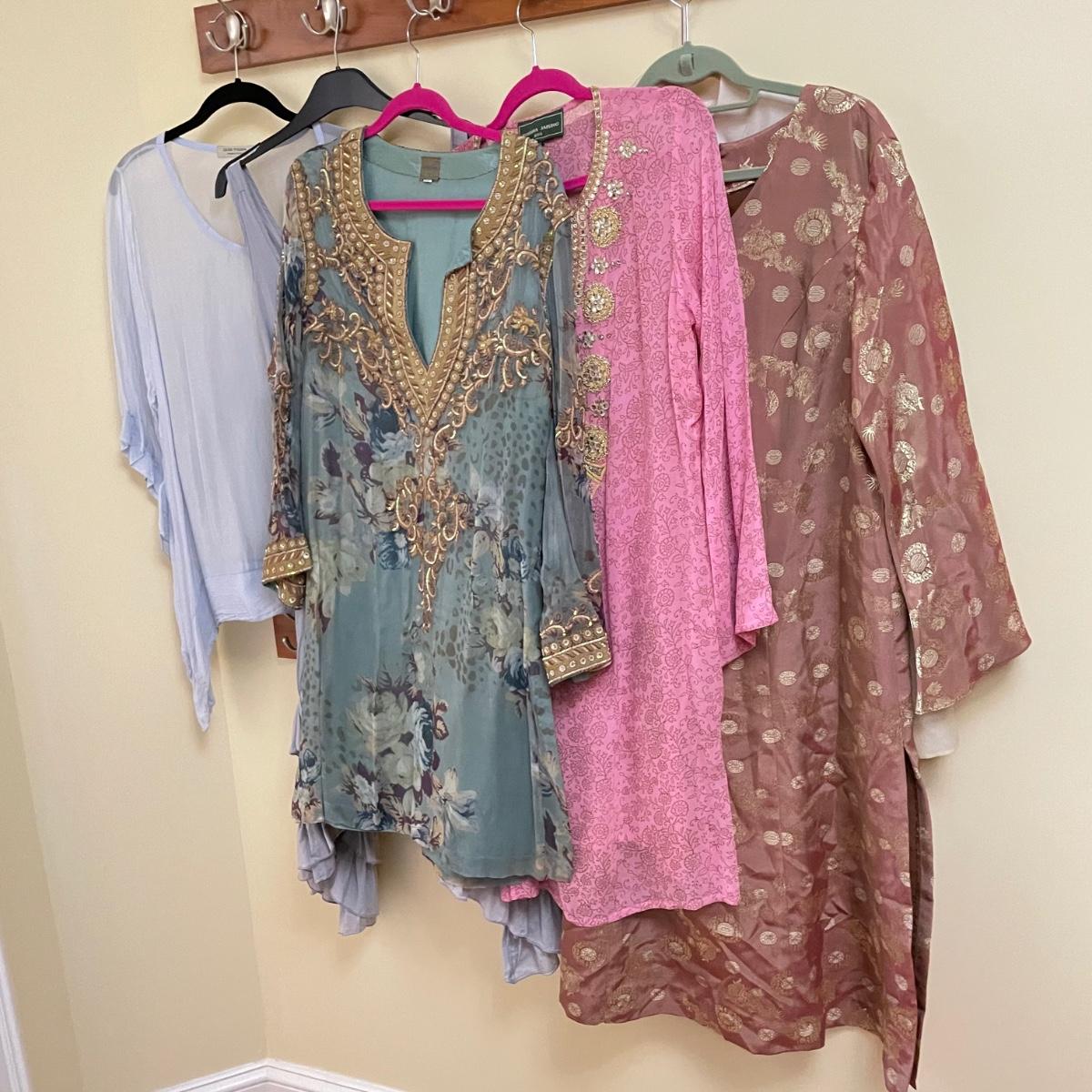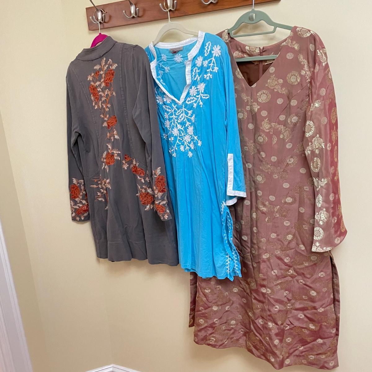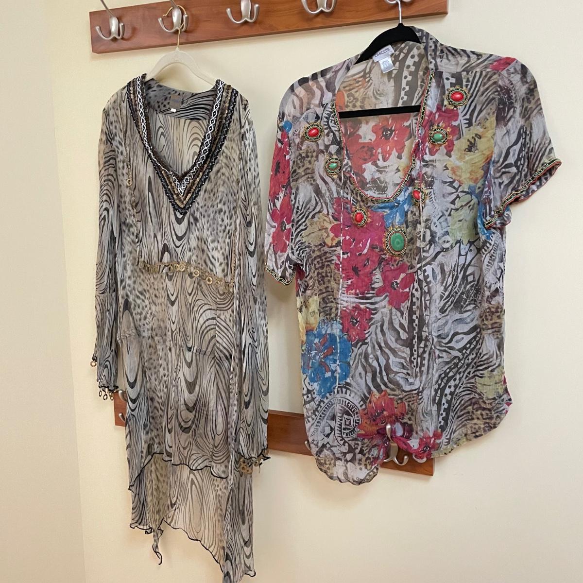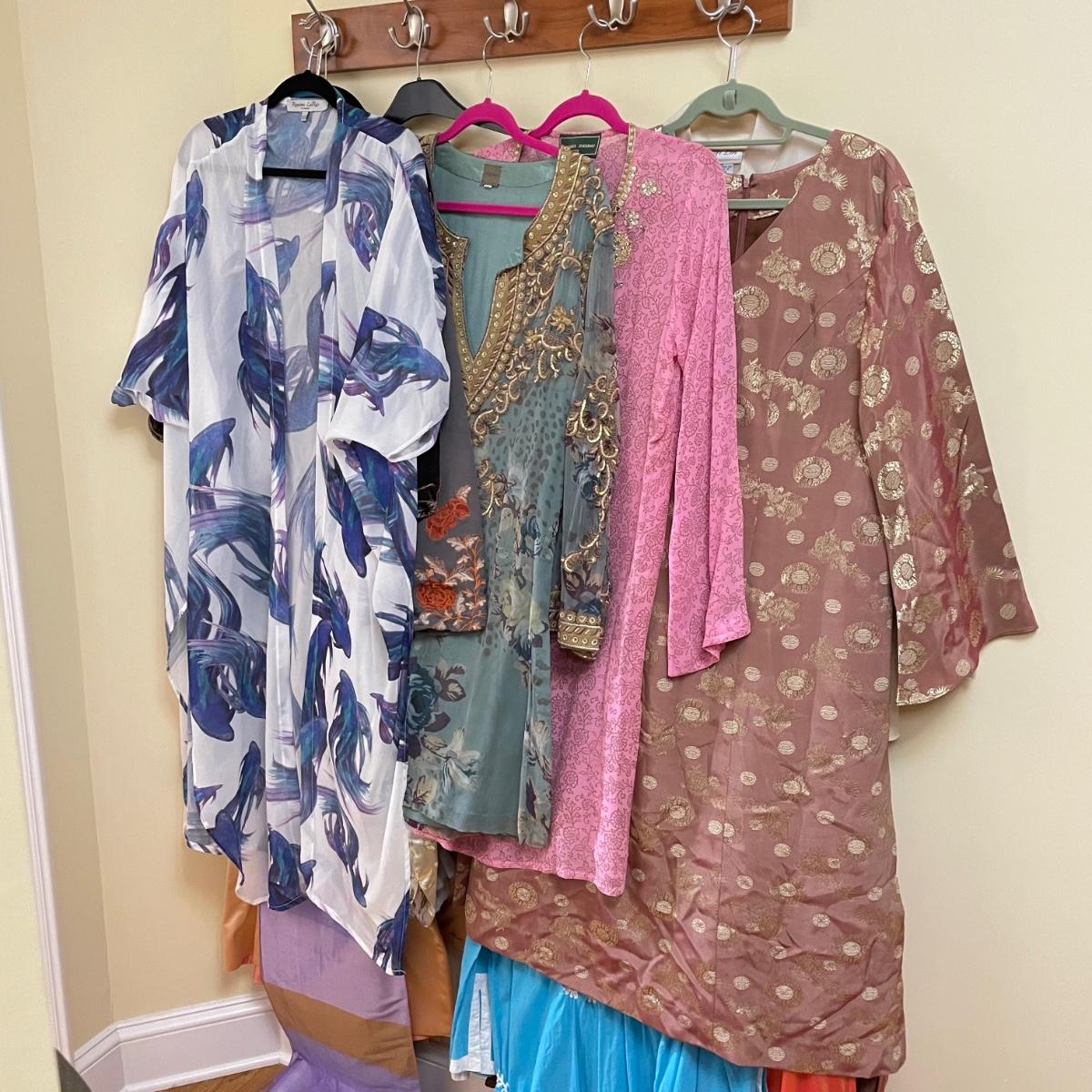 Large lot full of tunics, silky tops and flowing fashions. About 25 pieces, mostly tops, with a couple ensembles and even a silky pashmina, these fashions are loose fitting and flowing. Brands include Monisha Jaising, Gigi Moda, Peppermint Bay, Yi Lun and Zonda Nellis. See images. Sizes range from large to XXL.