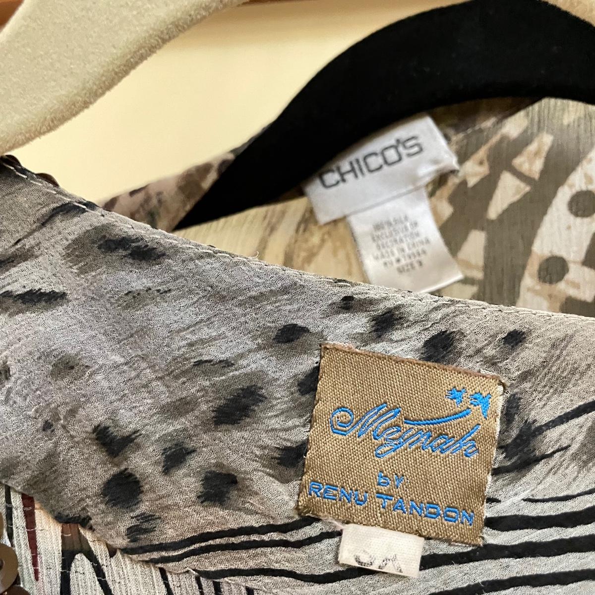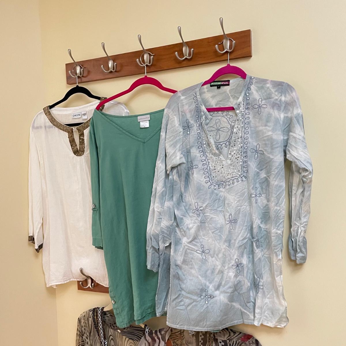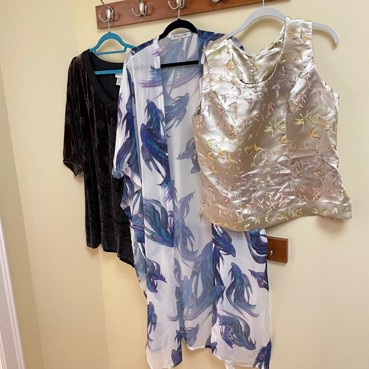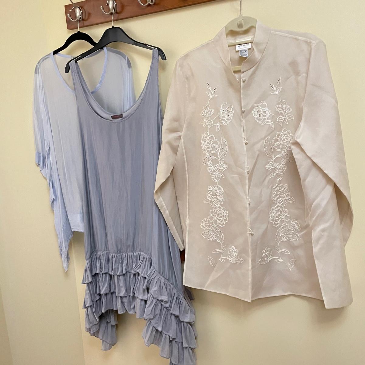 Large lot full of tunics, silky tops and flowing fashions. About 25 pieces, mostly tops, with a couple ensembles and even a silky pashmina, these fashions are loose fitting and flowing. Brands include Monisha Jaising, Gigi Moda, Peppermint Bay, Yi Lun and Zonda Nellis. See images. Sizes range from large to XXL.