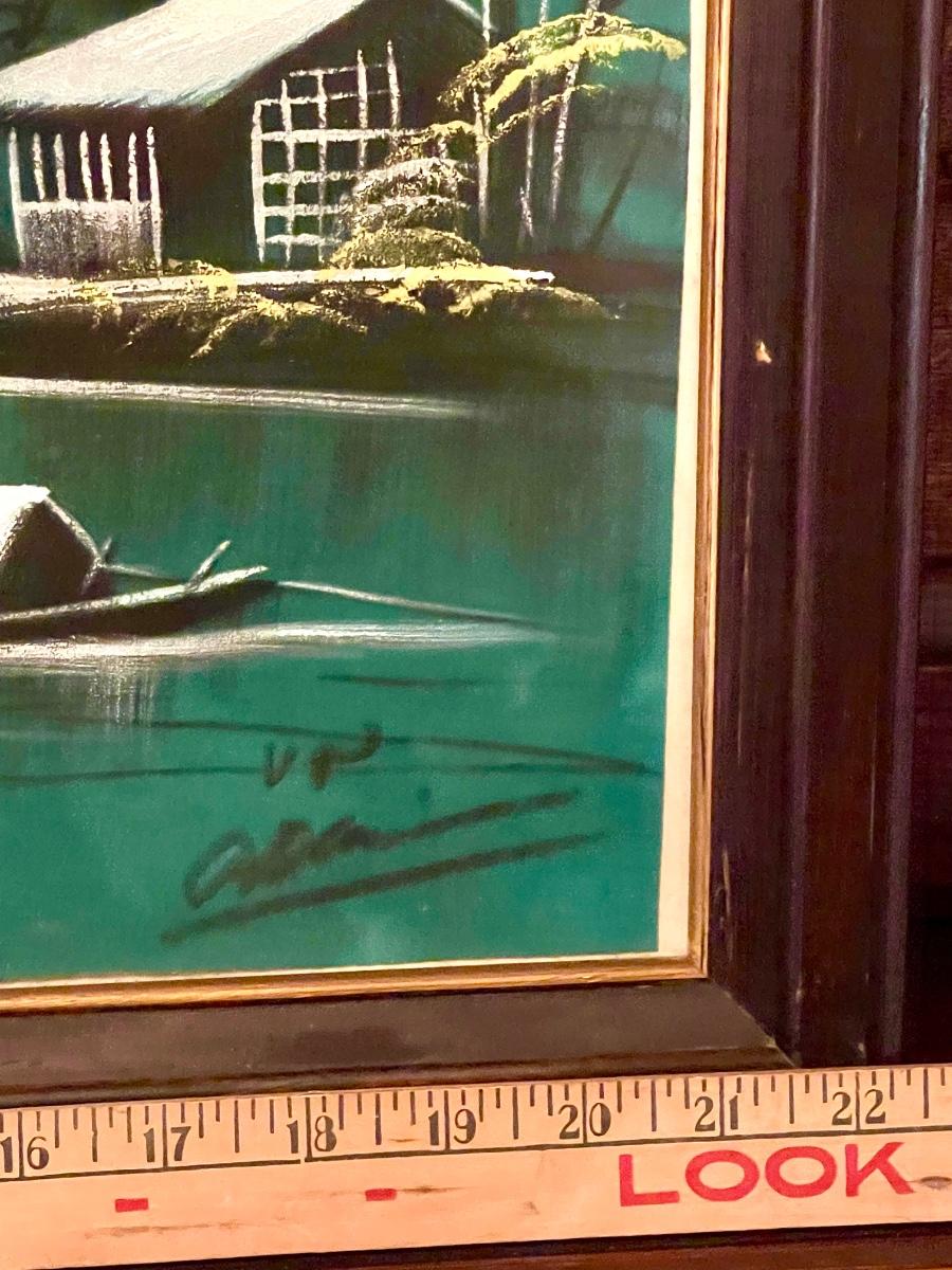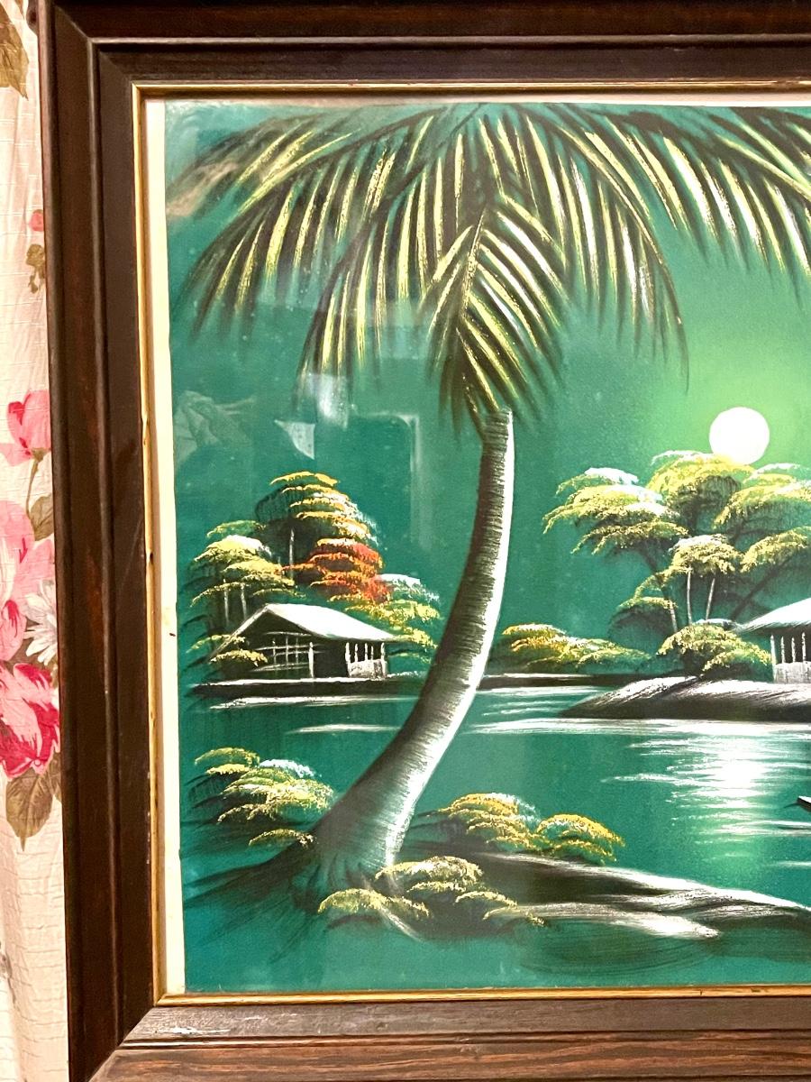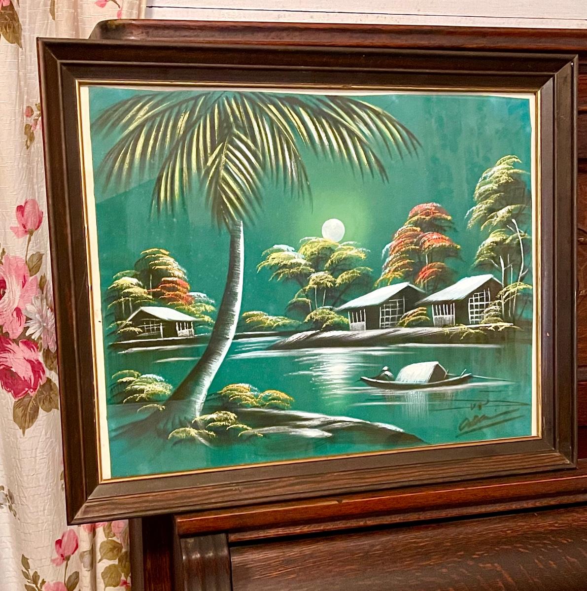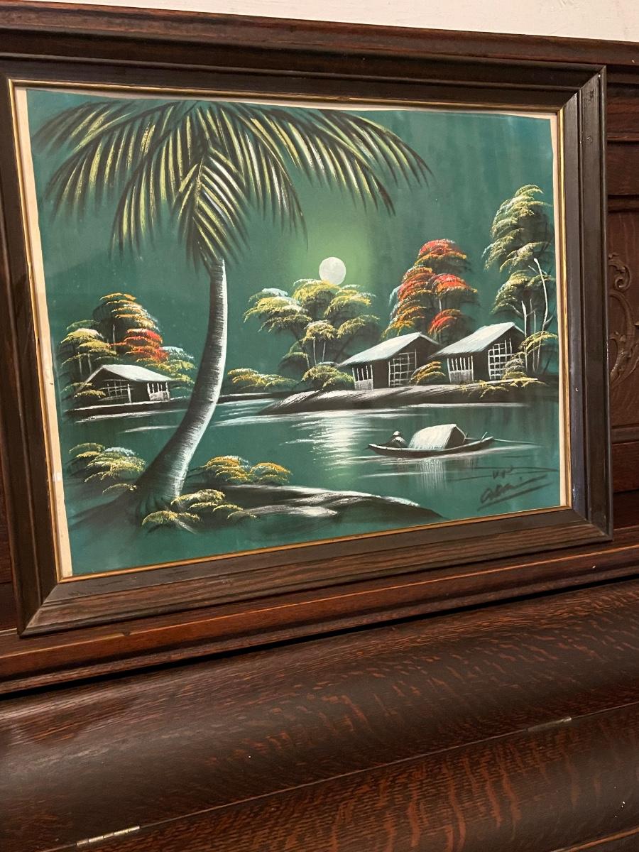 Lovely silk print and the colors are so vibrant. Frame mat needs to be adjusted in the back. Beautiful scene! Nice vintage art!