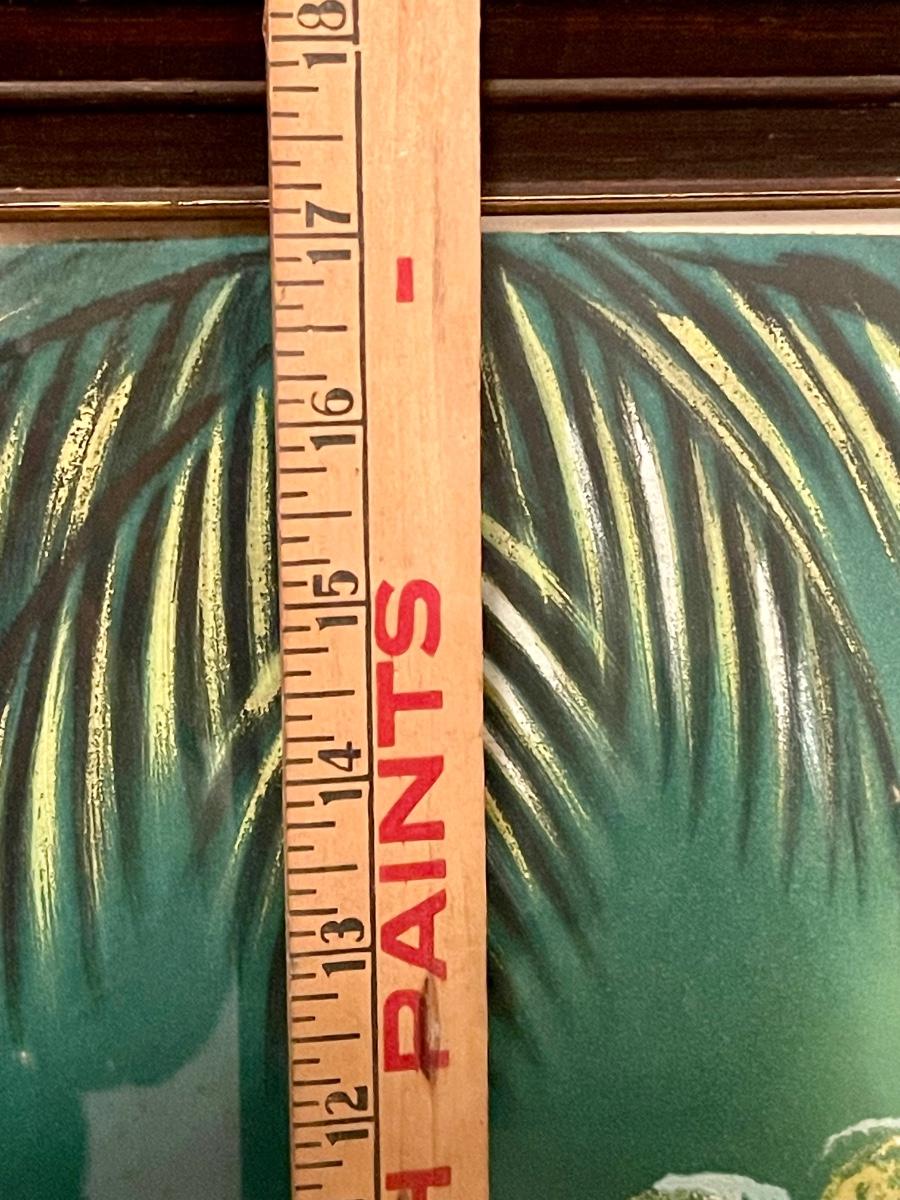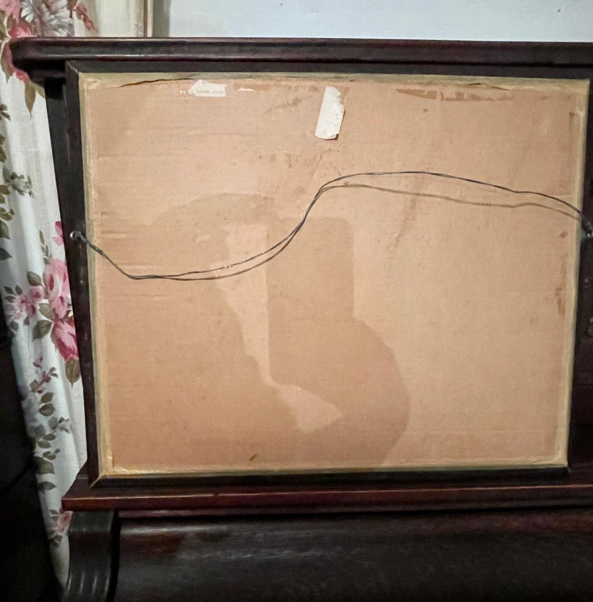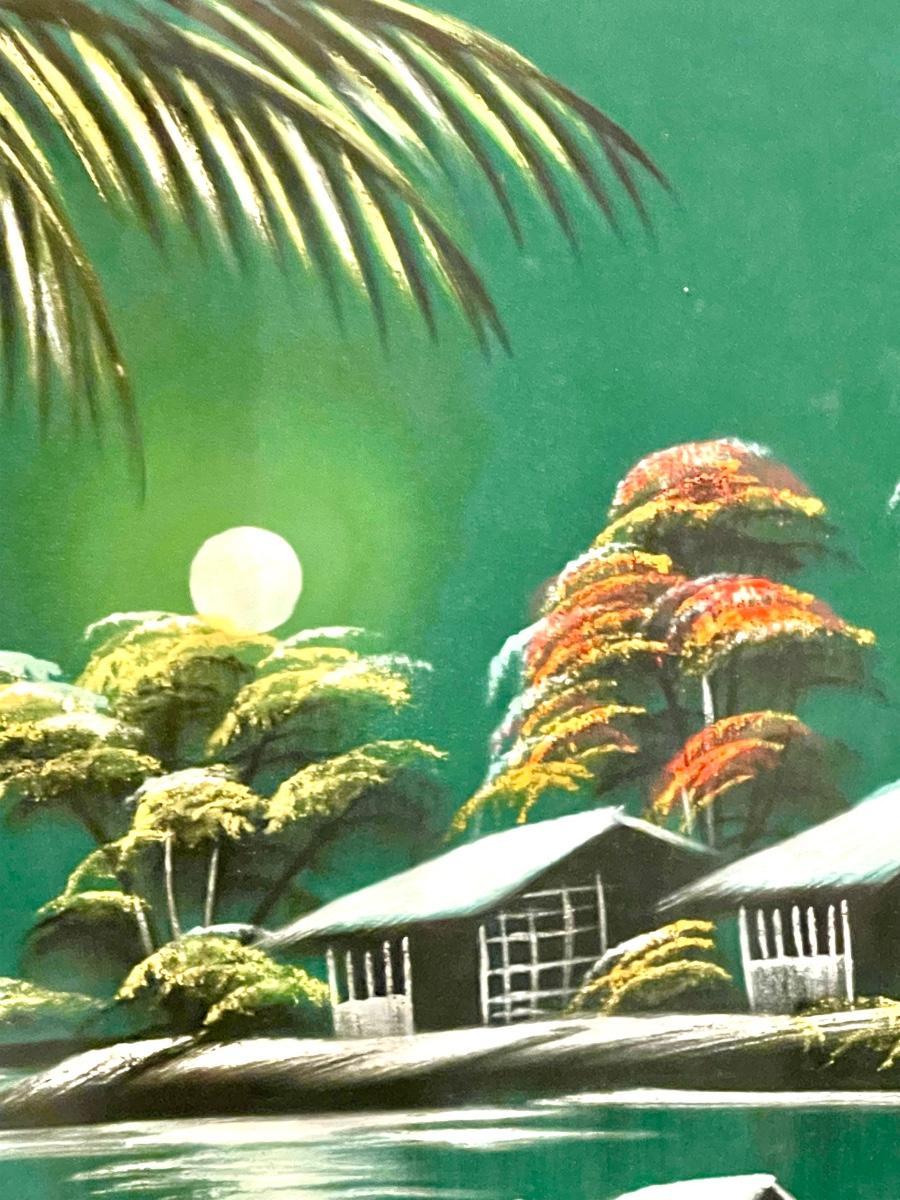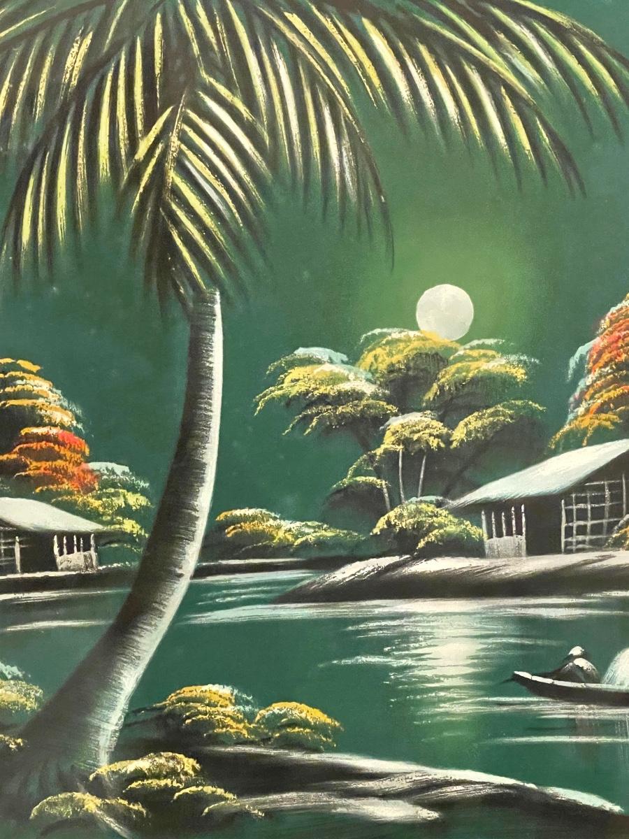 Lovely silk print and the colors are so vibrant. Frame mat needs to be adjusted in the back. Beautiful scene! Nice vintage art!