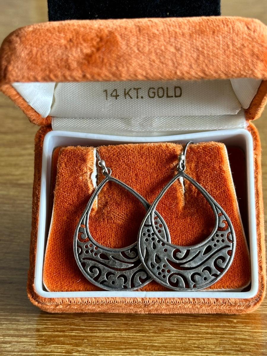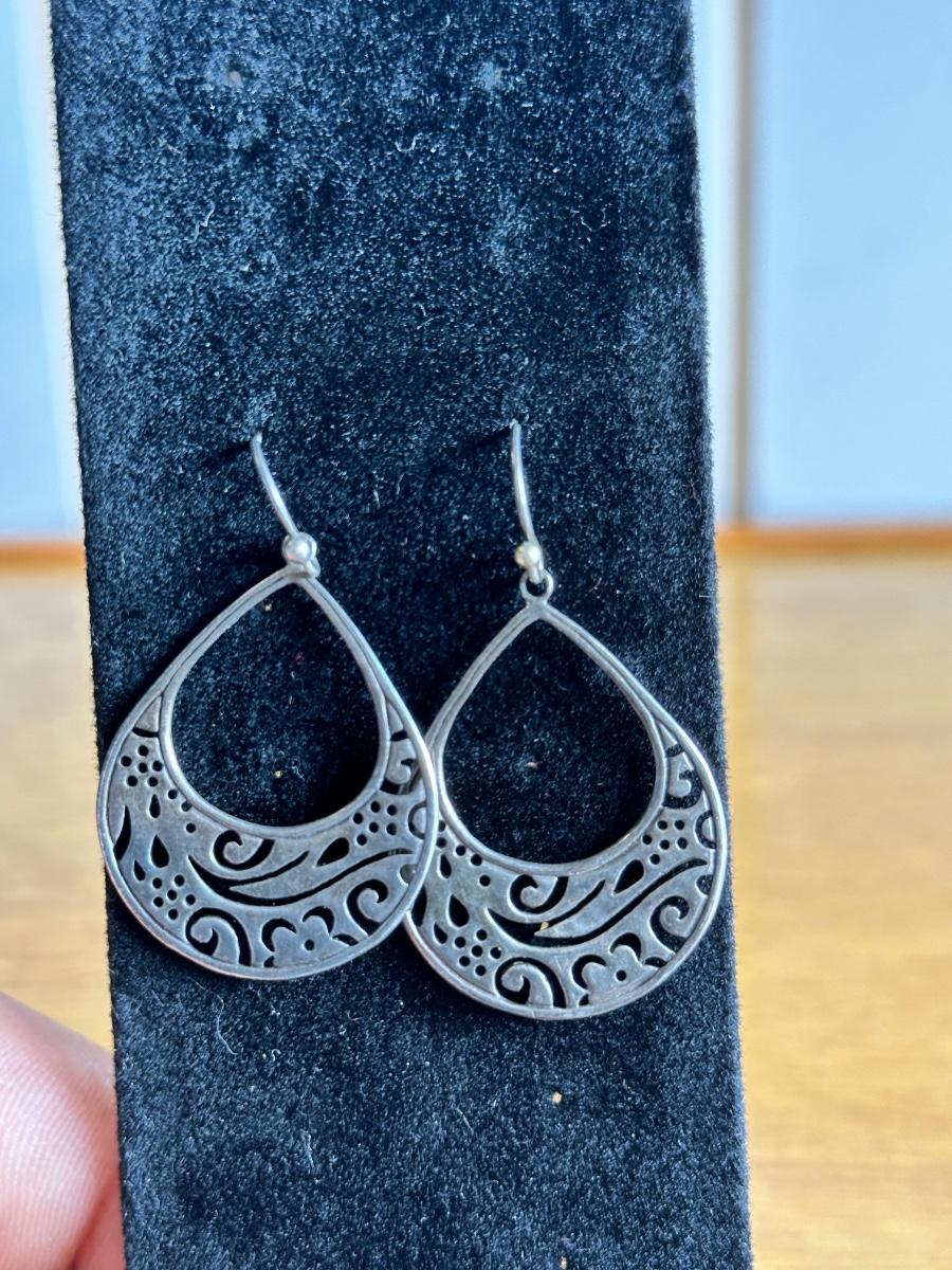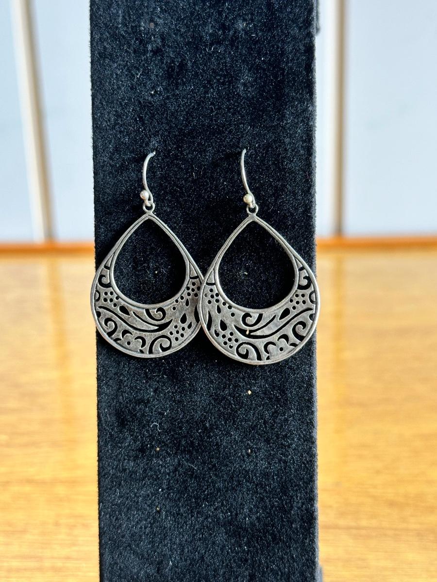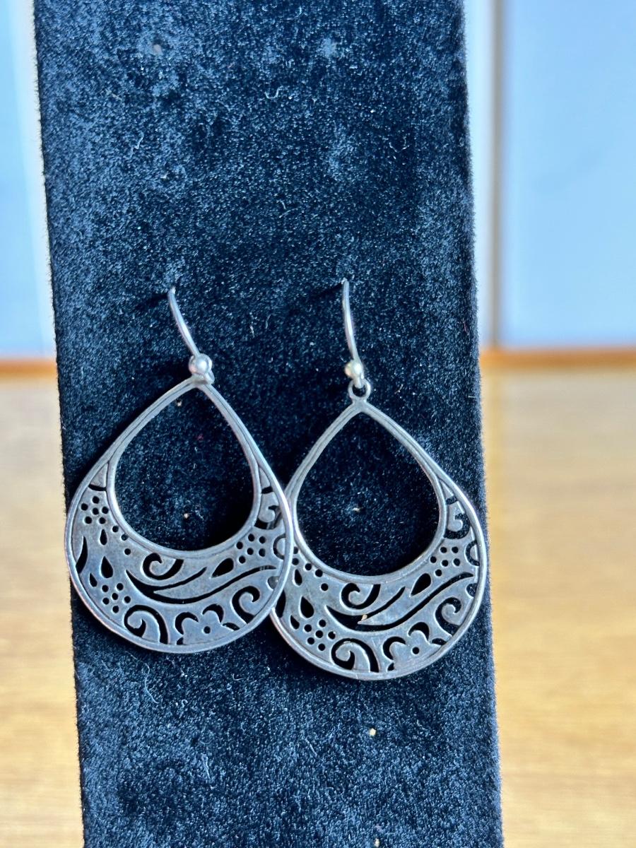 Catalog description “See right through the carved design of these matte Sterling Silver Earrings into your cutting-edge look on French wires.”