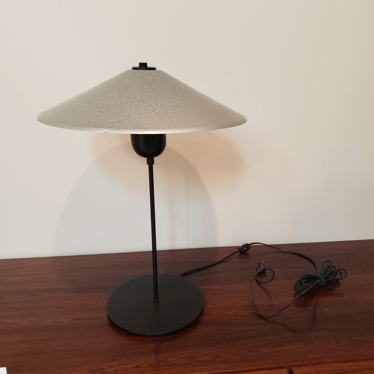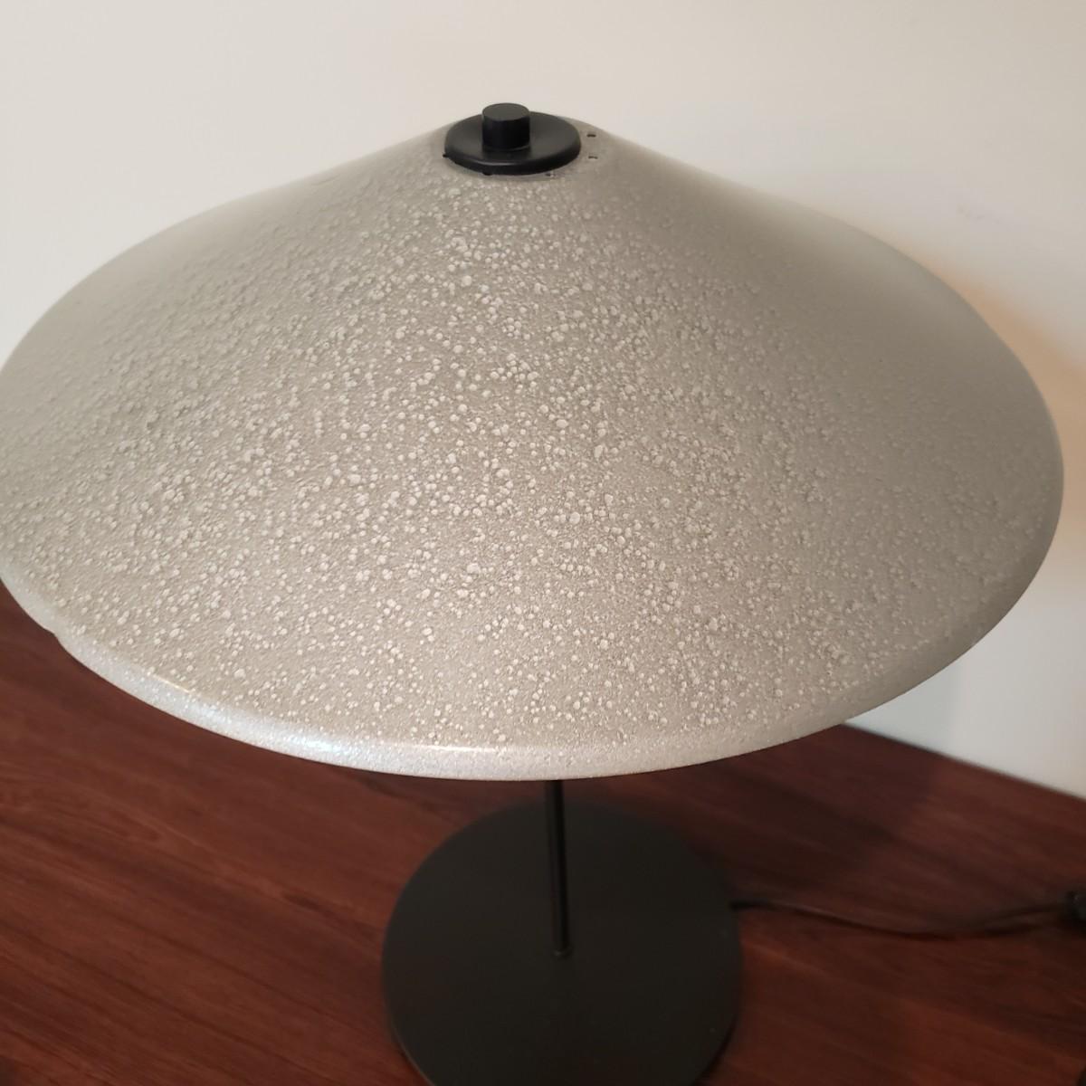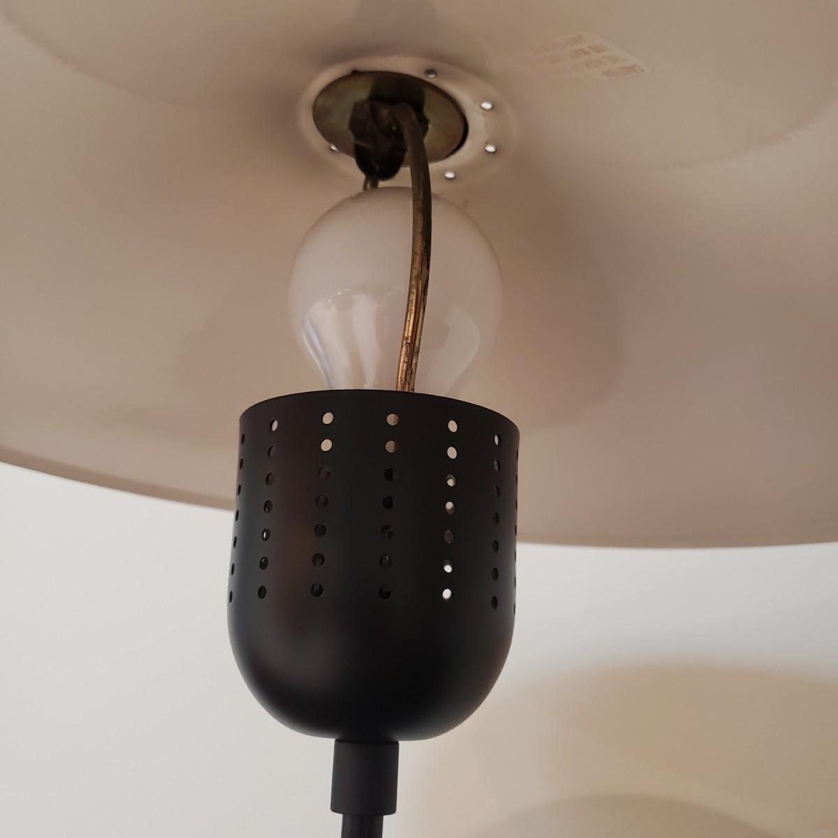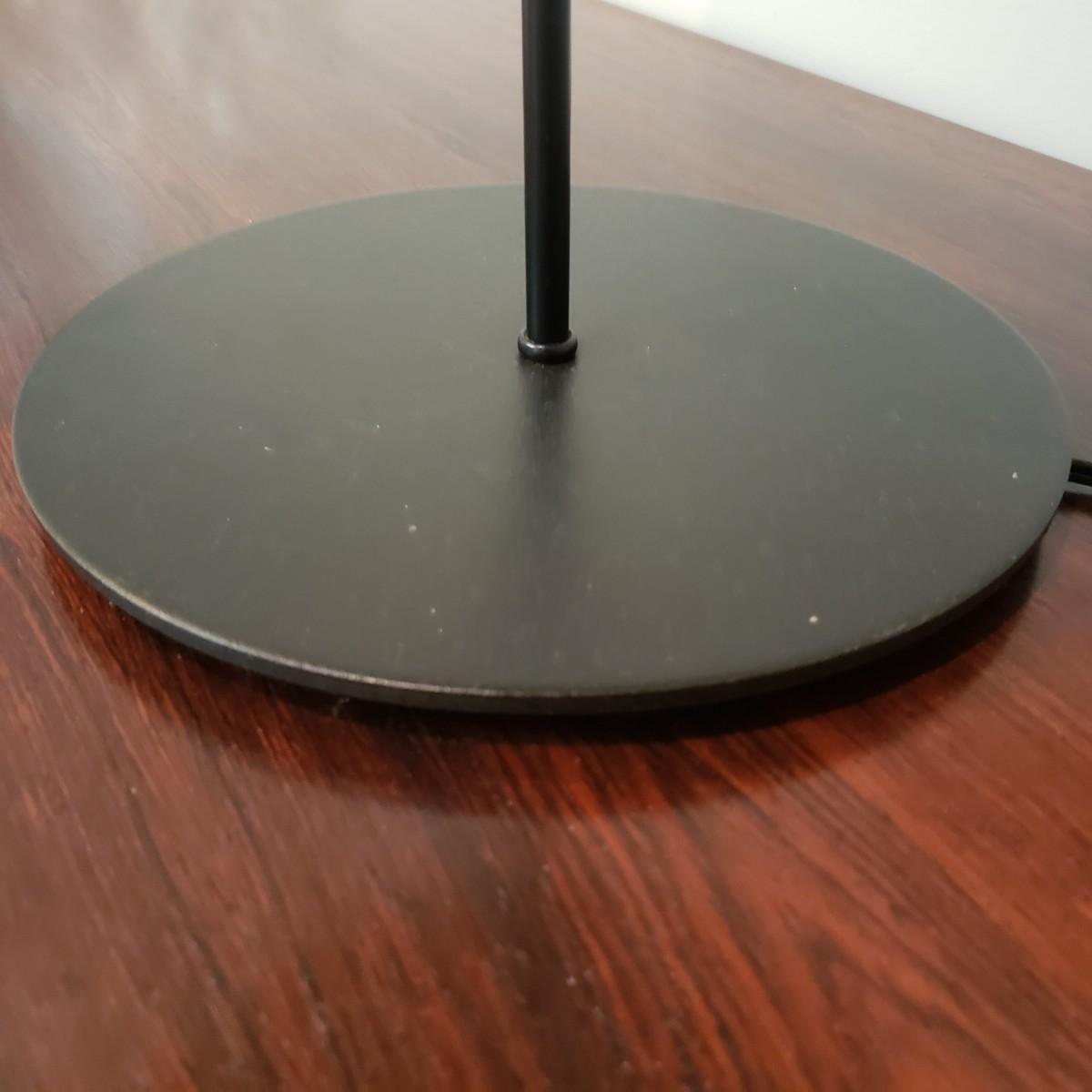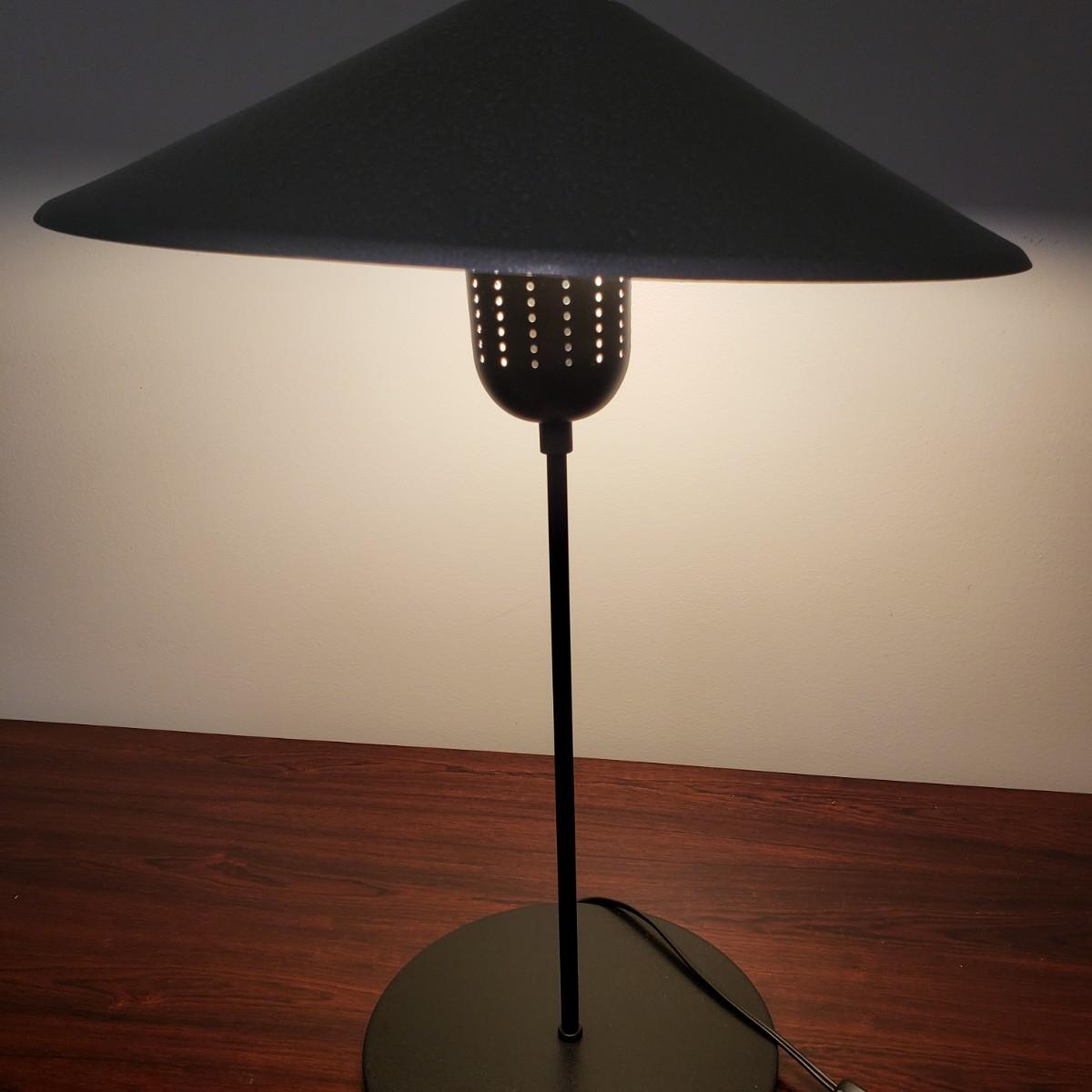 This all metal lamp measures 9"D x 22"H. The metal lamp shade measures 17"D across. There is a tiny dent in the lamp shade, see picture. The lamp powered on when plugged in.