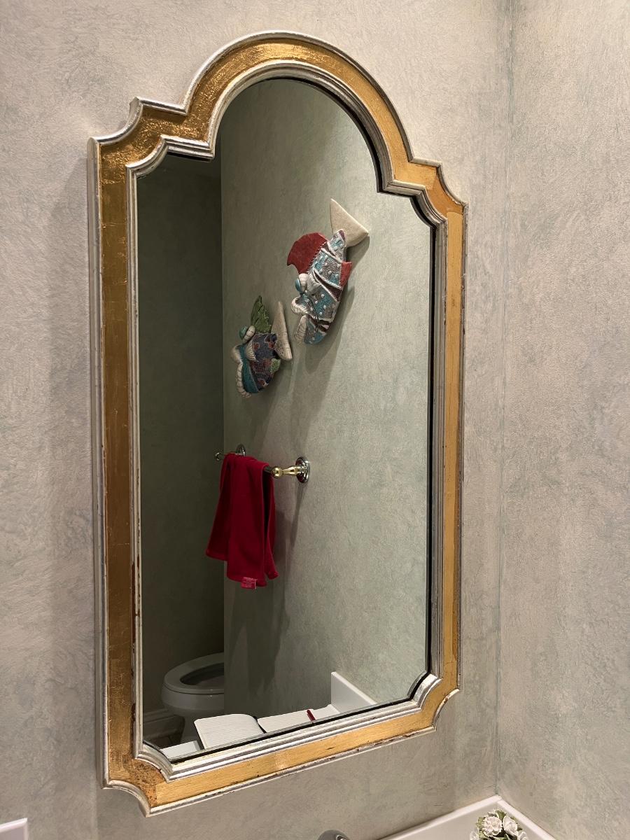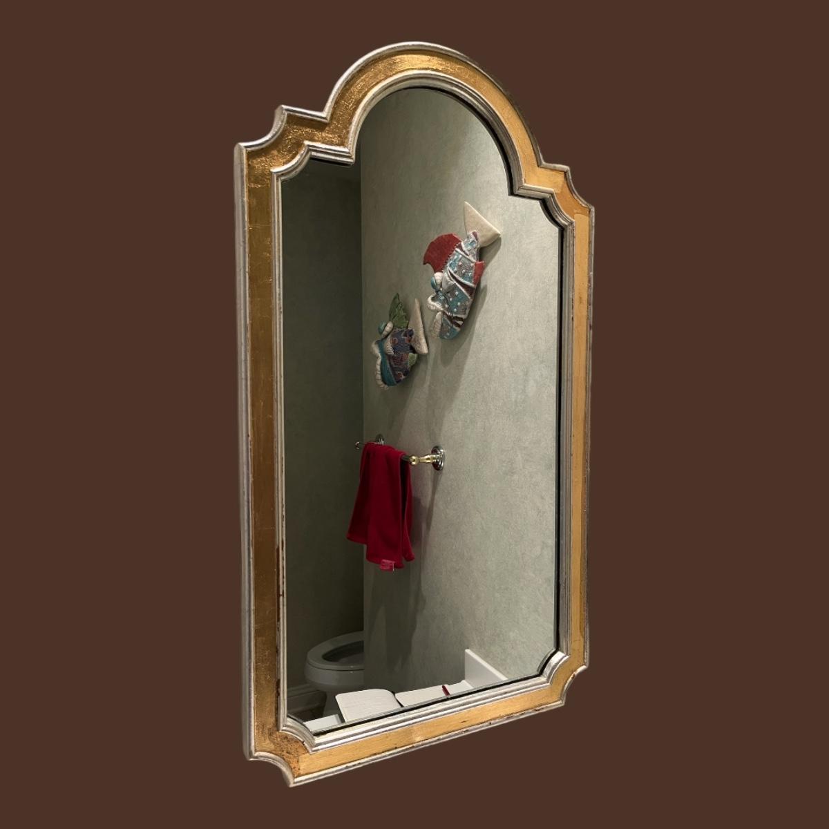 37"h x 28.5"w--such an elegant mirror! Rectangular on the bottom, curved on the top with bumped corners, kinda Chinoiserie, kinda Chippendale, gold with silver trim. I love this mirror!