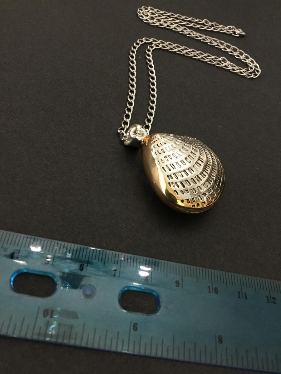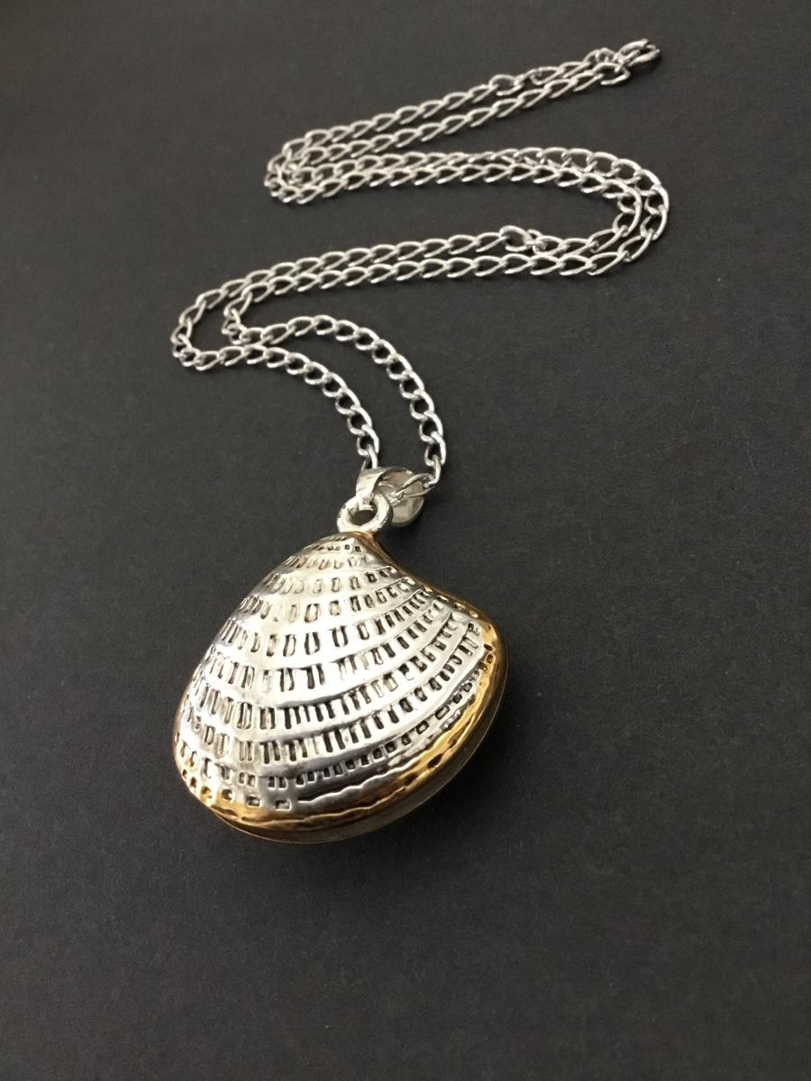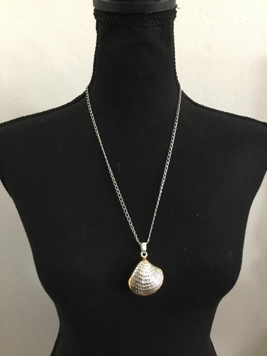 Silver and gold tone, vintage, hollow, clam shell pendant necklace
