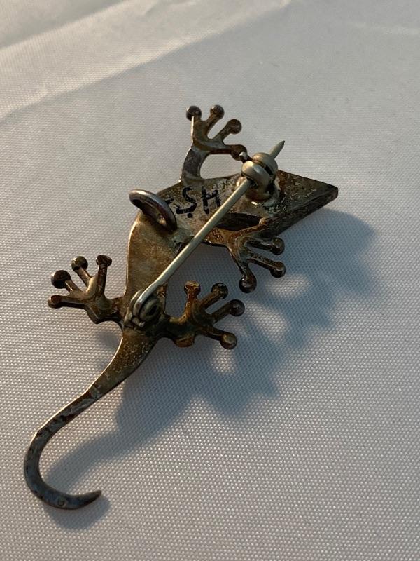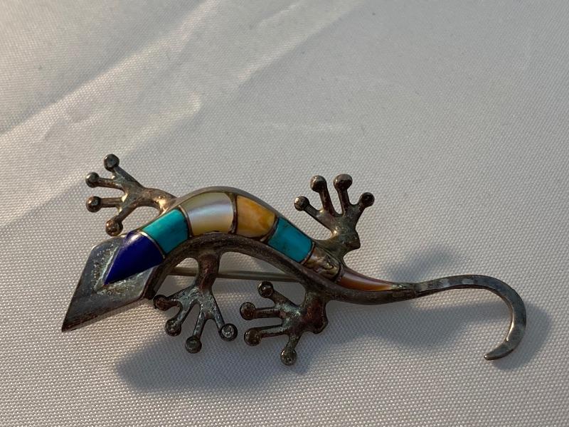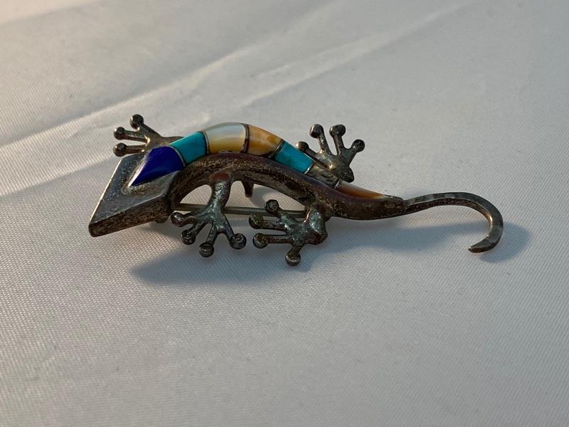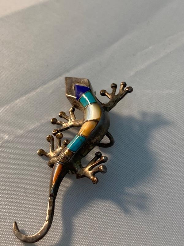 Southwestern Lizard Pin Pendant. Silver setting. Multi stone inlaid, looks like lapis, turquoise, mother of pearl, orange agate, and maybe moonstone at the very end. There are some marks on the underside of the tail but can not make them out. More then likely this is sterling, but can not confirm from marks. 1.75" length.