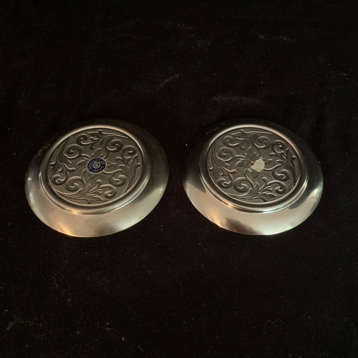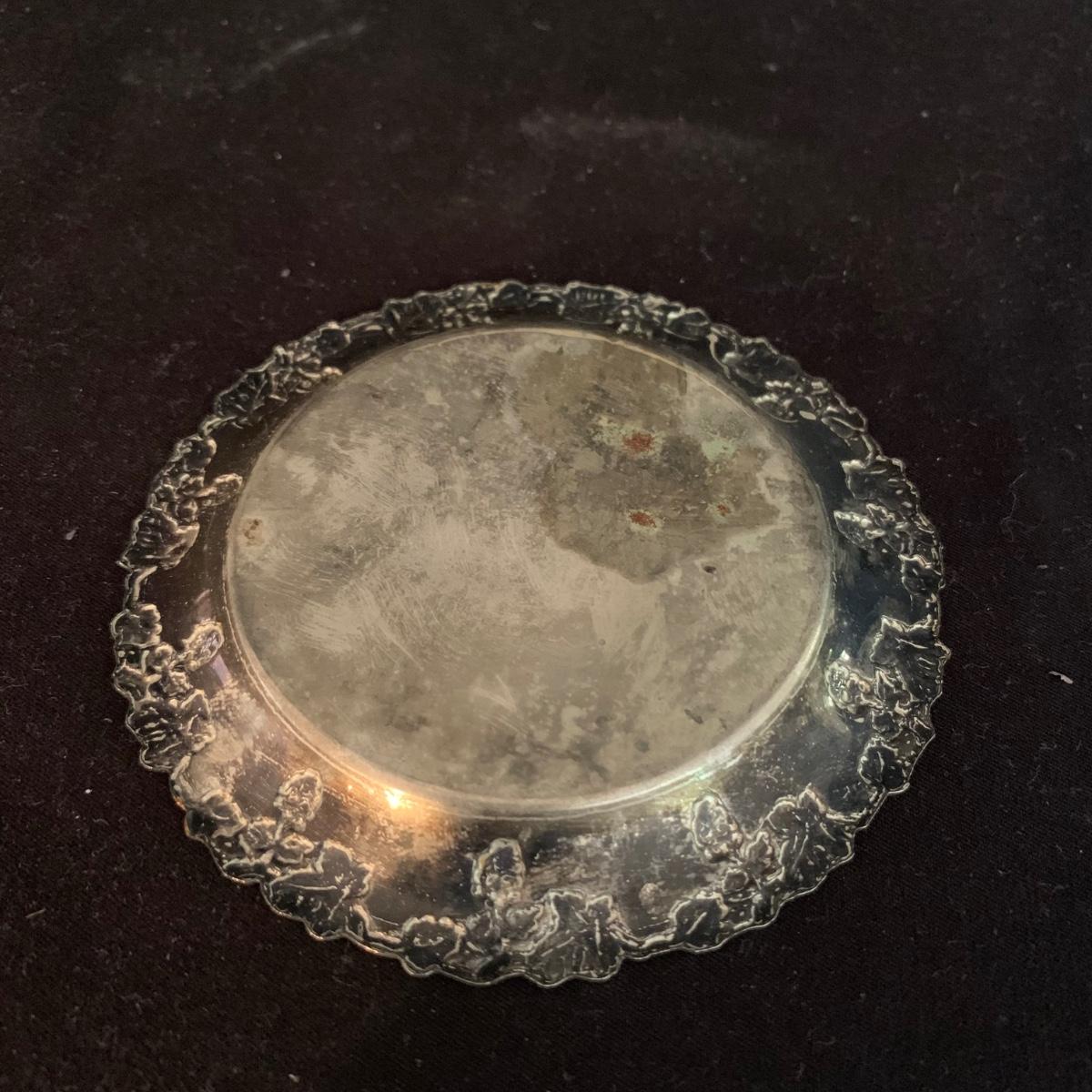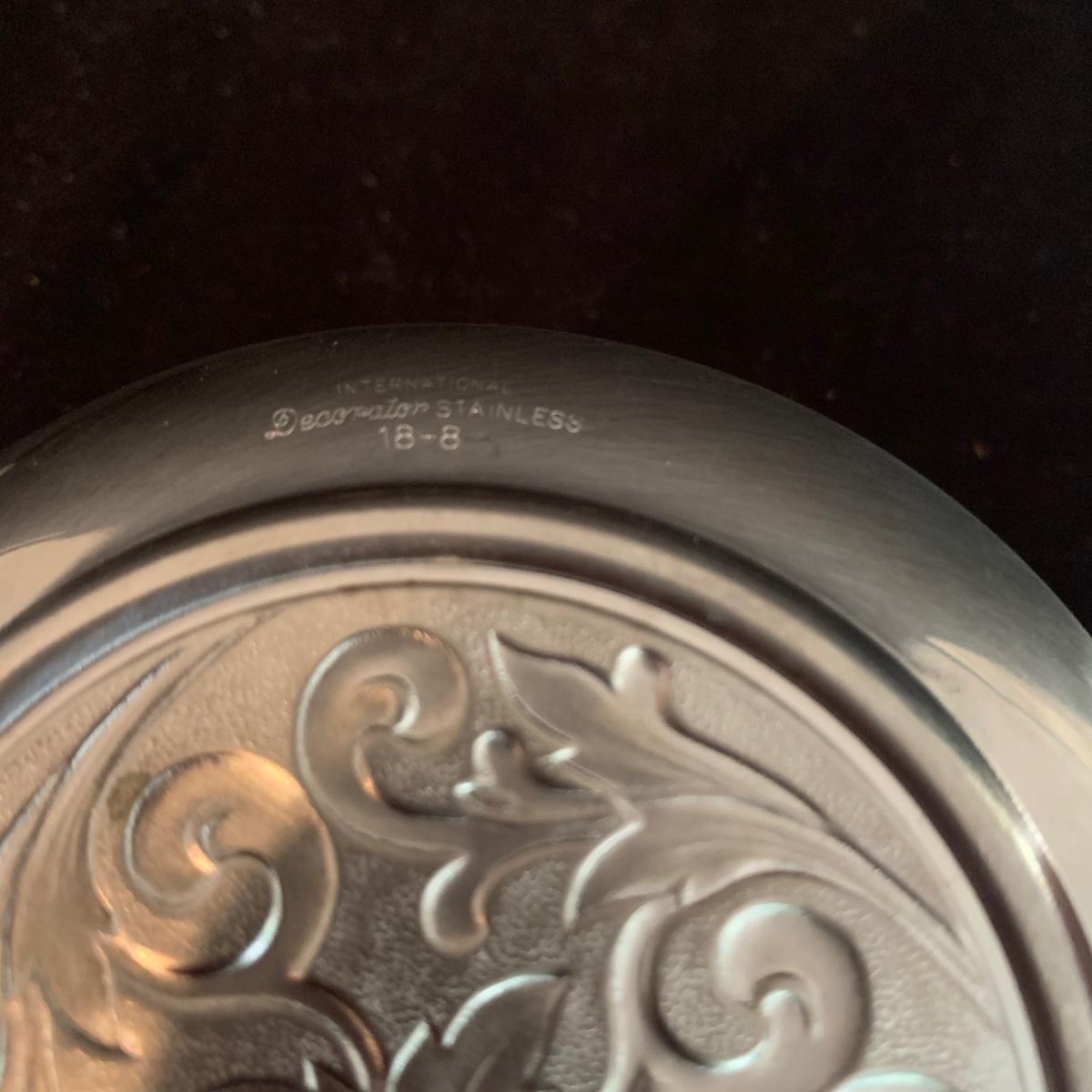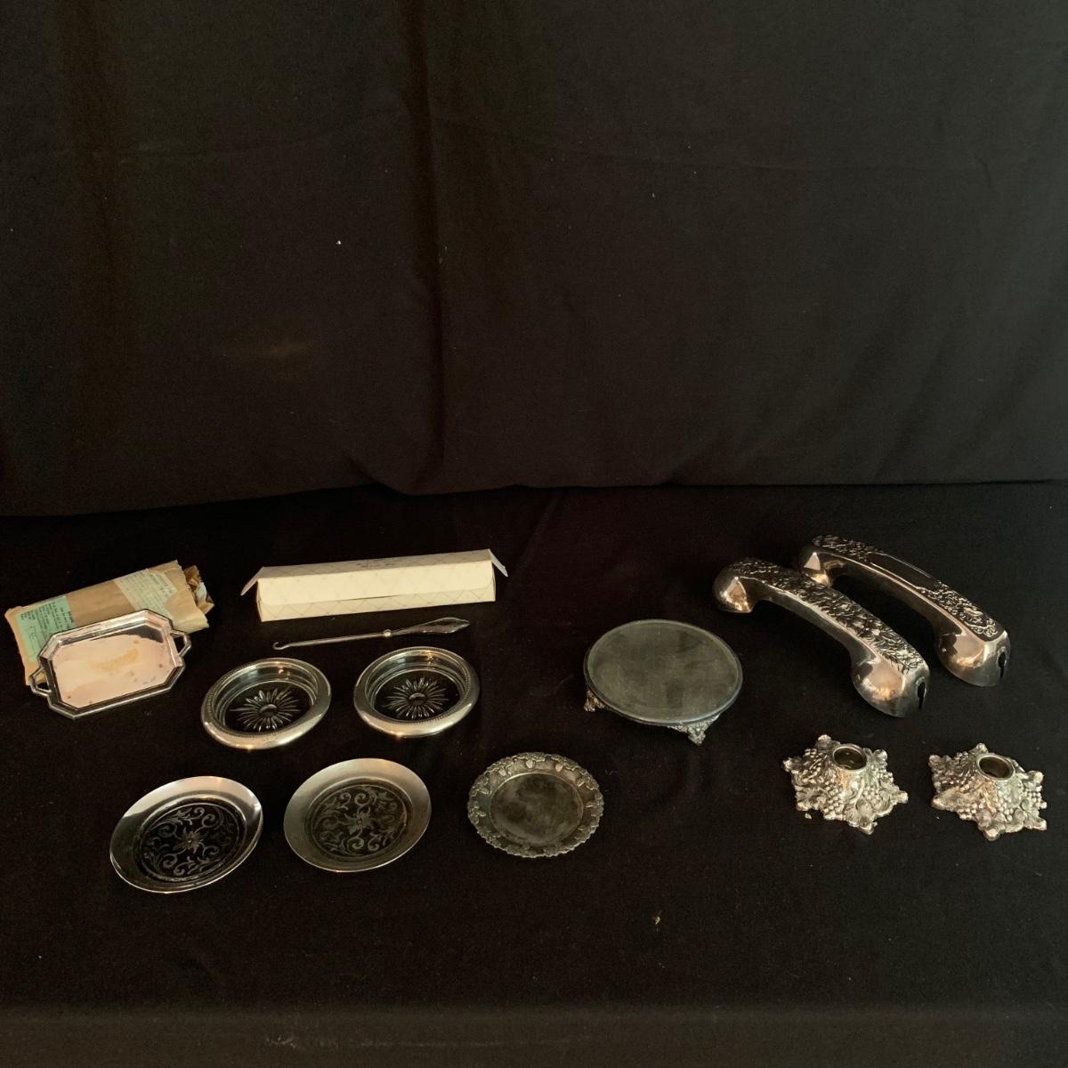 This lot includes a large array of silverplate and stainless steel decorated items. Included are ashtrays, candle holders, phone covers, mini trays, and more. The phone covers are silver plated. Some of the trays are stainless steel and some are silverplate. The largest tray measures about 5in. Shipping available.