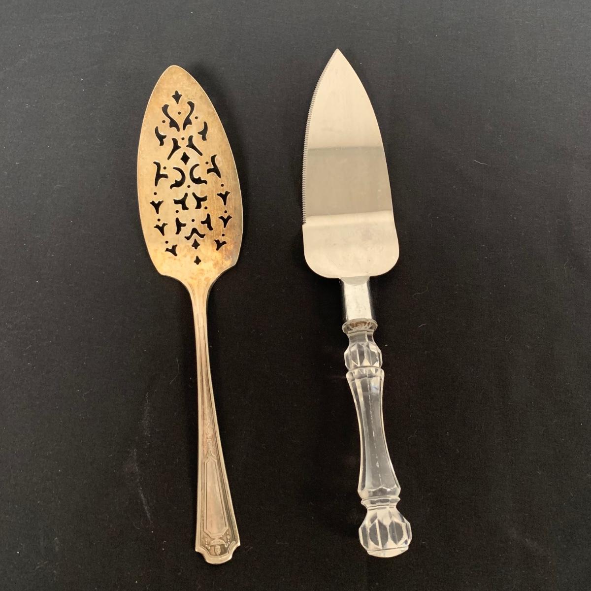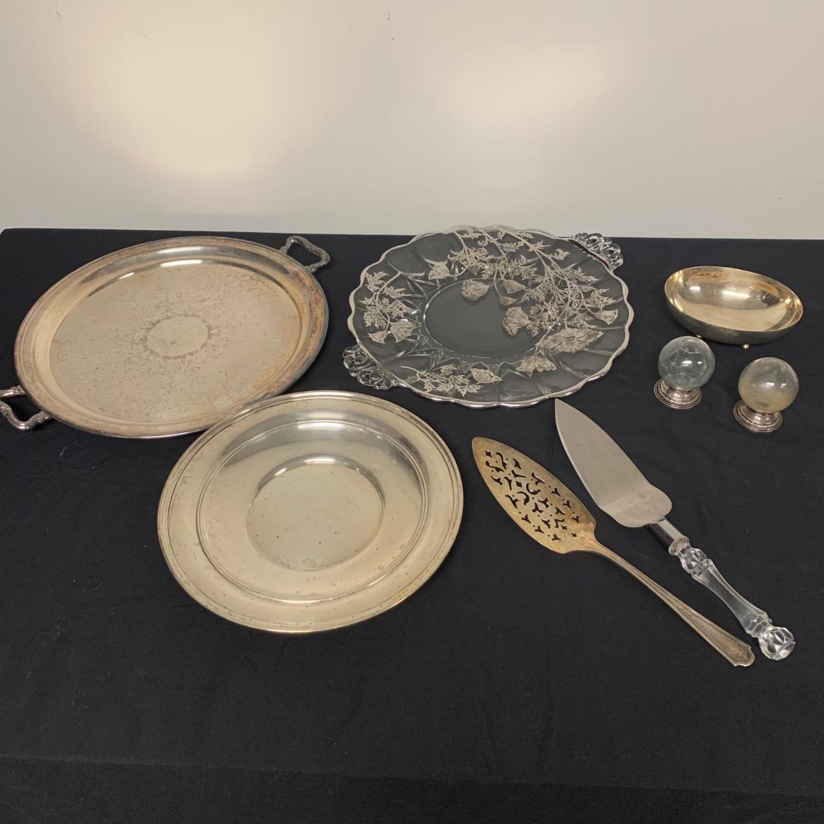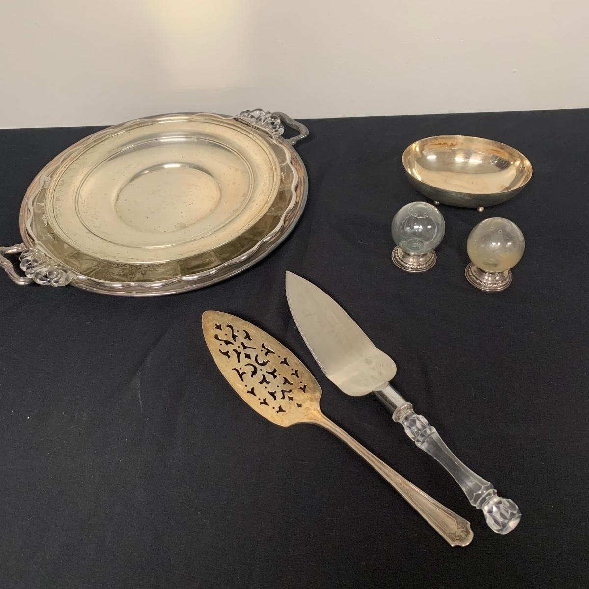 This lot includes serving trays, two cake servers, a pair of salt and pepper shakers, and a small bowl. The lot features silver pieces, stainless steel pieces, sterling pieces, and more, see images. Some of the pieces need to be cleaned and polished. The largest serving tray measures about 12in x 14in. Shipping available.