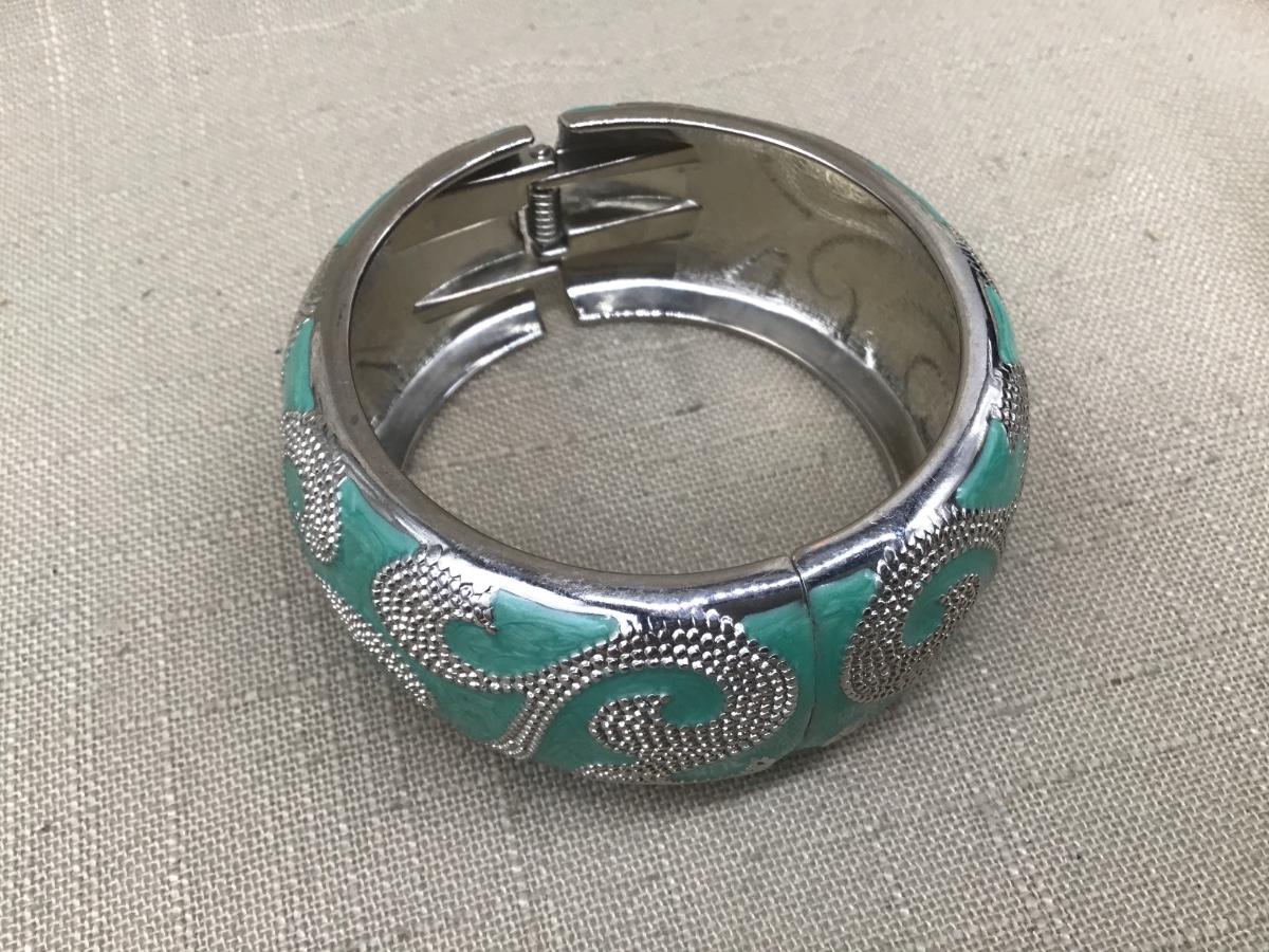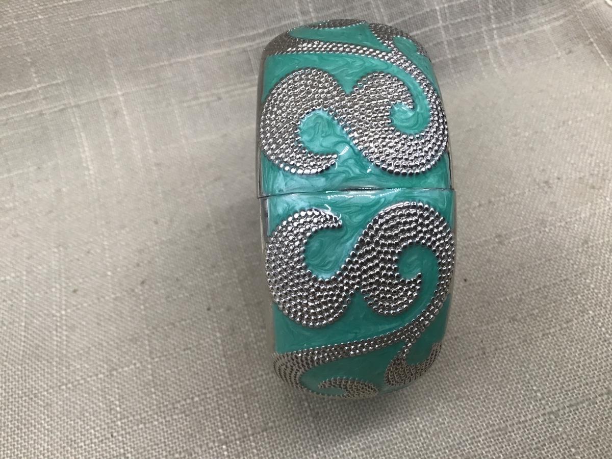 SILVER AND TEAL WIDE ENAMELED HINGED CUFF BRACELET
