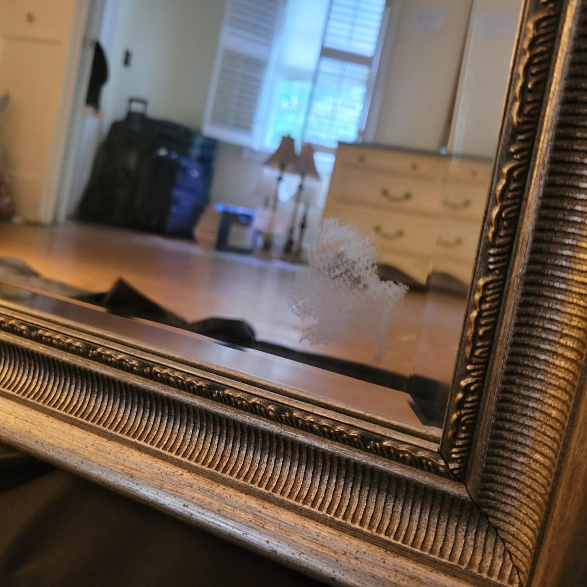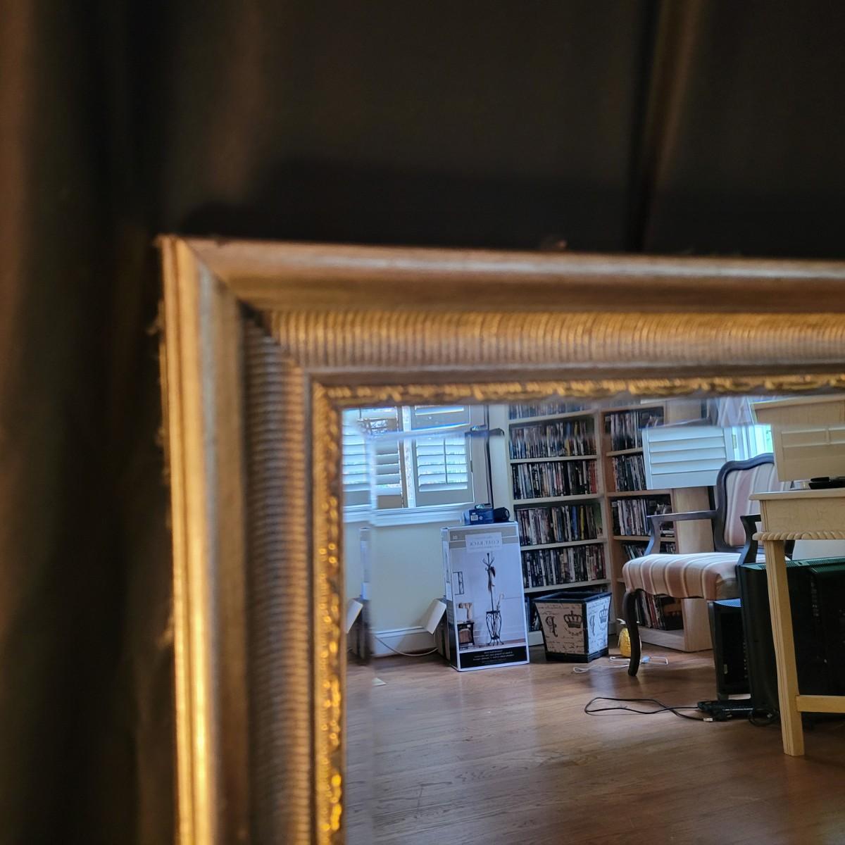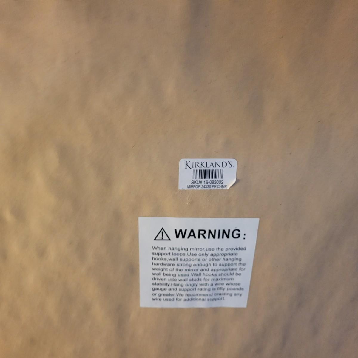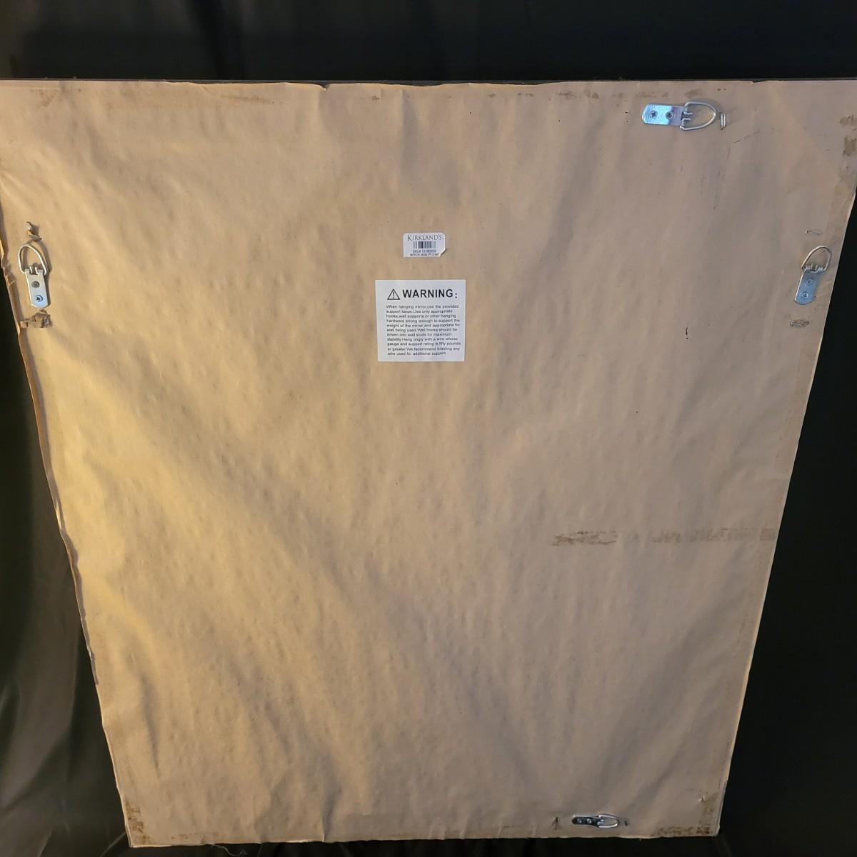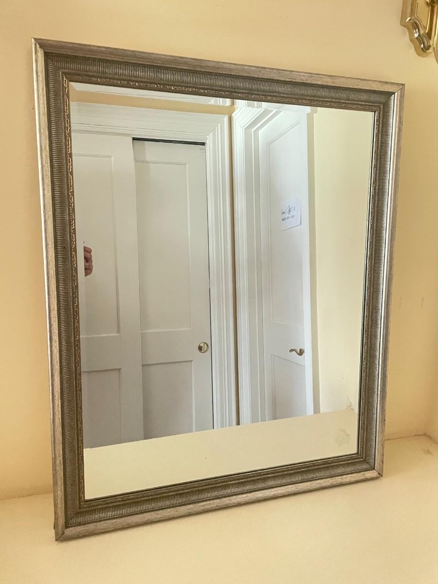 18" x 24" mirror with a .5" bevel in a silver-colored resin like material frame that is about 2" wide. Hardware is attached to hang either vertically or horizontally. A small .5" scratch appears on the mirror. Local pickup only