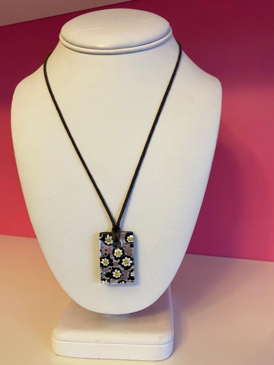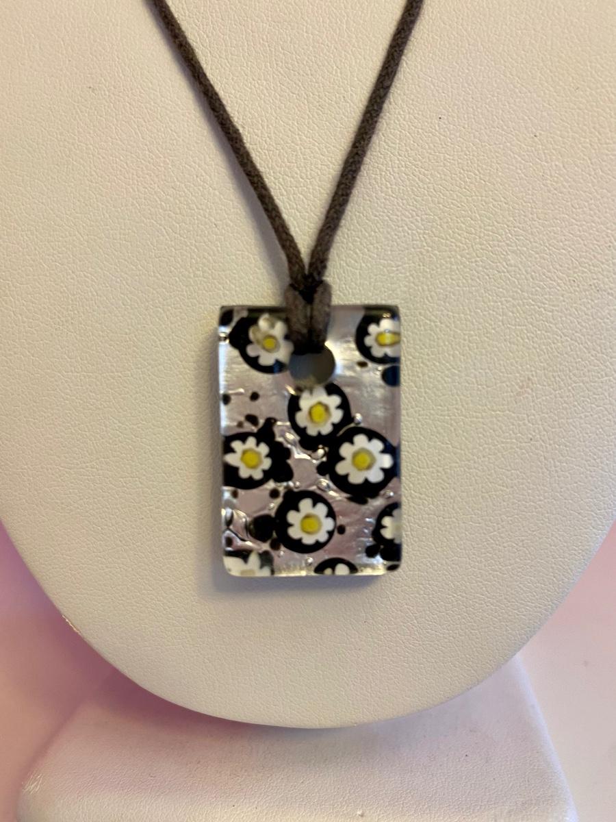 Silver Black and White Sunflower Glass Necklace on Leather Strap