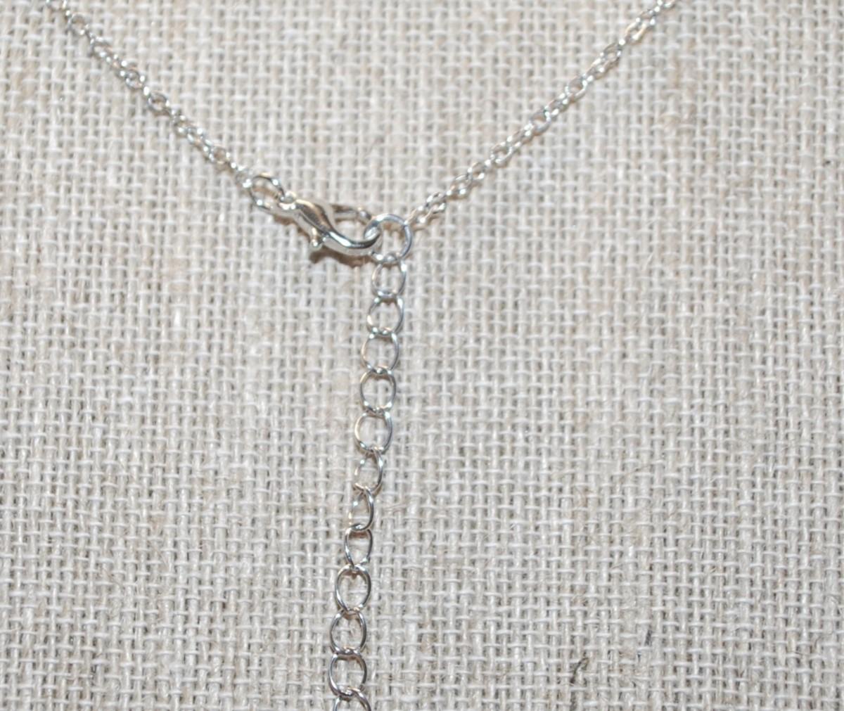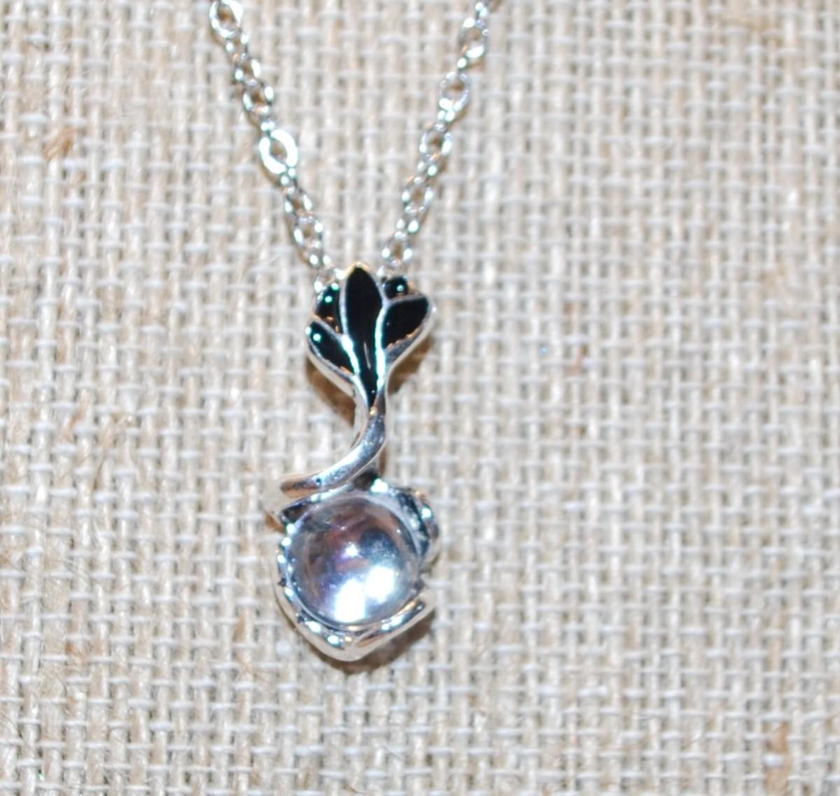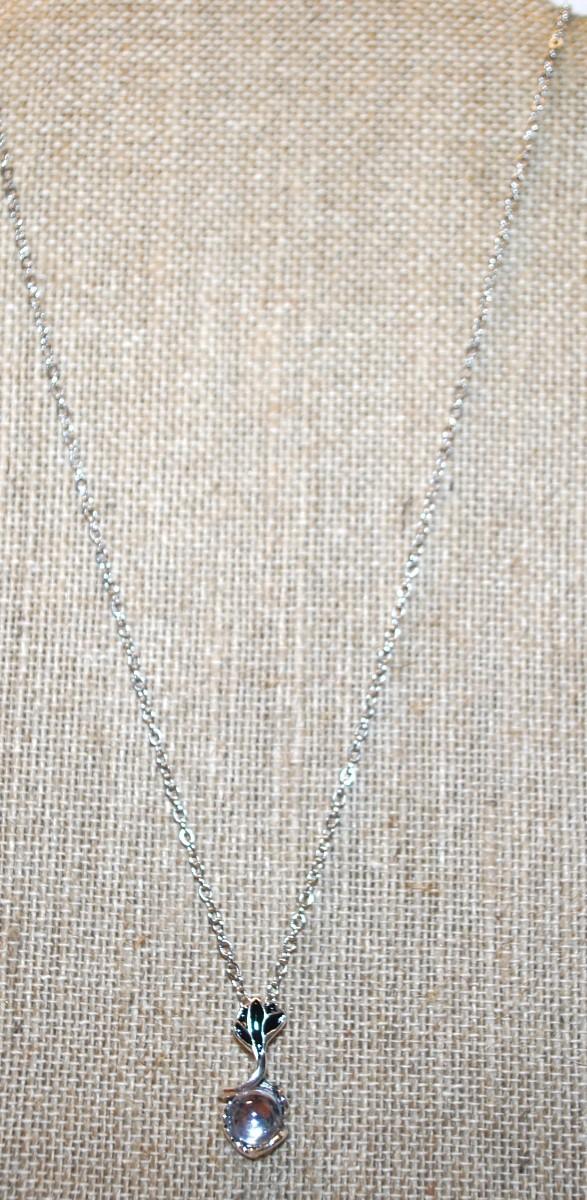 Silver & Black Rose PENDANT (1" x ½") with a Clear Round Transparent Stone on a Silver Tone Necklace Chain 18" L