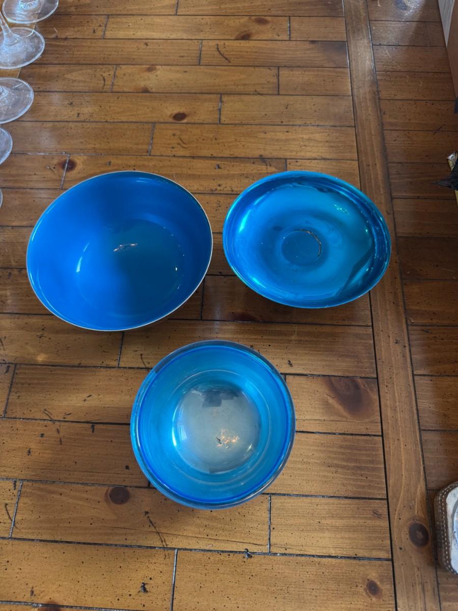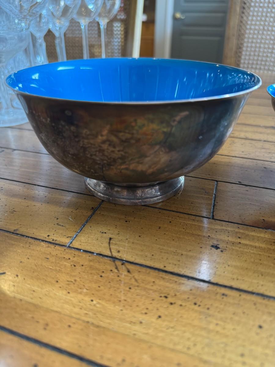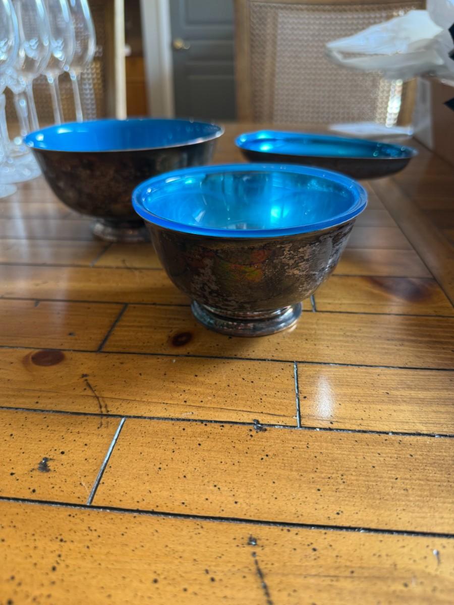 Striking set of three mid-century silver-toned footed bowls with vibrant blue glass interiors. Unique accent bowls or serving pieces.