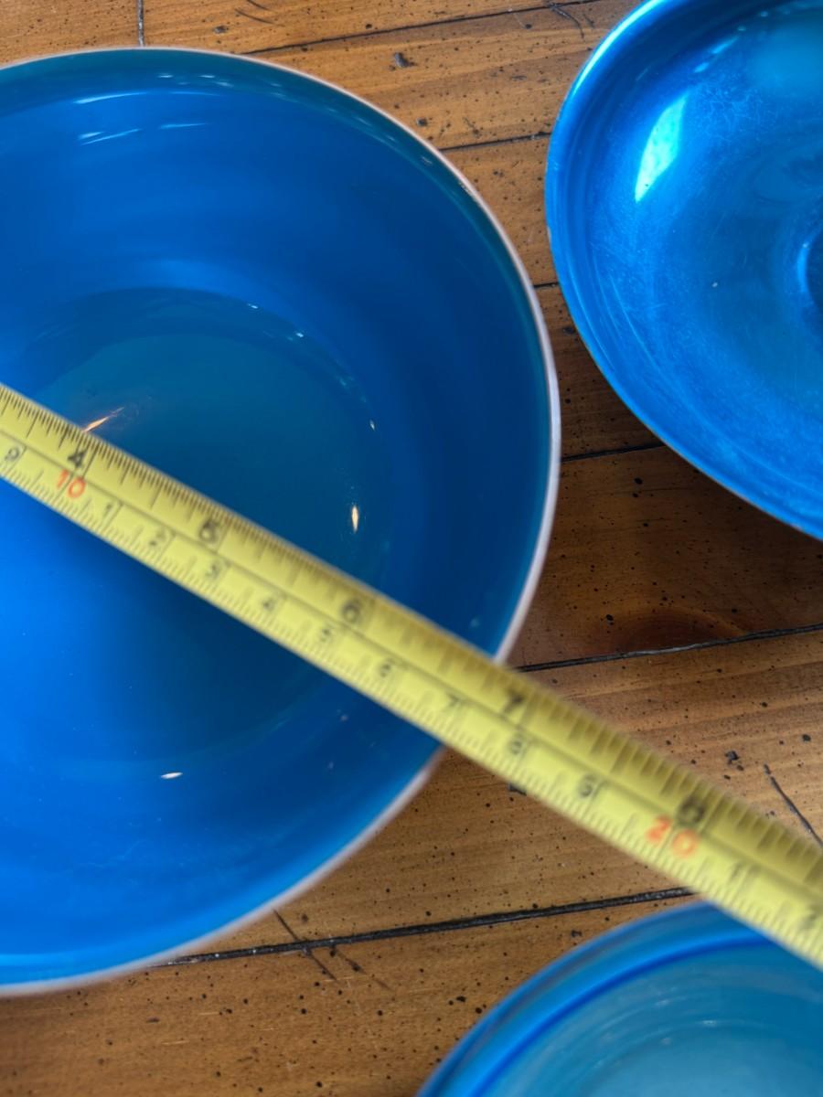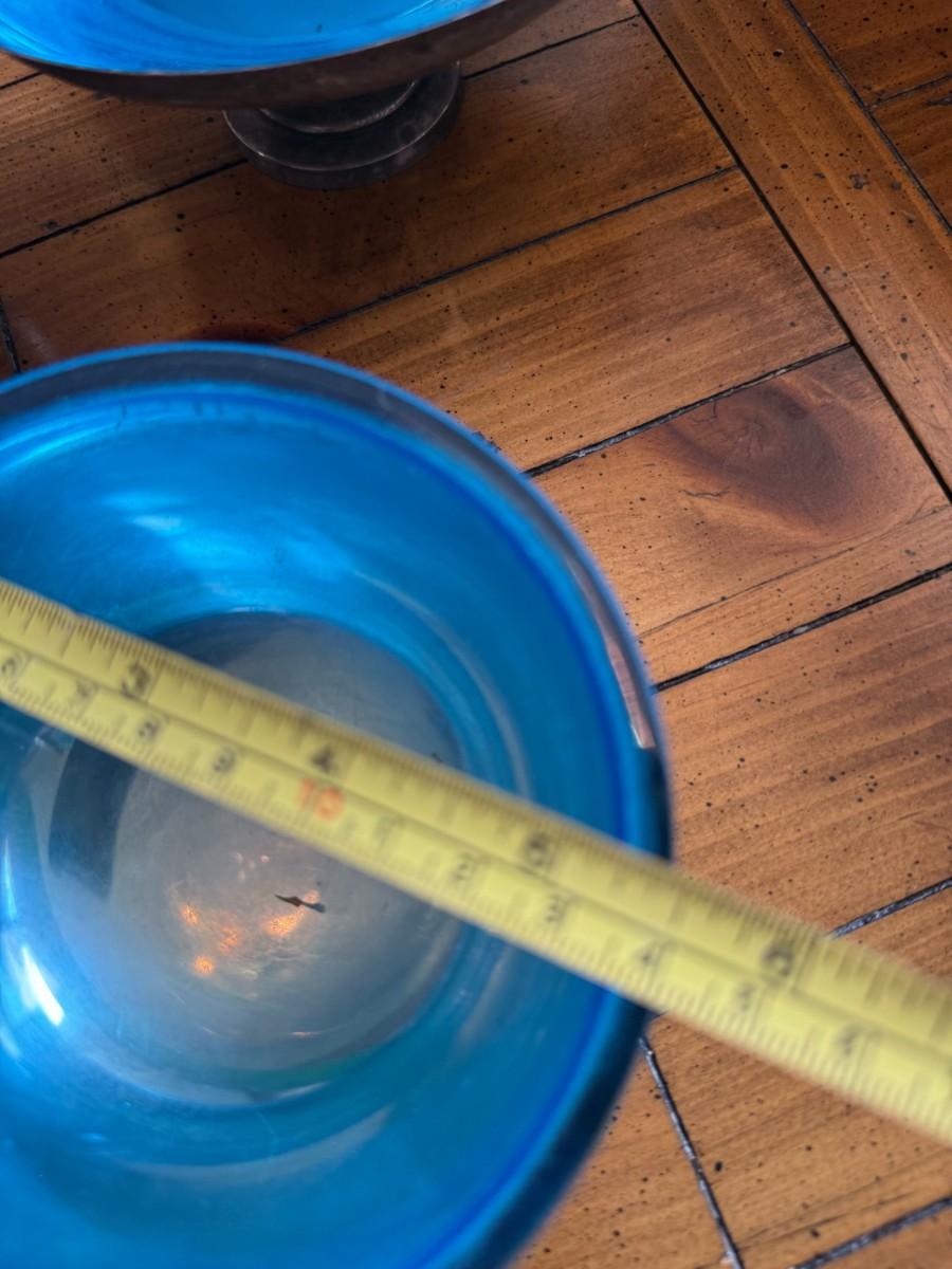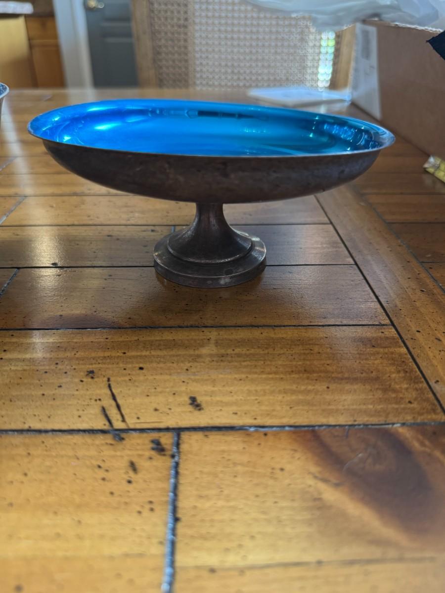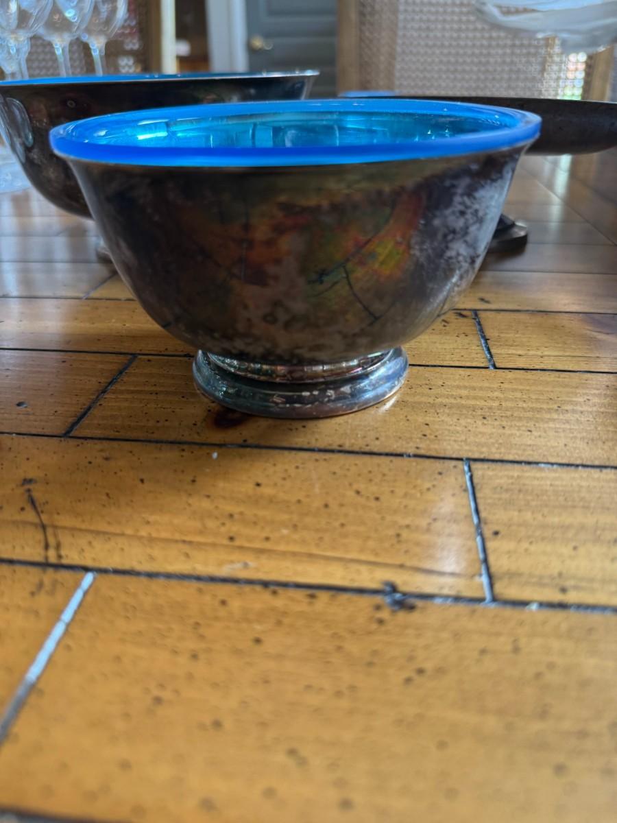 Striking set of three mid-century silver-toned footed bowls with vibrant blue glass interiors. Unique accent bowls or serving pieces.