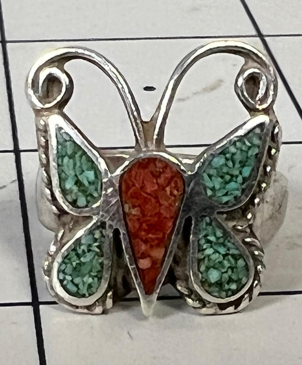 Silver Butterfly Ring, Turquoise and Coral