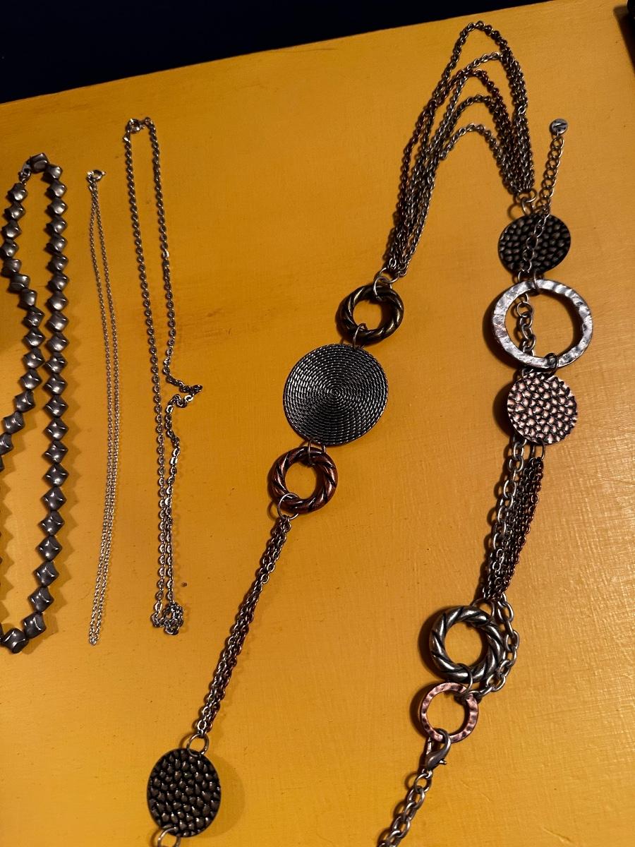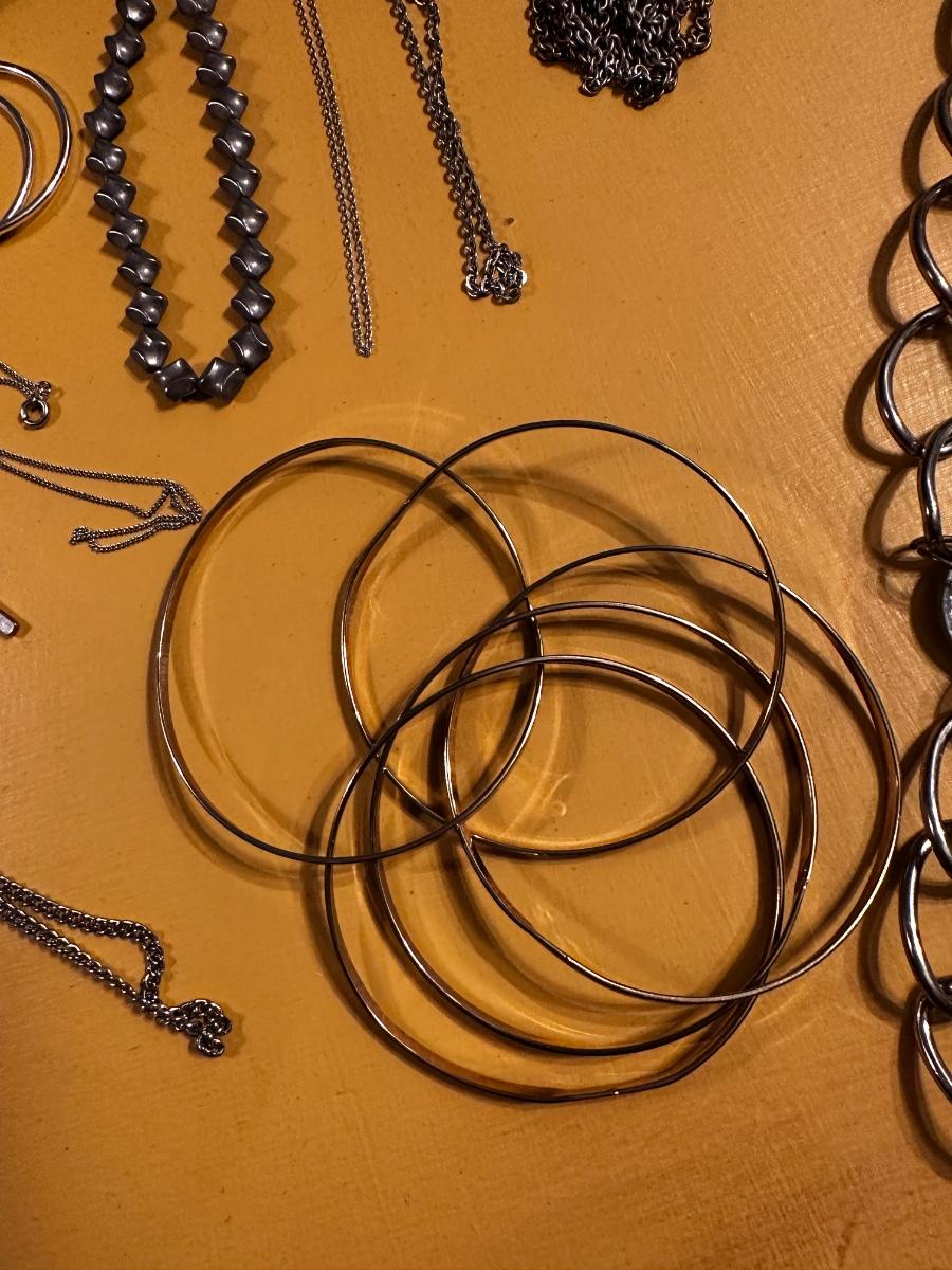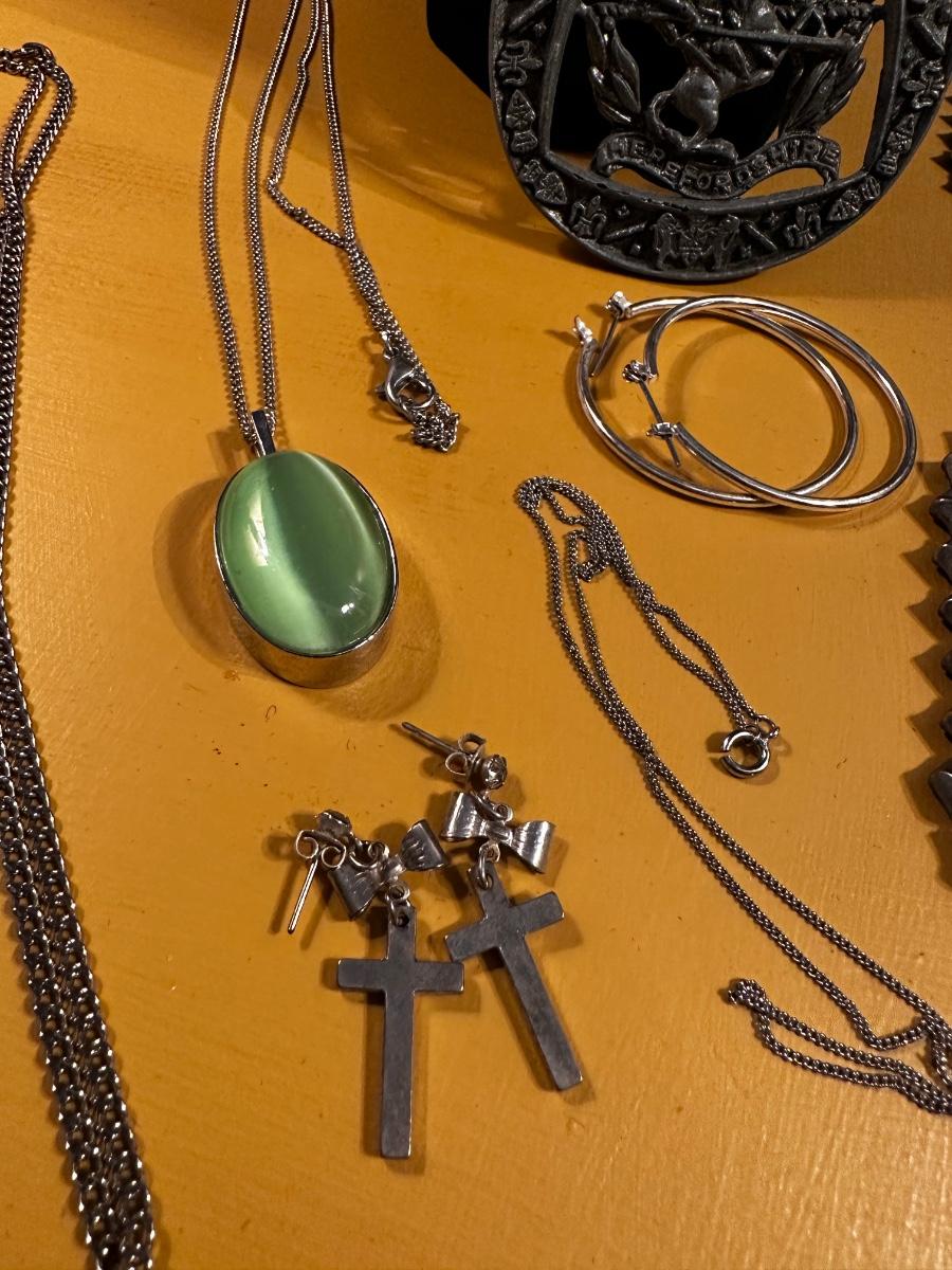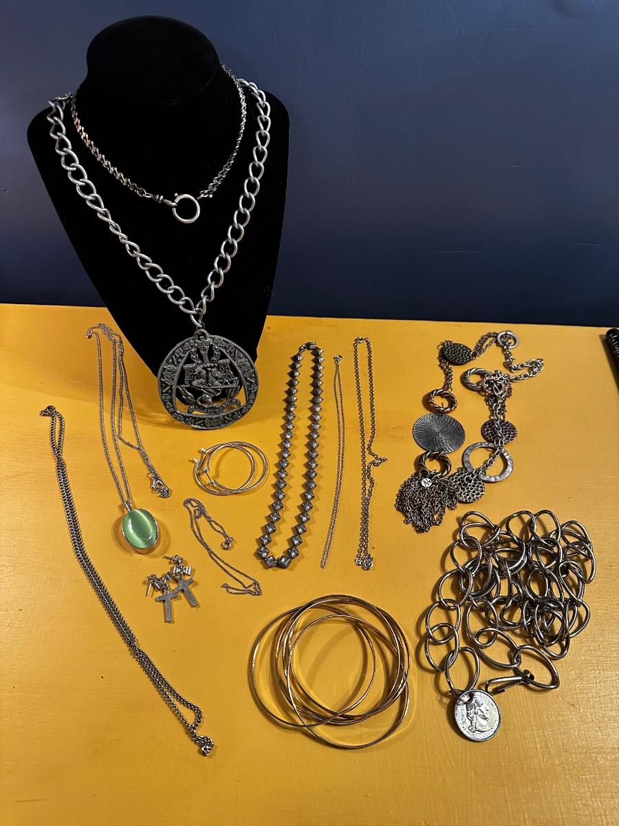 A few different pieces in here, including a beautiful green stone on a long silver chain, bracelets and a heavy ornamental piece sure to strike up discussion.