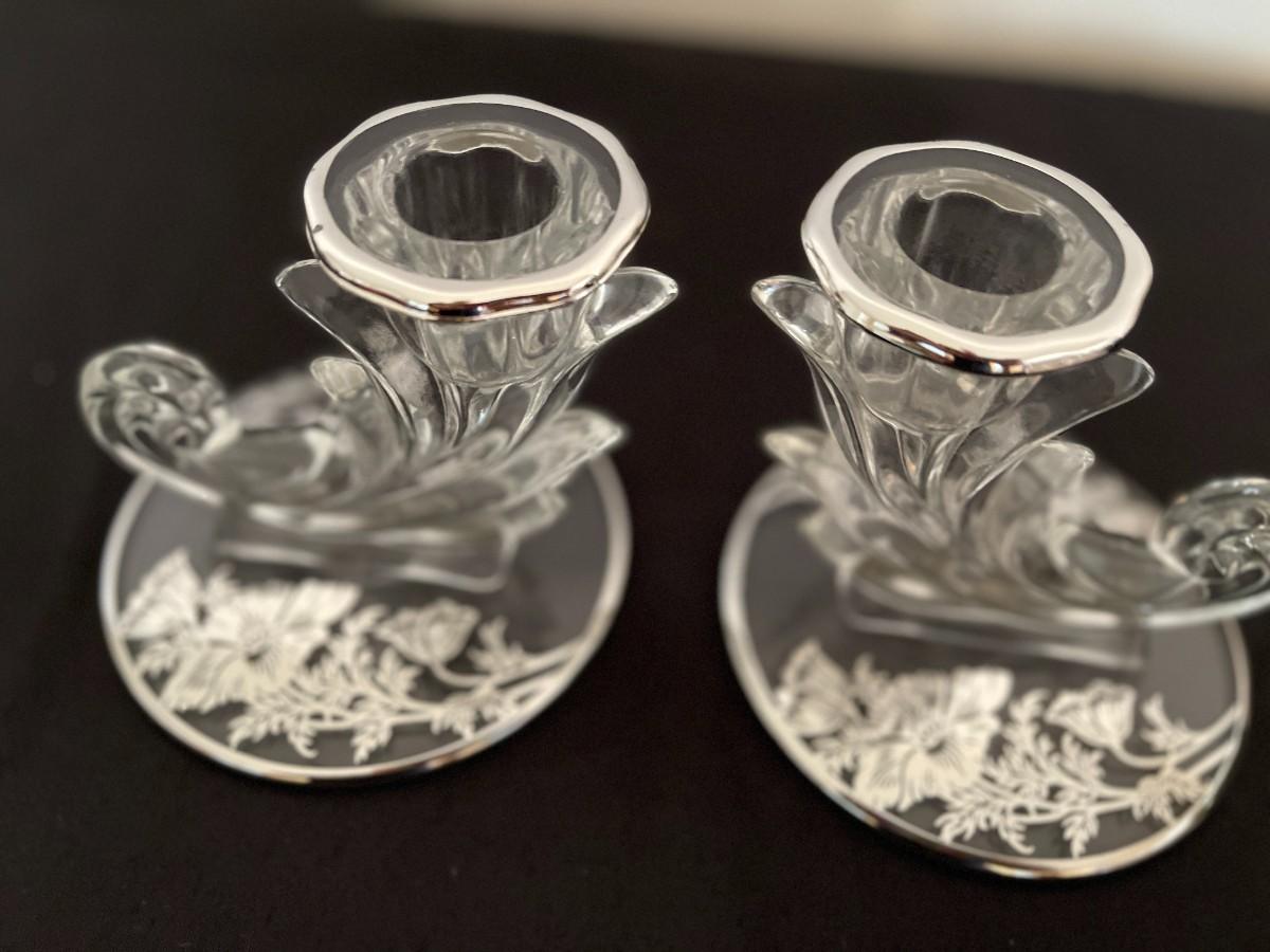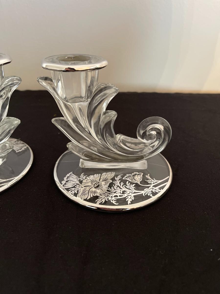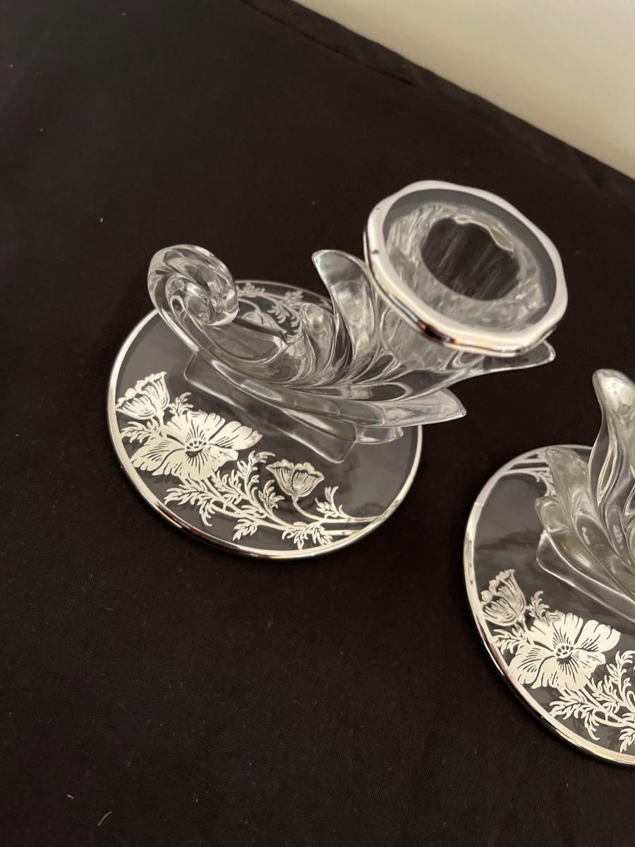 Lovely pair of crystal candlesticks or candleholders in Silver City's "Flanders Poppy" pattern from the mid-20th century. Crystal candleholders were popular from the 1930s through the mid part of the 1900s. A lovely set which provides more sparkle courtesy of the silver poppy motif on the base. 3.5" H x 4" W at base. # 1013