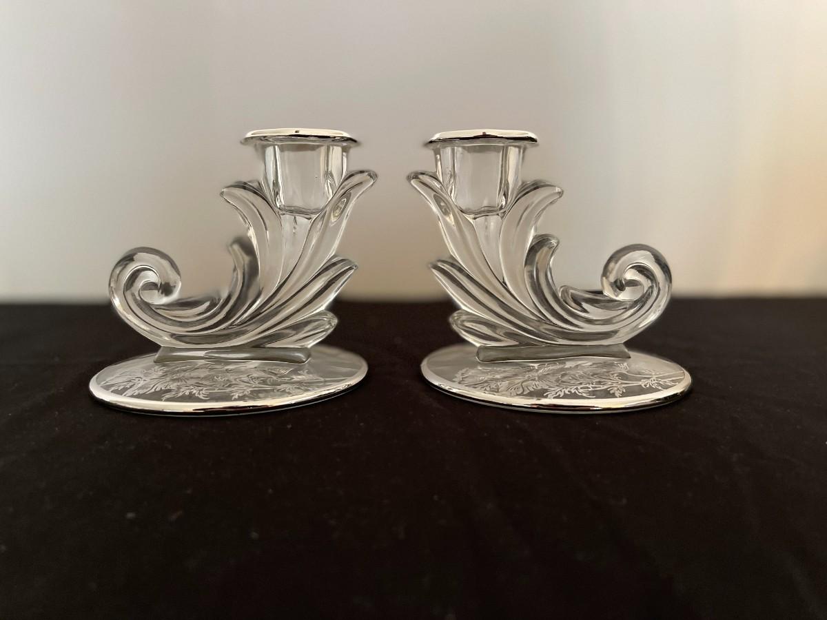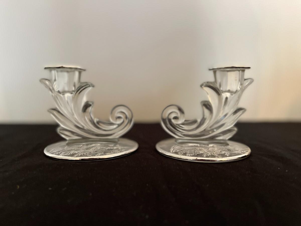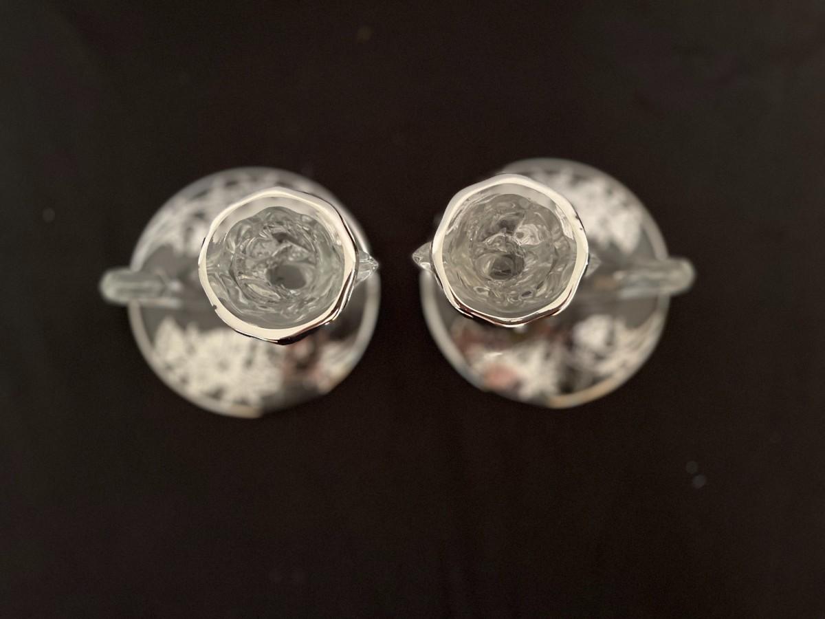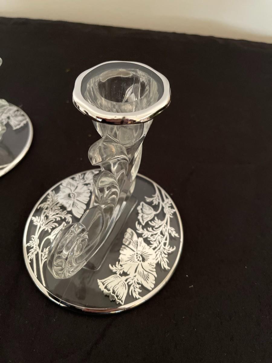 Lovely pair of crystal candlesticks or candleholders in Silver City's "Flanders Poppy" pattern from the mid-20th century. Crystal candleholders were popular from the 1930s through the mid part of the 1900s. A lovely set which provides more sparkle courtesy of the silver poppy motif on the base. 3.5" H x 4" W at base. # 1013