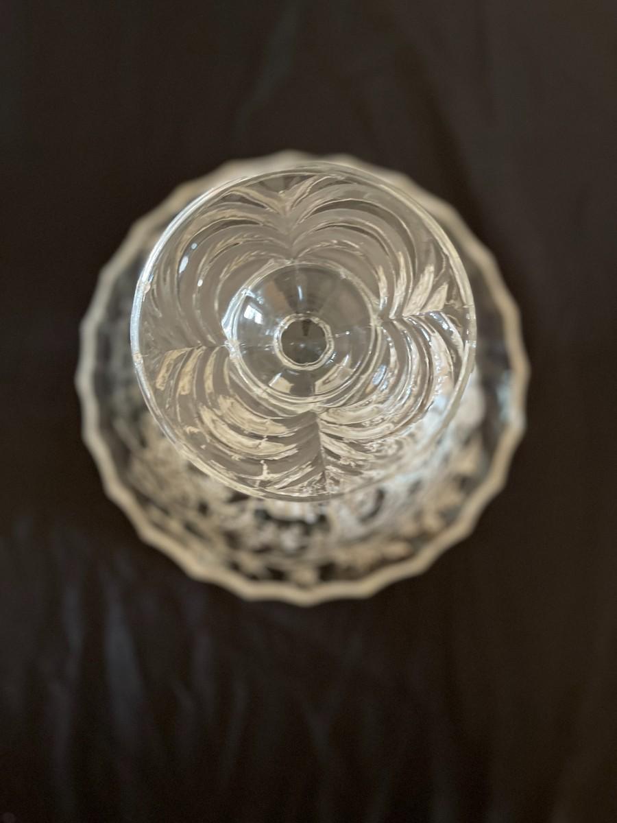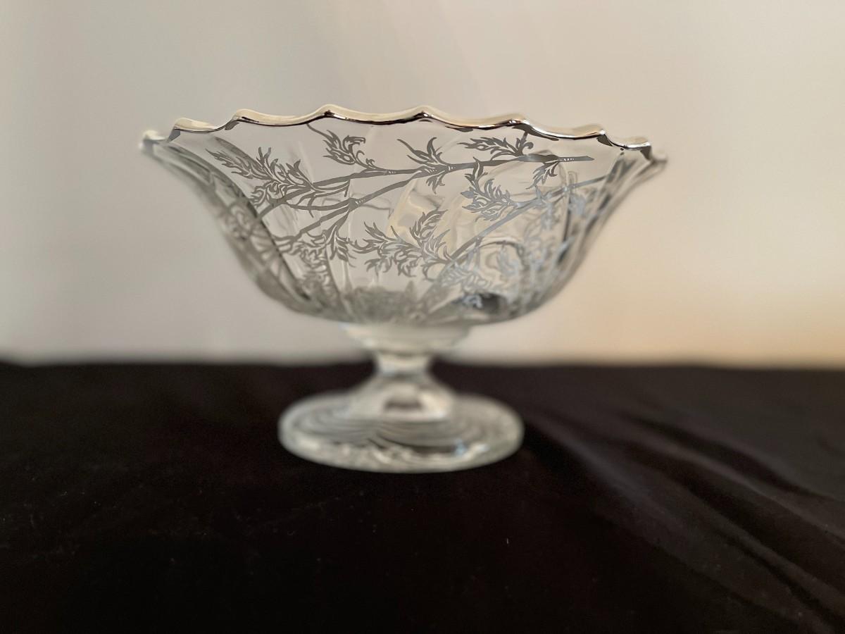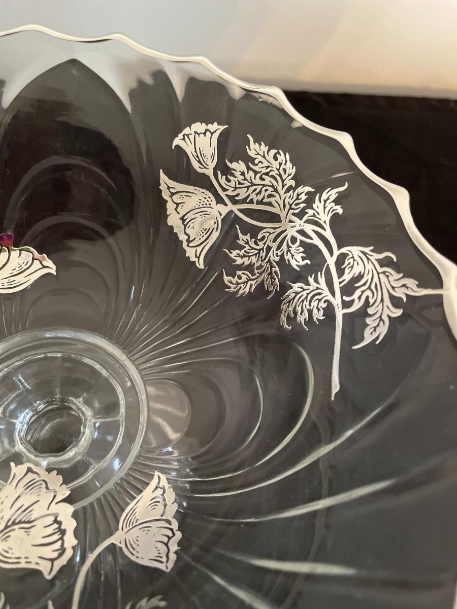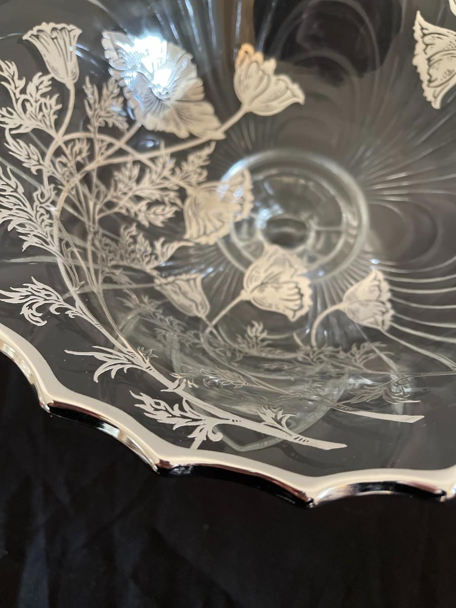 Perfect for display or serving olives, bon-bons, etc. this is a charming mid-century design by Silver City. It features silver sprays of poppies overlayed on the crystal in the Flanders Poppy pattern. Excellent condition. See other pieces from this collection in our online store. 9" W x 5" H. # 1011