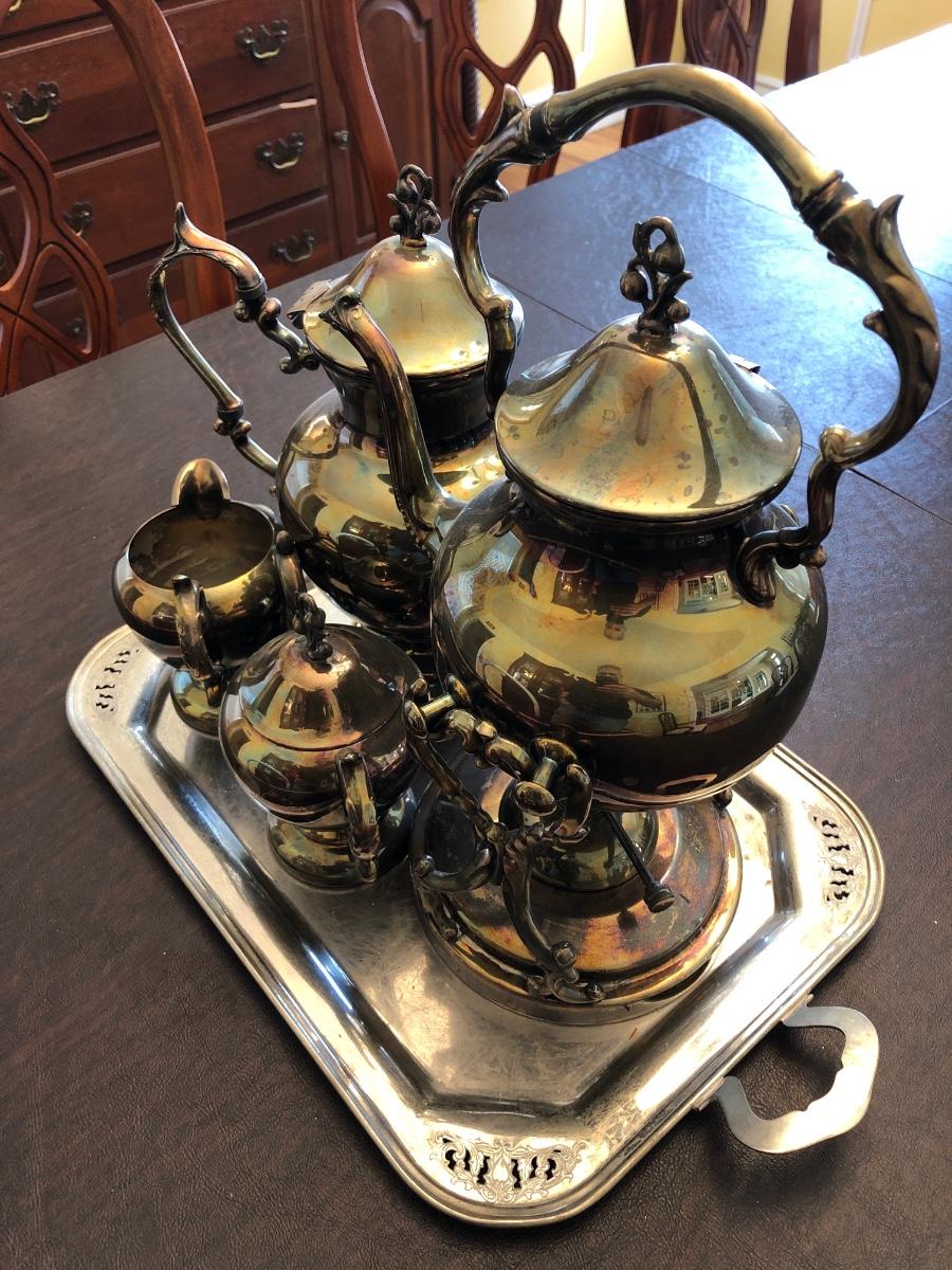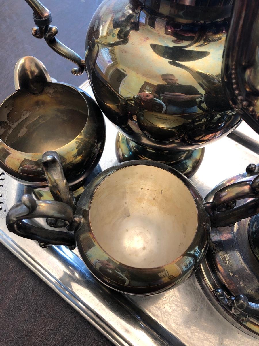 Six-piece, silver/silver plate, decorative coffee and tea service. See pictures.